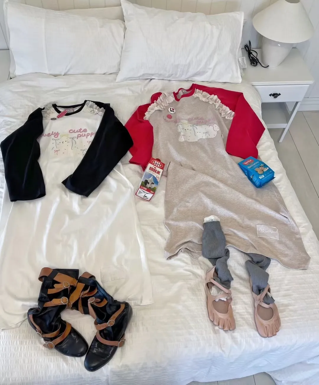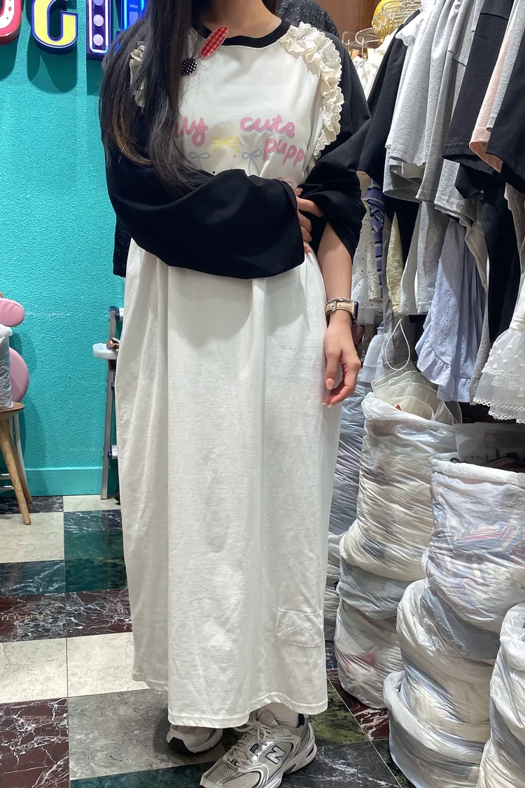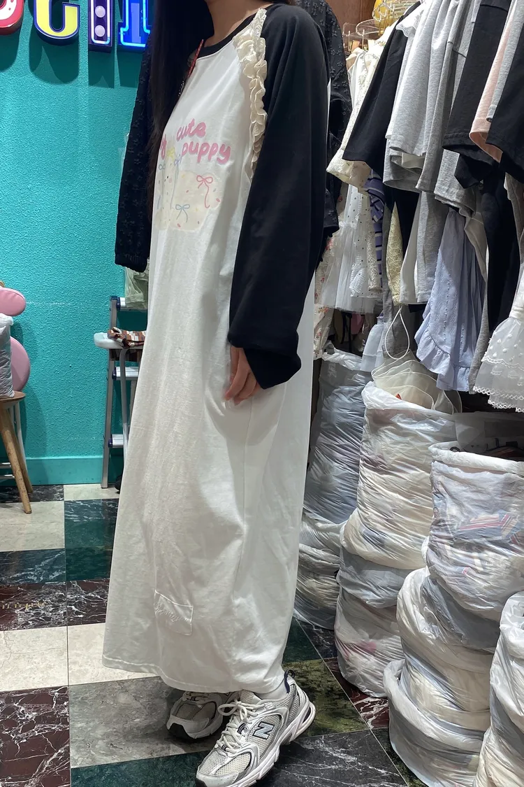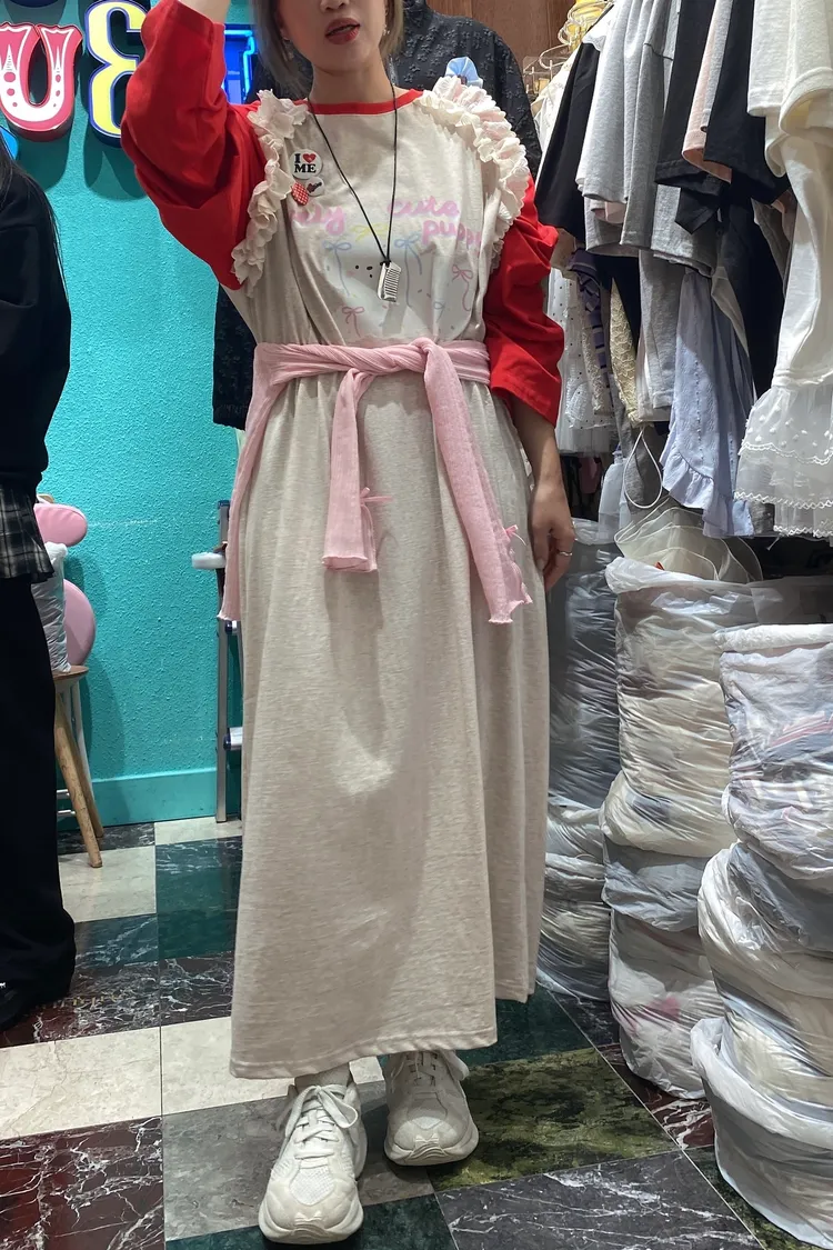 超萌又實穿,柔軟棉料材質,寬鬆版型,S-XL妞都可以穿 前面印上萌萌狗狗圖案,療癒感滿分! 立體抓褶蕾絲拼接撞色手袖、背面有開衩好走動 單穿是慵懶FU,建議搭配披肩或薄棉T綁腰間整體更有造型感 隨便穿都像韓系街拍小仙女 韓國熱銷色是紅艾蜜160公分穿到腳踝小幫手166公分穿到腳踝