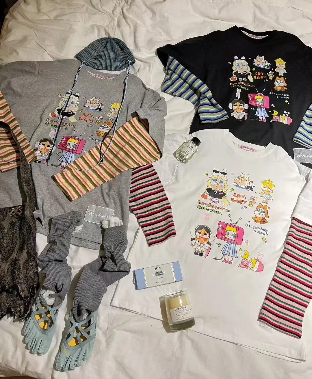 根本是可愛感炸裂的韓系棉T! 棉料材質、假兩件拼接多彩條紋針織手袖,像偷偷加了彩虹小外套 再配上超紅的哭娃&茉莉公仔印花,可愛度直接破表! 寬鬆蓋臀版型,S-XL妞都可以穿,穿起來都超顯瘦又舒服~ 隨便穿都像把漫畫穿上身,一秒變身俏皮少女💖