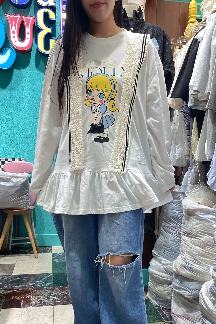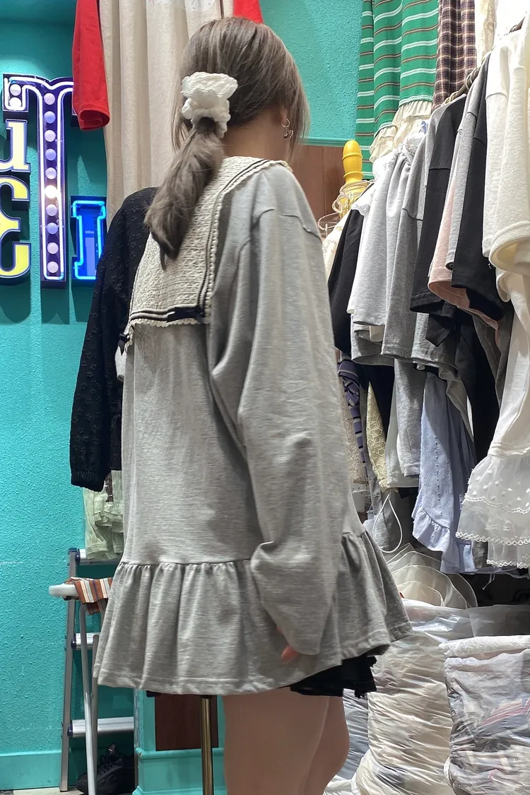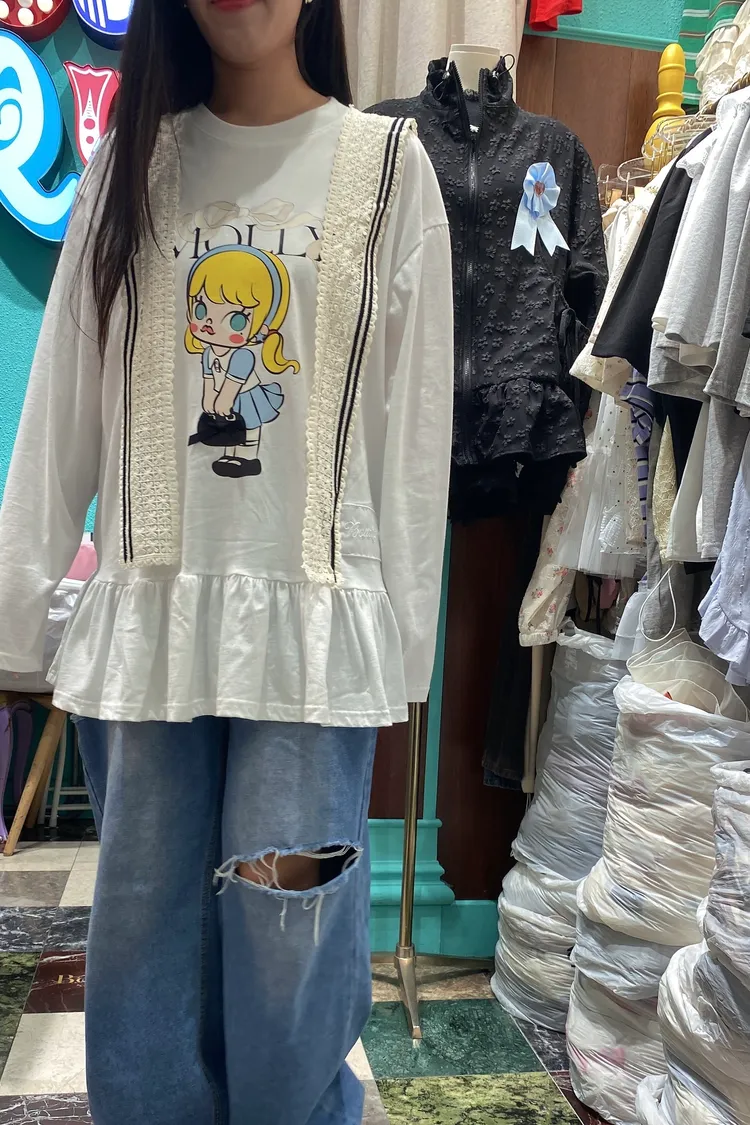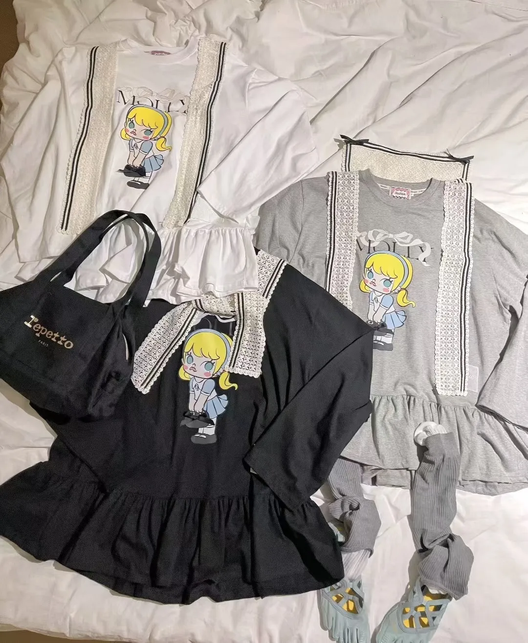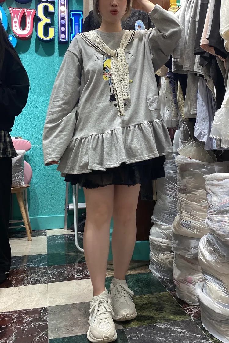 棉料材質,寬鬆傘狀小裙擺設計拉長比例,S-XL妞都可以穿出可愛感 胸前茉莉娃印花萌度破表,再加上車縫住不可拆的鏤空蕾絲海軍領披肩甜美感直接拉滿~ 嬌小妞內搭短褲就是下身失蹤LOOK,一穿就像韓劇女主角出門約會 韓國熱銷色是灰艾蜜160公分穿到蓋臀小幫手166公分穿到蓋臀