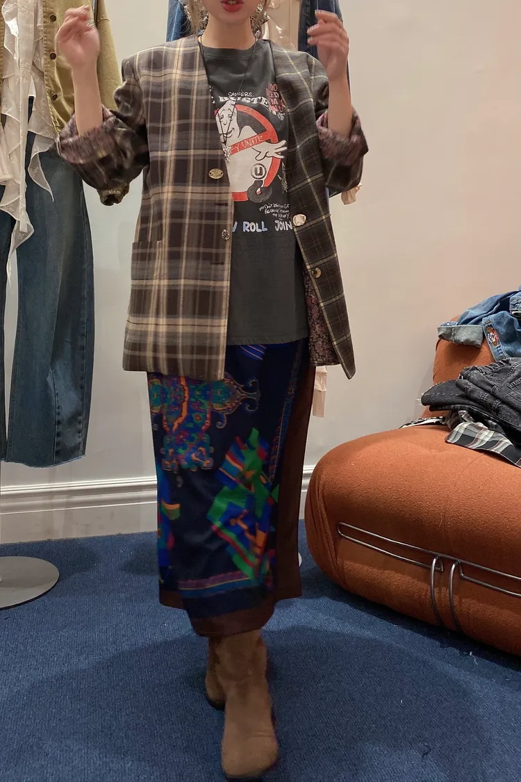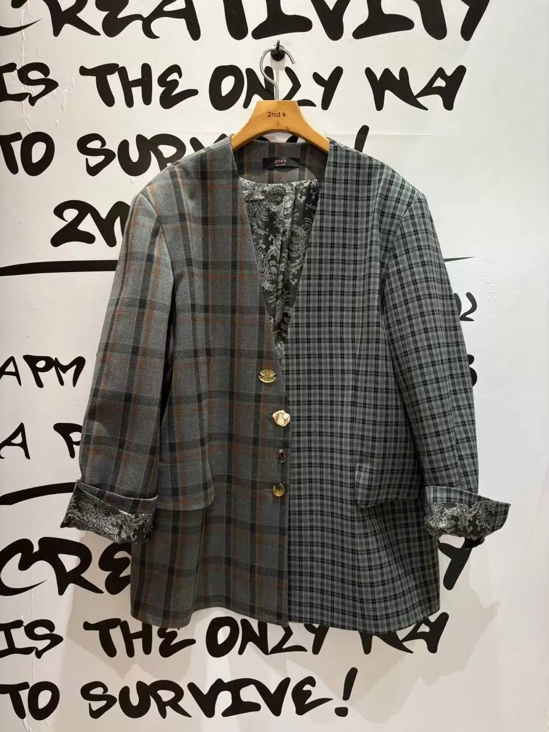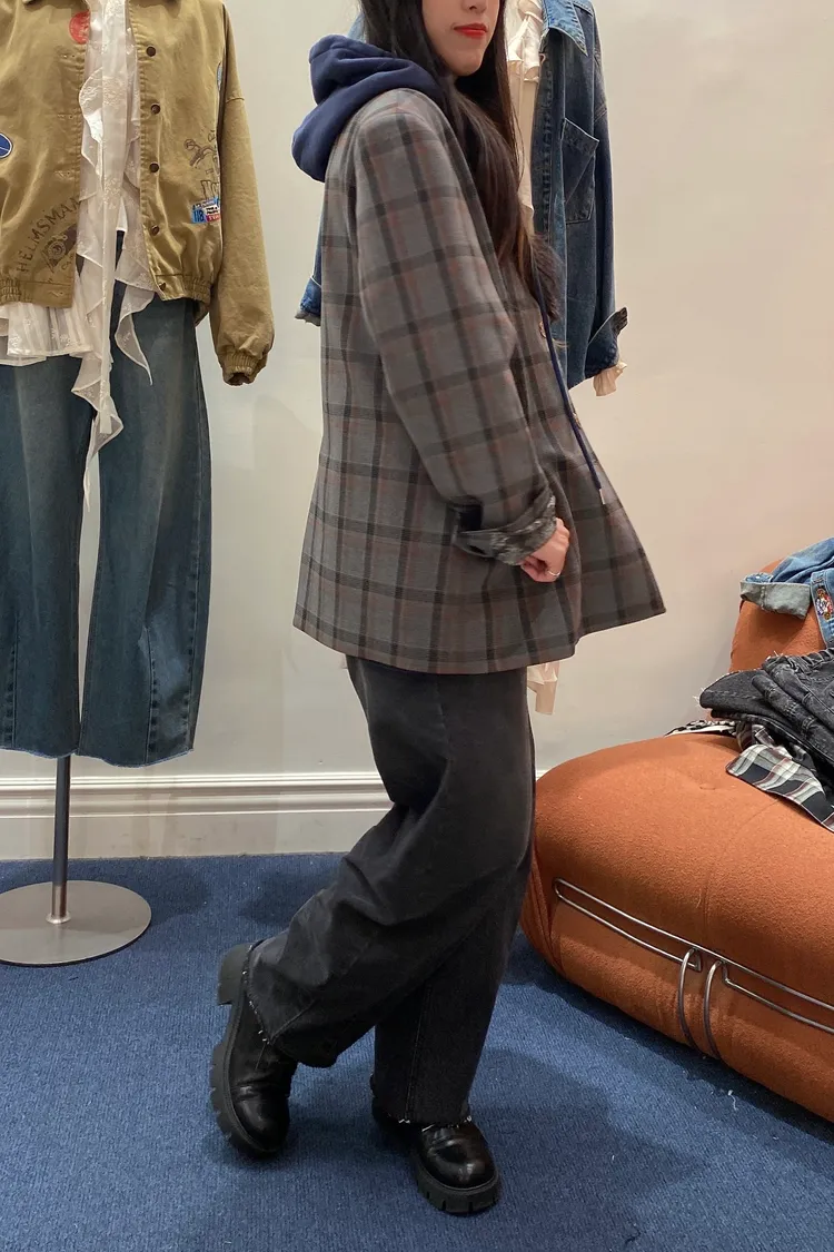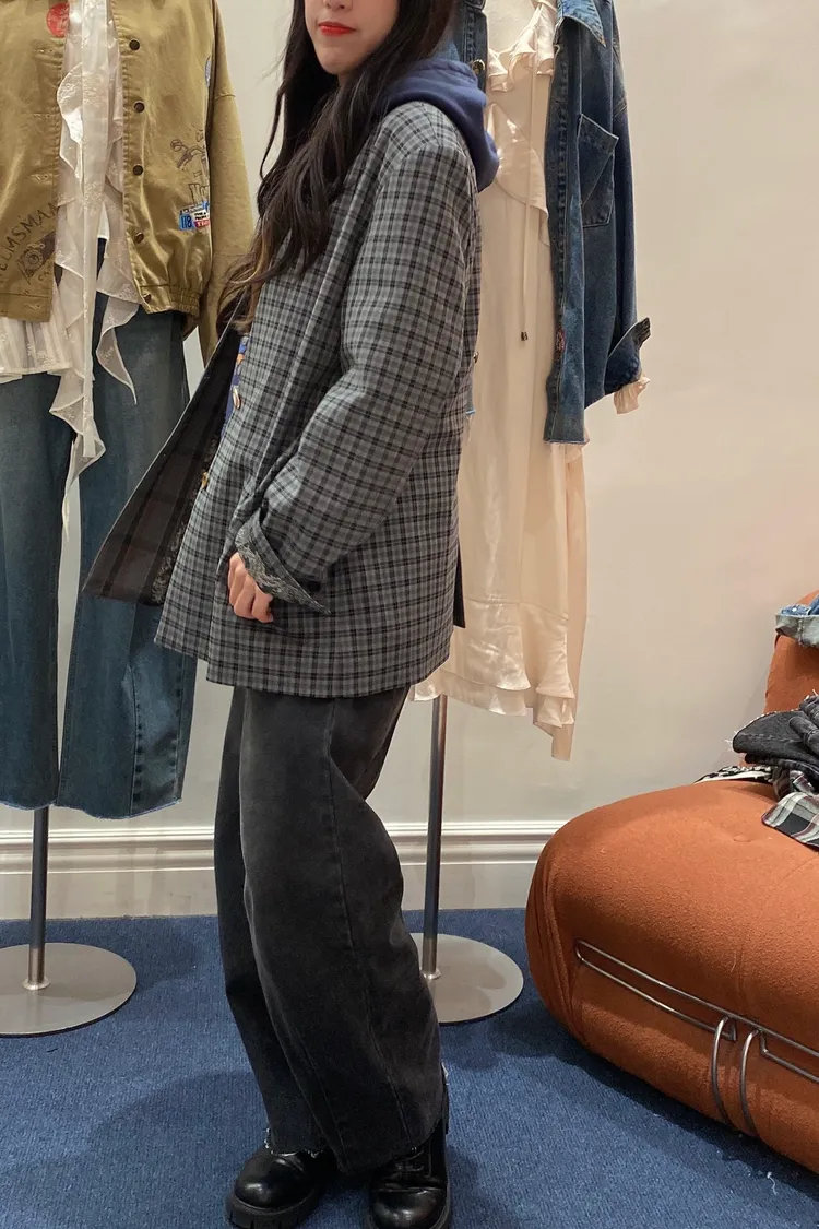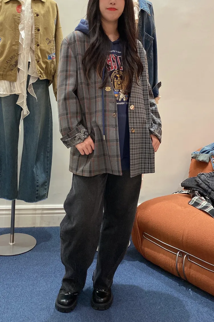 不對稱格紋聚脂纖維面料拼接,增添視覺層次感無領西外寬鬆蓋臀版型 S-XL妞都可以穿 內襯是滑溜溜印花面料,手袖反摺露出特別好看 扣子也是亮點,每顆都不一樣,其中一顆還是小時鐘超可愛! 單穿或疊搭都能輕鬆穿出俏皮又優雅的小仙女氛圍 有口袋