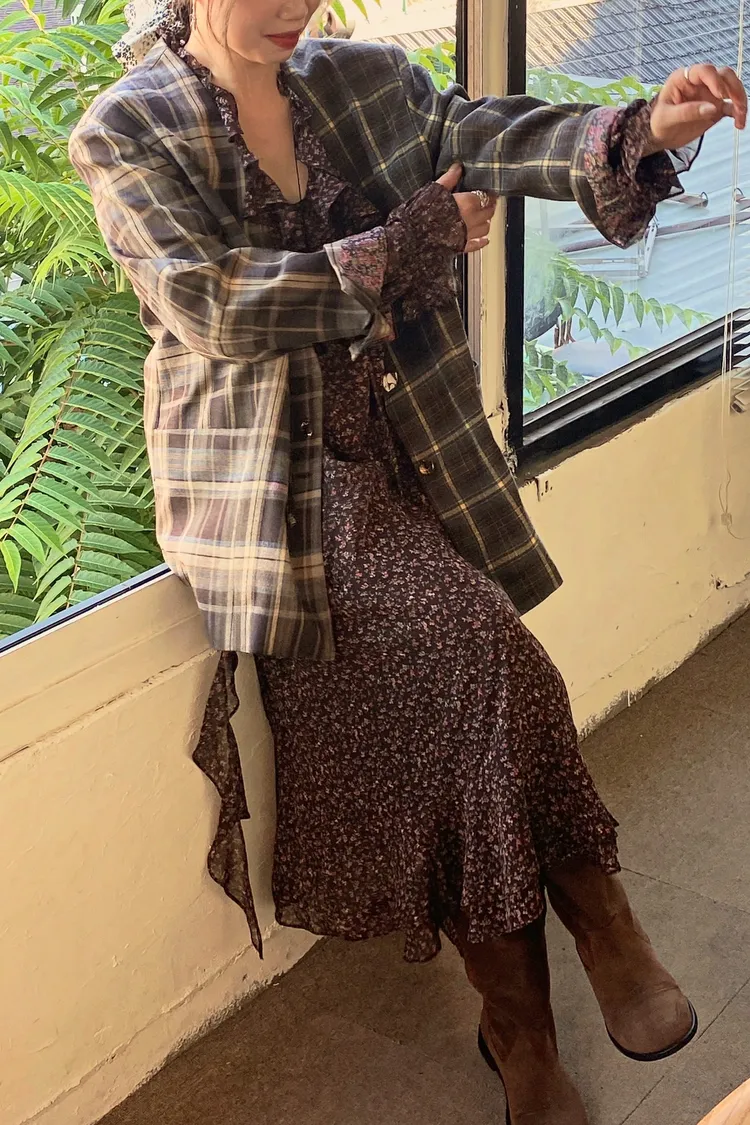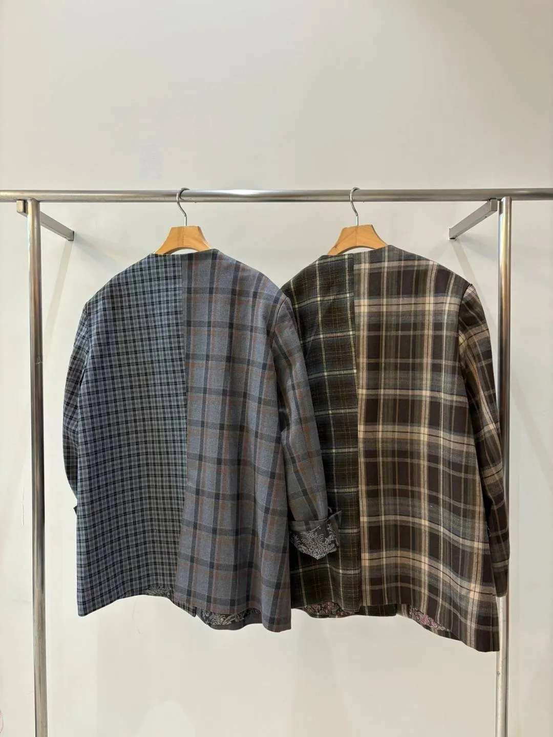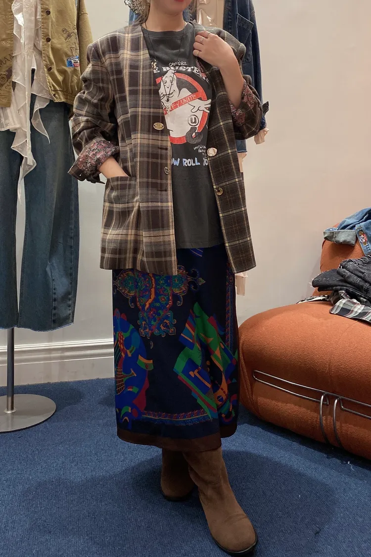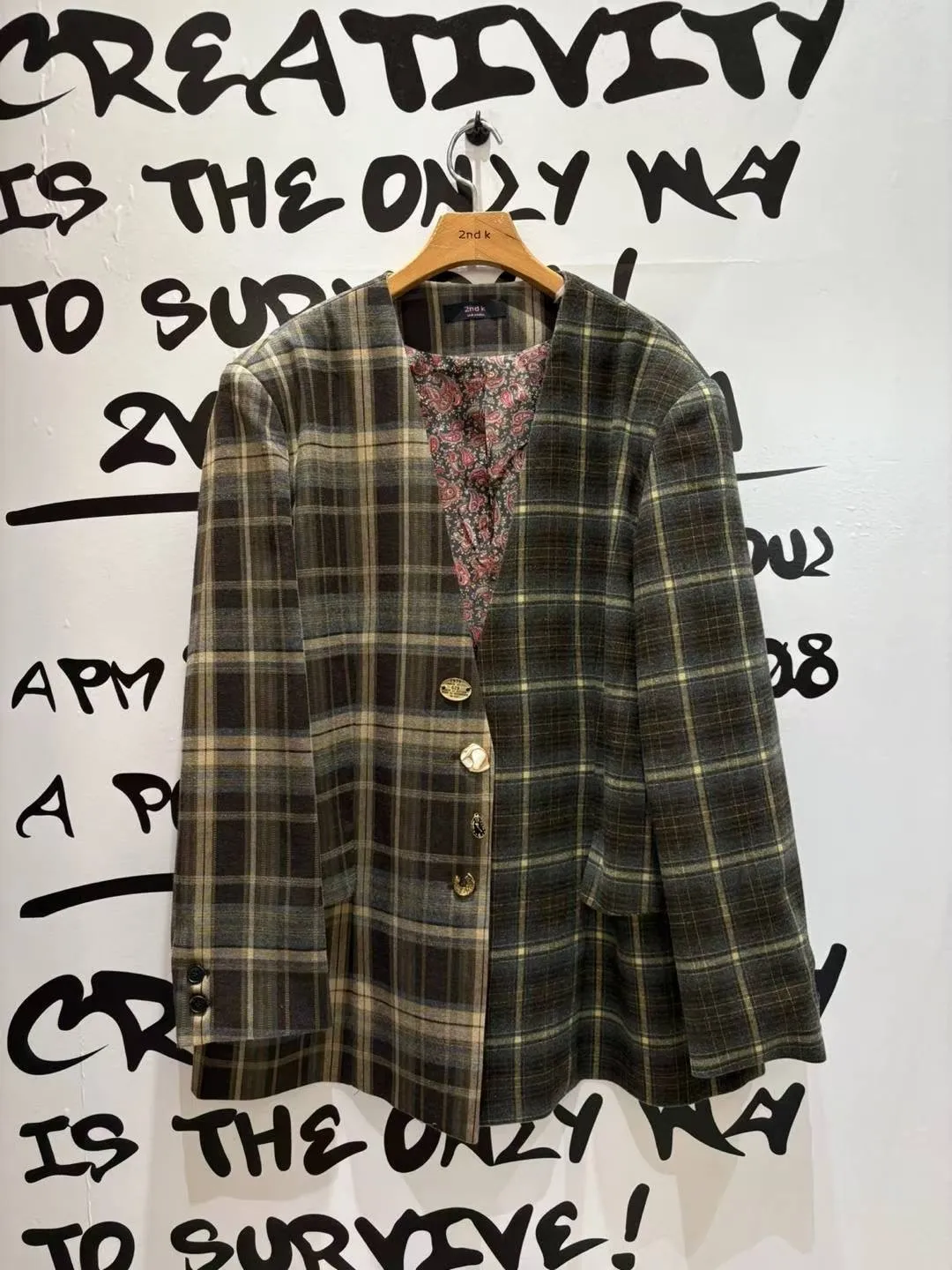不對稱格紋聚脂纖維面料拼接,增添視覺層次感無領西外寬鬆蓋臀版型 S-XL妞都可以穿 內襯是滑溜溜印花面料,手袖反摺露出特別好看 扣子也是亮點,每顆都不一樣,其中一顆還是小時鐘超可愛! 單穿或疊搭都能輕鬆穿出俏皮又優雅的小仙女氛圍 有口袋