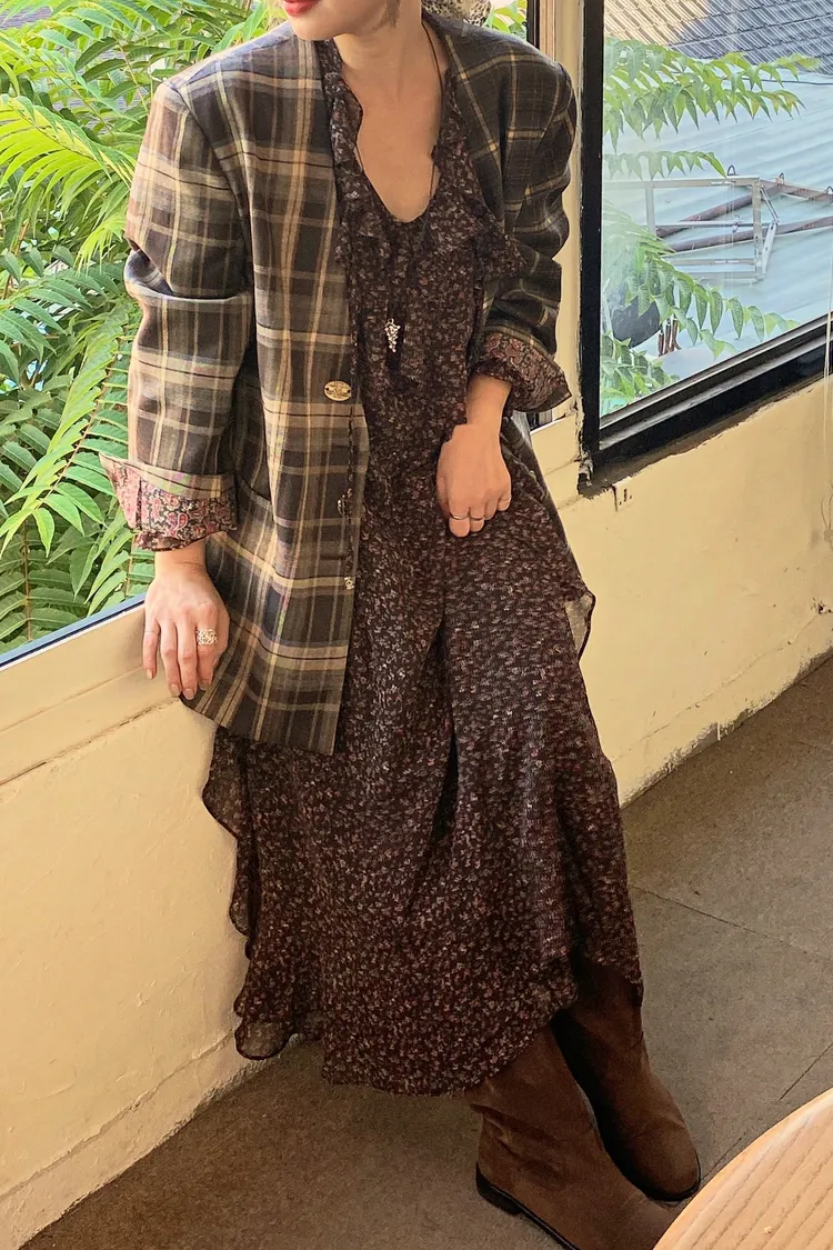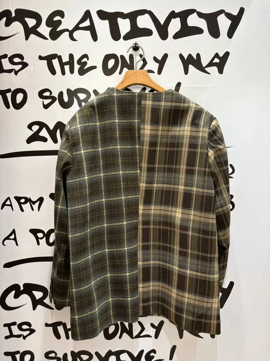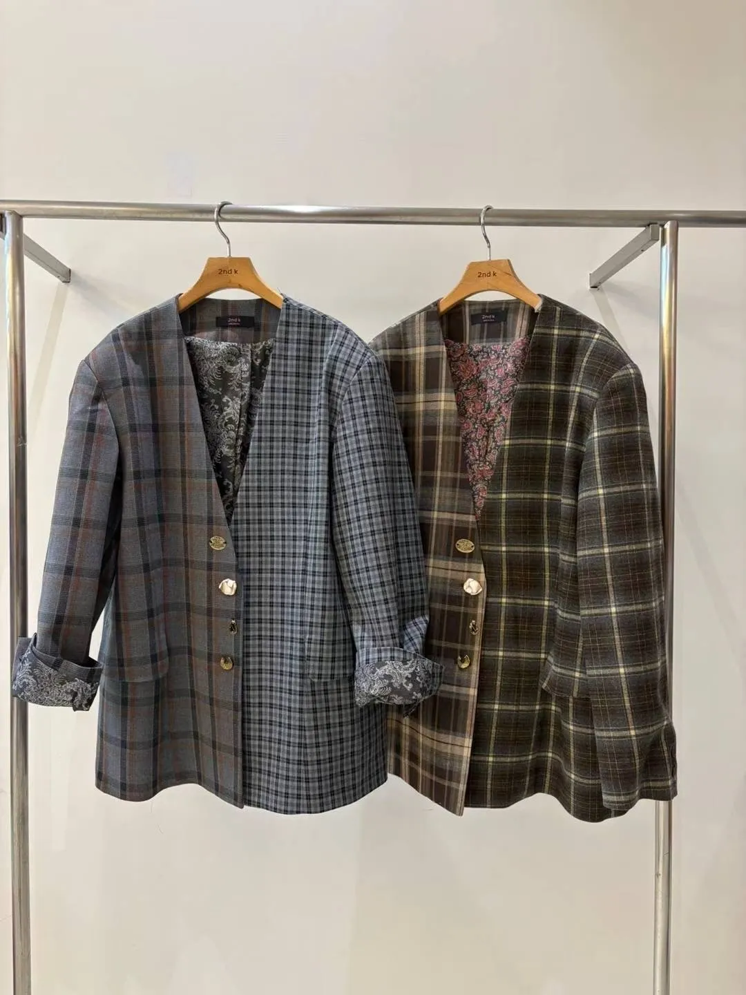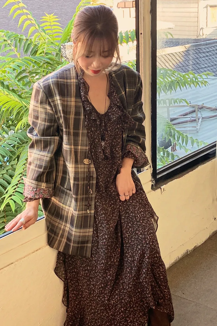 不對稱格紋聚脂纖維面料拼接,增添視覺層次感無領西外寬鬆蓋臀版型 S-XL妞都可以穿 內襯是滑溜溜印花面料,手袖反摺露出特別好看 扣子也是亮點,每顆都不一樣,其中一顆還是小時鐘超可愛! 單穿或疊搭都能輕鬆穿出俏皮又優雅的小仙女氛圍 有口袋