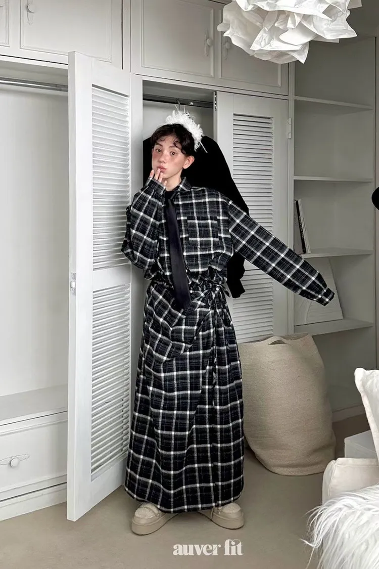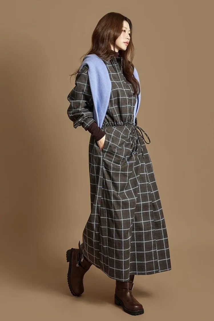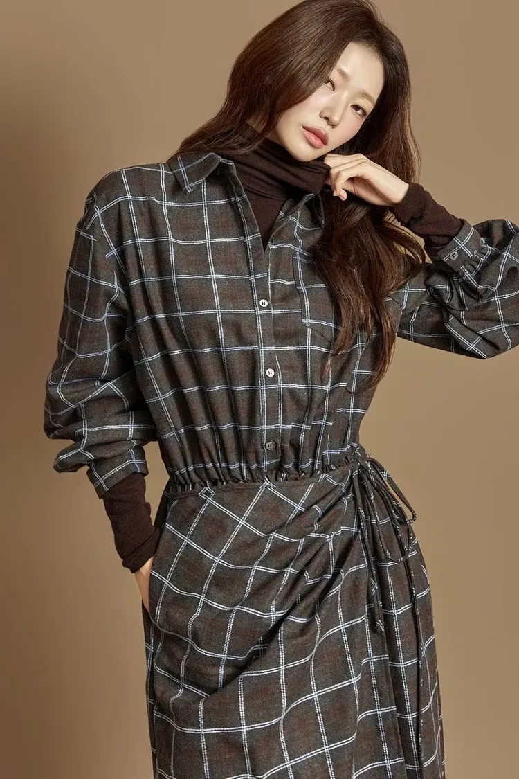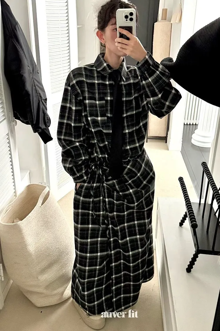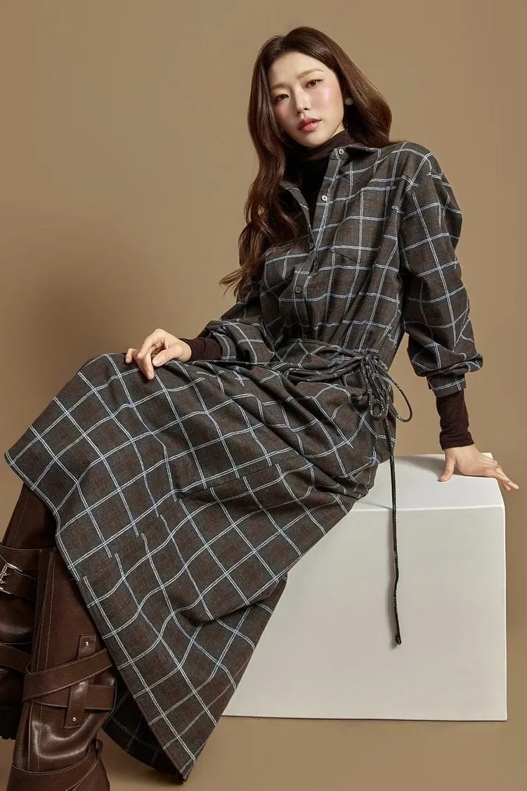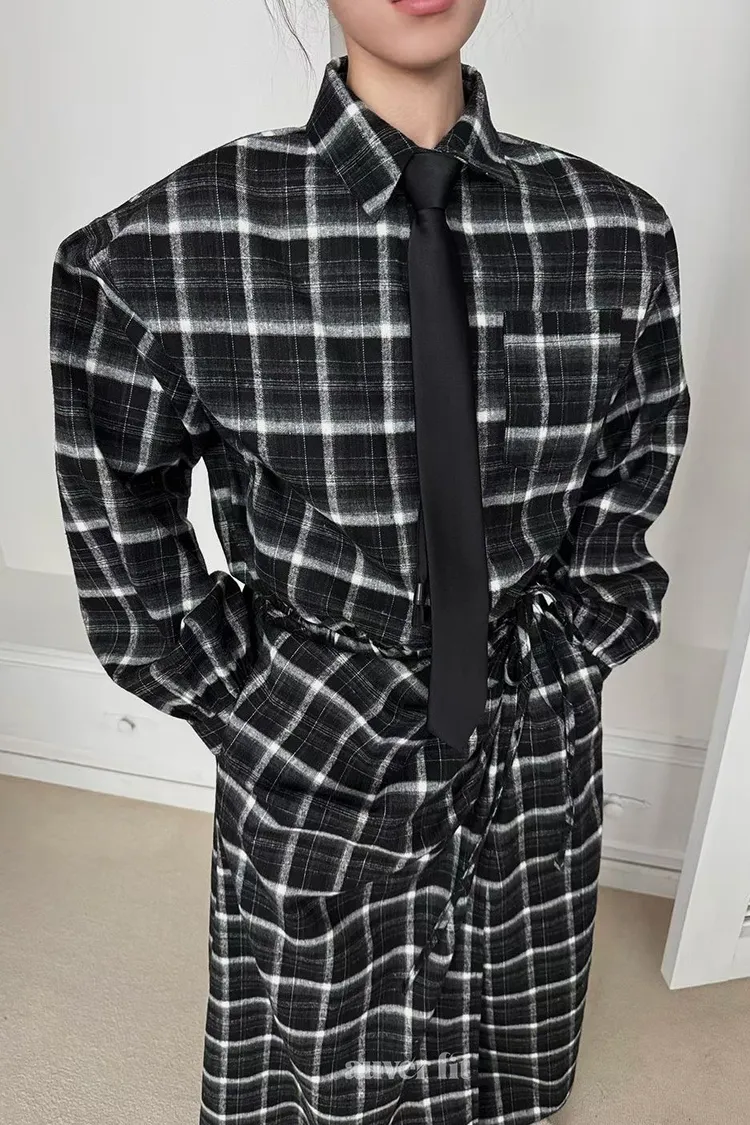 DCD03格紋午後磨毛棉造型綁帶襯衫洋