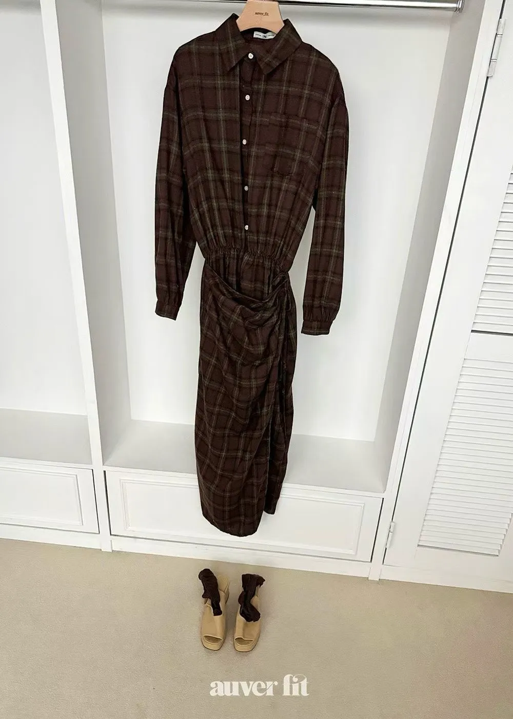 襯衫式長版剪裁帶點知性氣質,前側多拼接了一片造型綁帶裙擺