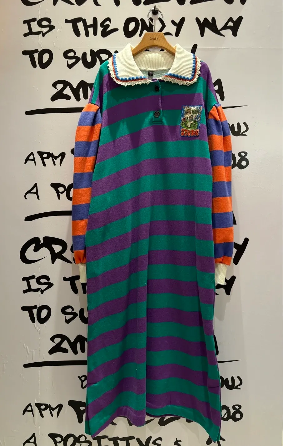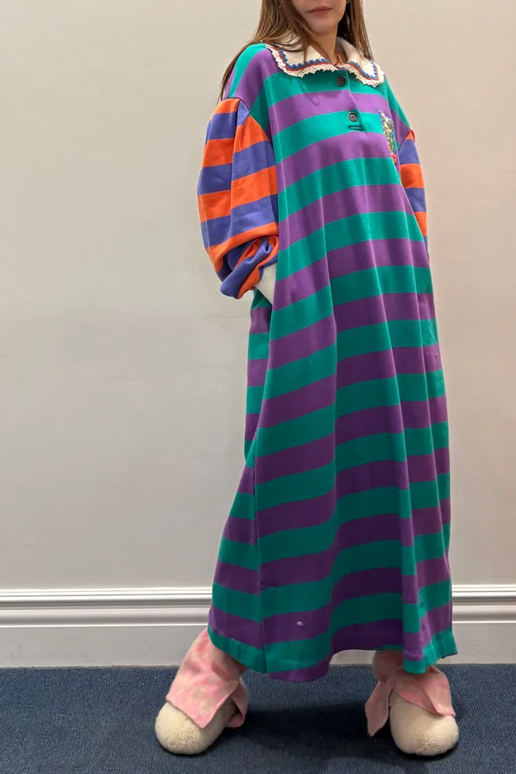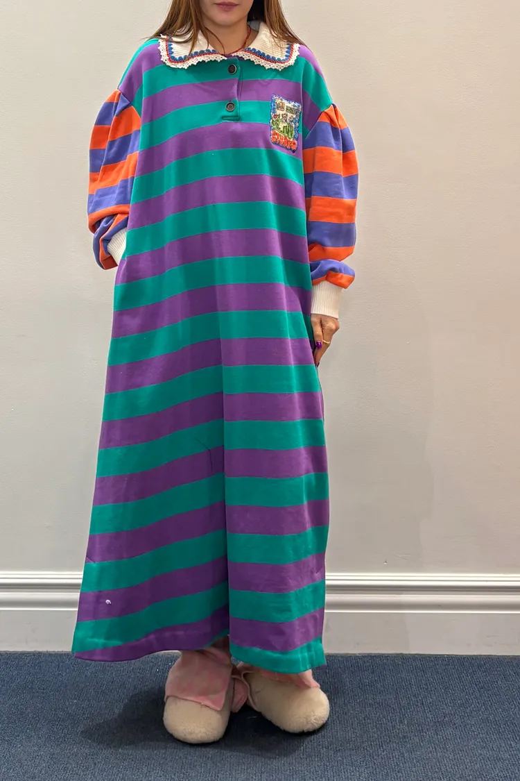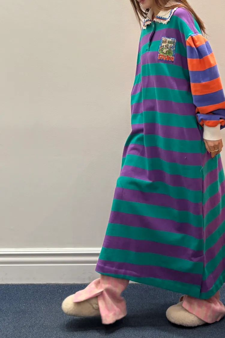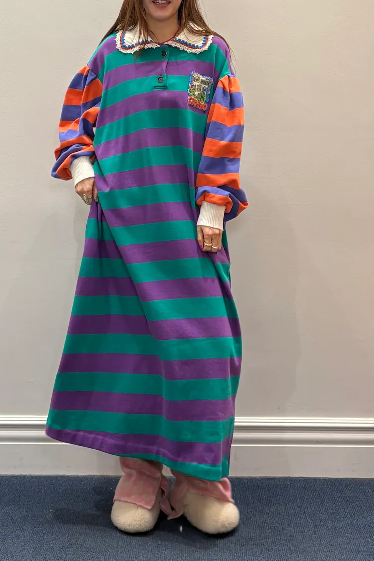 一穿上就有「好可愛但不幼稚」的那種魔法 撞色拼接棉料材質舒服又有型、落肩寬鬆版型,S-XL妞都可以穿 橫條紋搭配身體與手袖不同色的設計,自帶層次感,怎麼看都不無聊 坑條翻領拼接蕾絲多了一點甜甜的學院氣息 胸前可愛的圖案布章是近看會被發現的小亮點 POLO衫式連身洋休閒中帶點乖巧感 有口袋 韓國熱銷色是藍綠袖