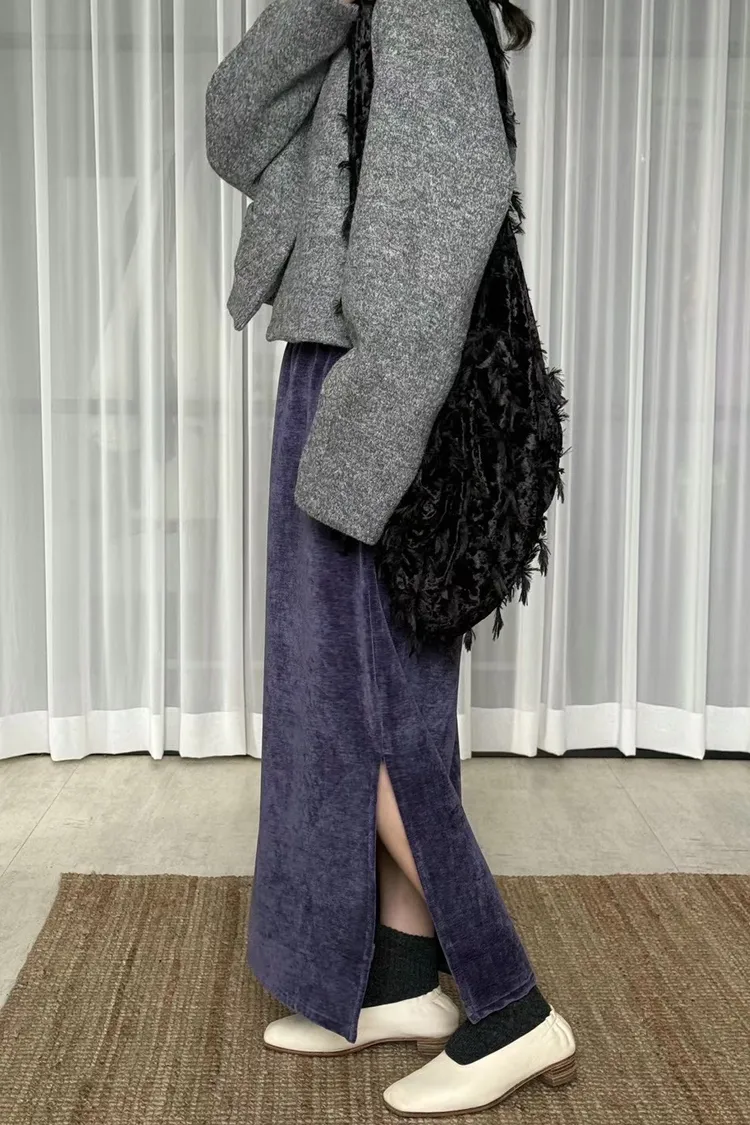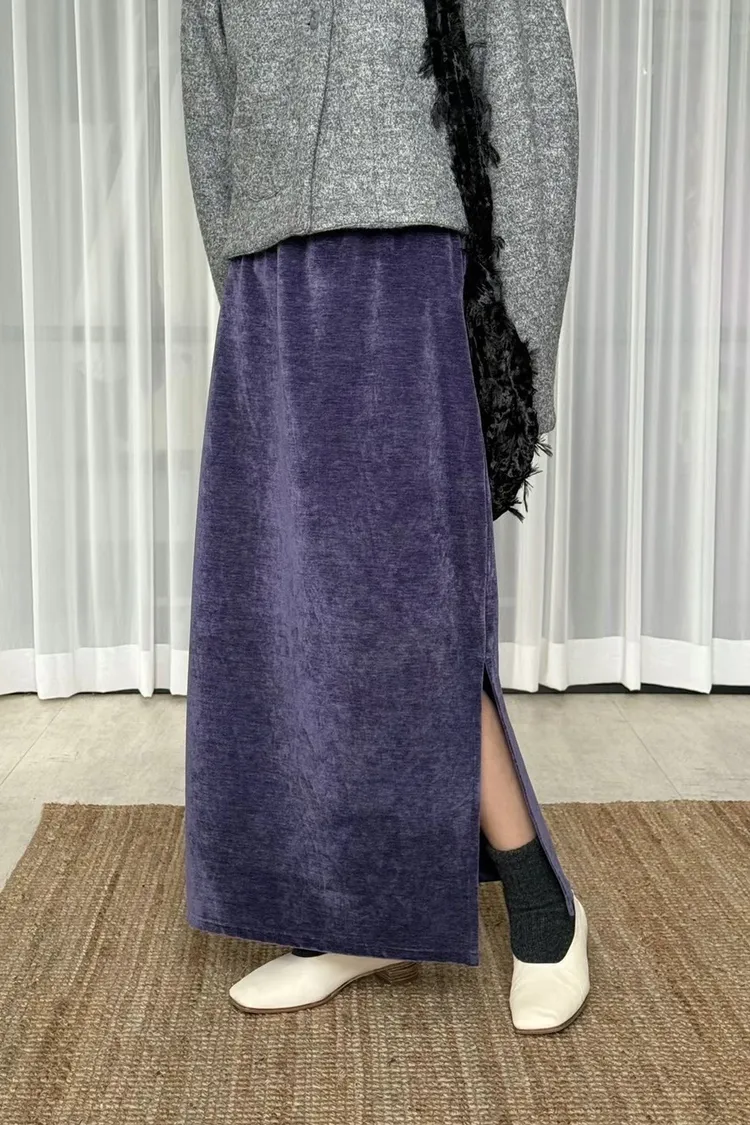 絲絨面料自帶細緻光澤感,低調閃著高級氣息,穿上瞬間提升整體質感 A字版型修飾腰臀線條,兩側開衩讓步伐更輕盈,也多了若隱若現的小女人味 隨便搭件毛衣或外套就很好看 是秋冬衣櫥裡那件怎麼穿都不出錯的質感裙款 腰彈性鬆緊