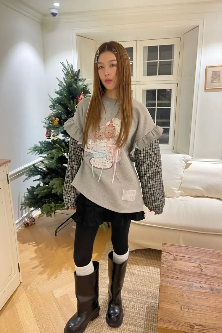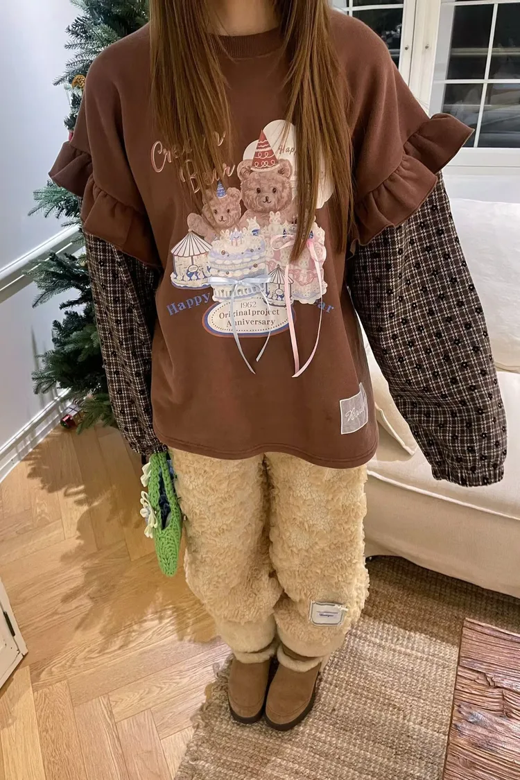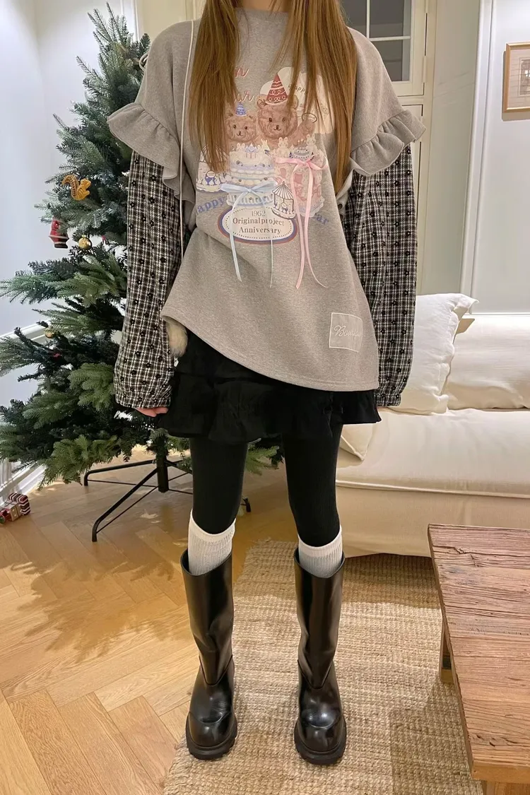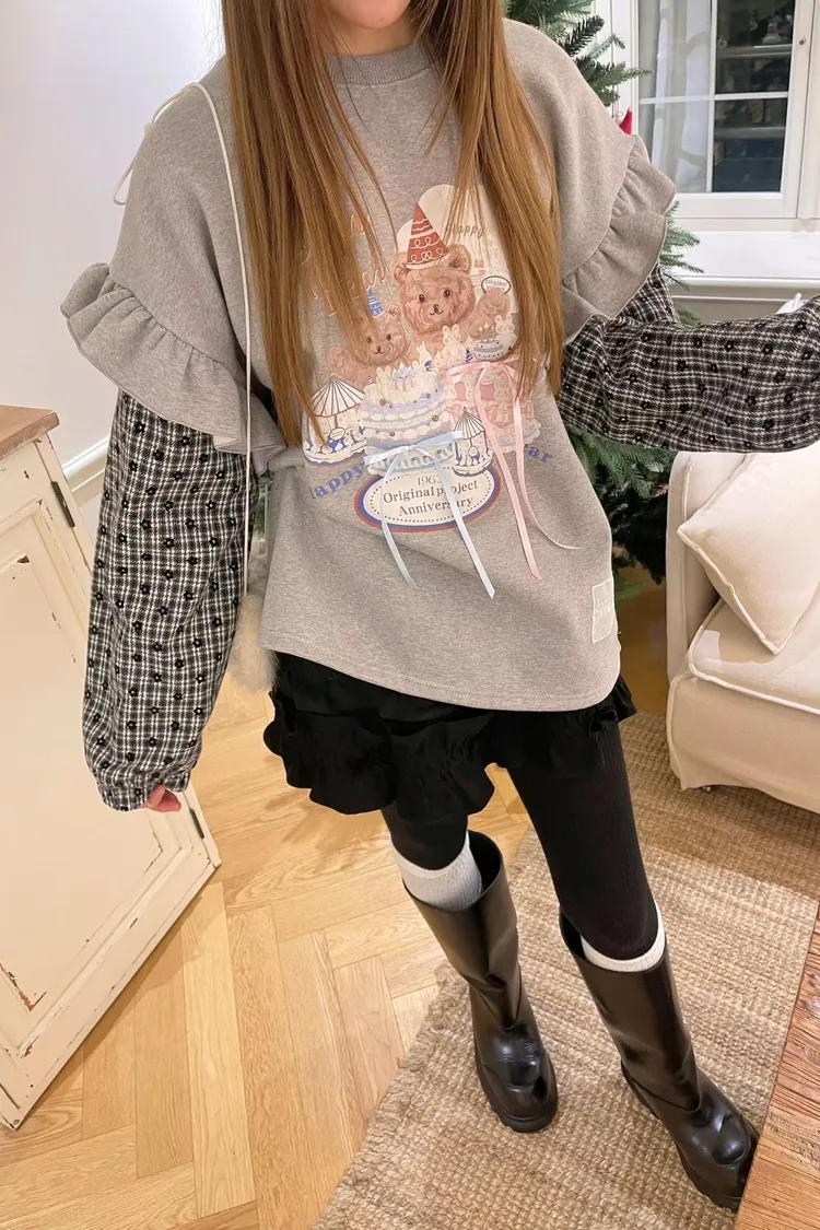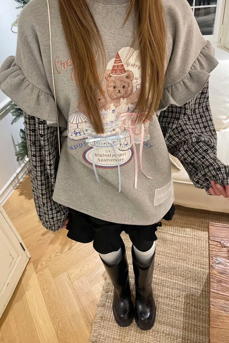 內裡加絨棉料材質拼接格紋毛料手袖,假兩件設計,質感直接升級 格紋裡還藏了小花圖案,甜得很細膩 袖子拼接處再加上波浪花邊設計,整件看起來立體又有層次 正面的小熊生日派對印花真的太犯規,還搭配立體緞帶蝴蝶結裝飾 可愛到不行卻完全不幼稚,是那種很有「高級童趣感」的可愛 落肩寬鬆版型,S-XL妞都可以穿