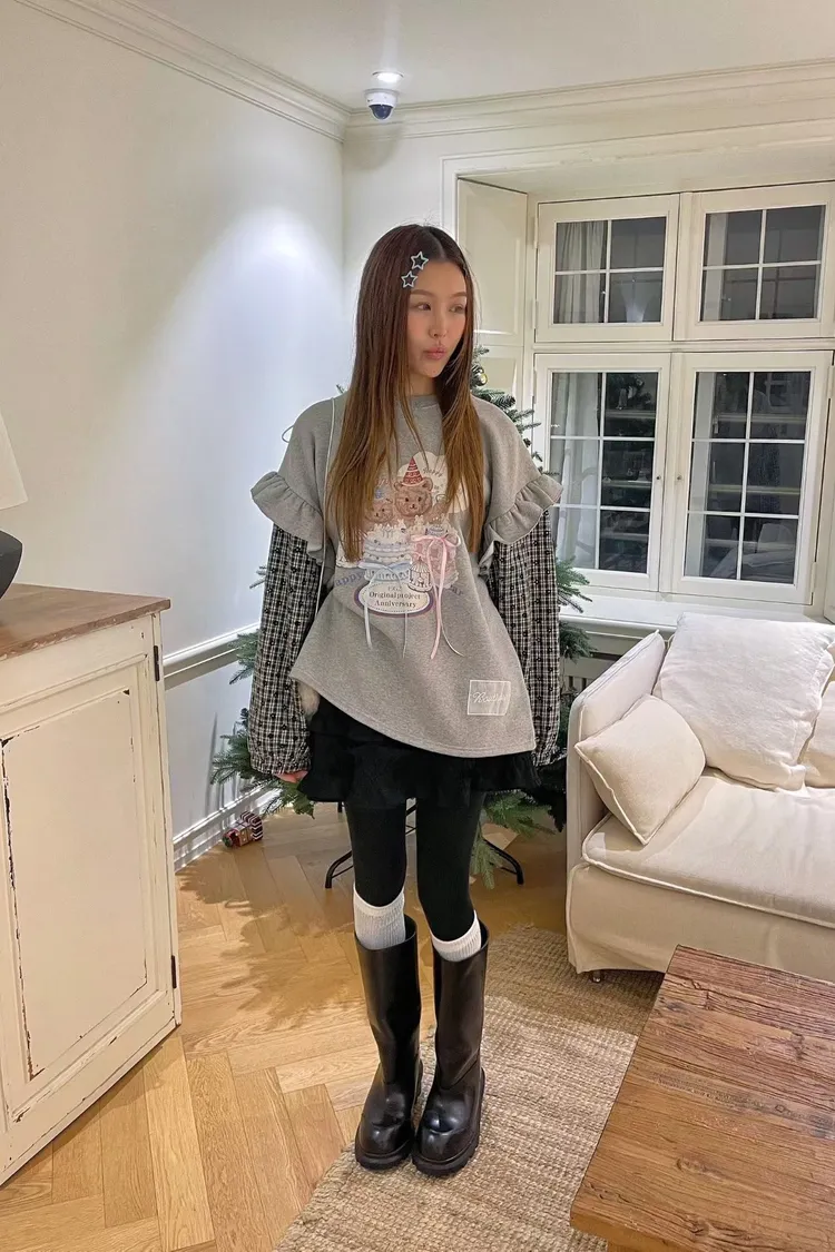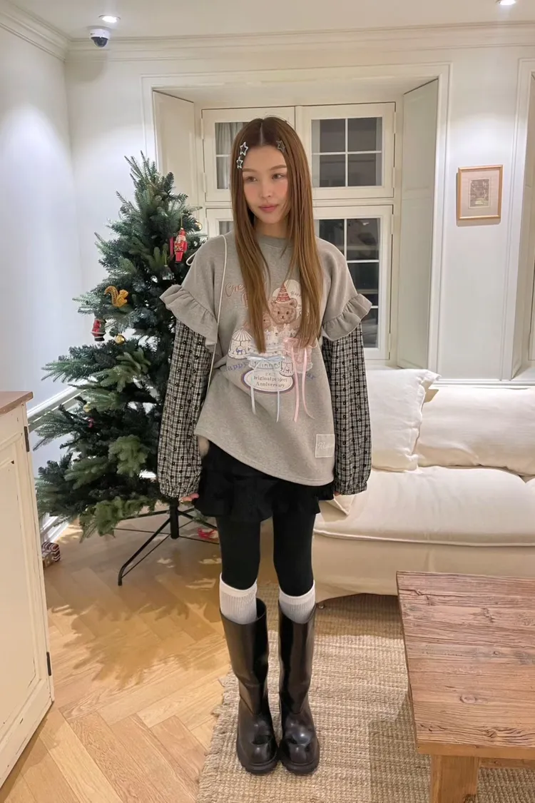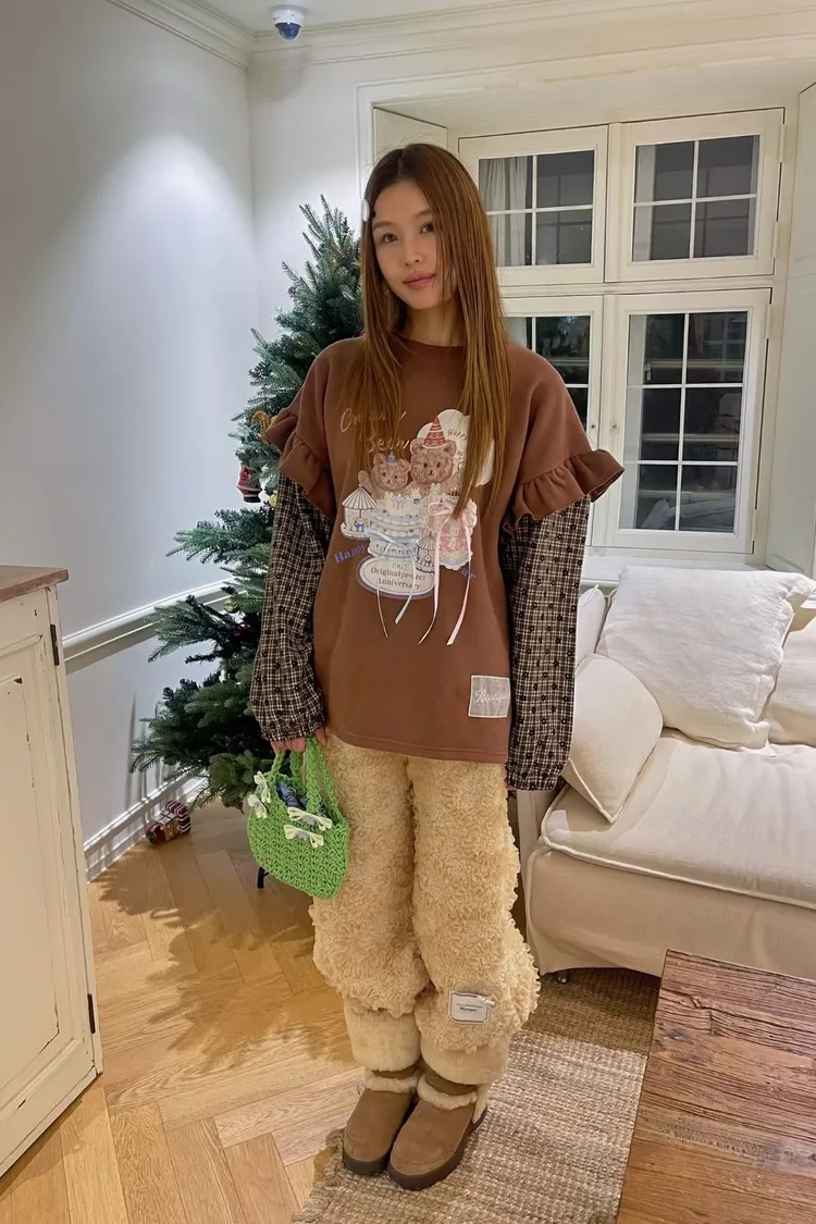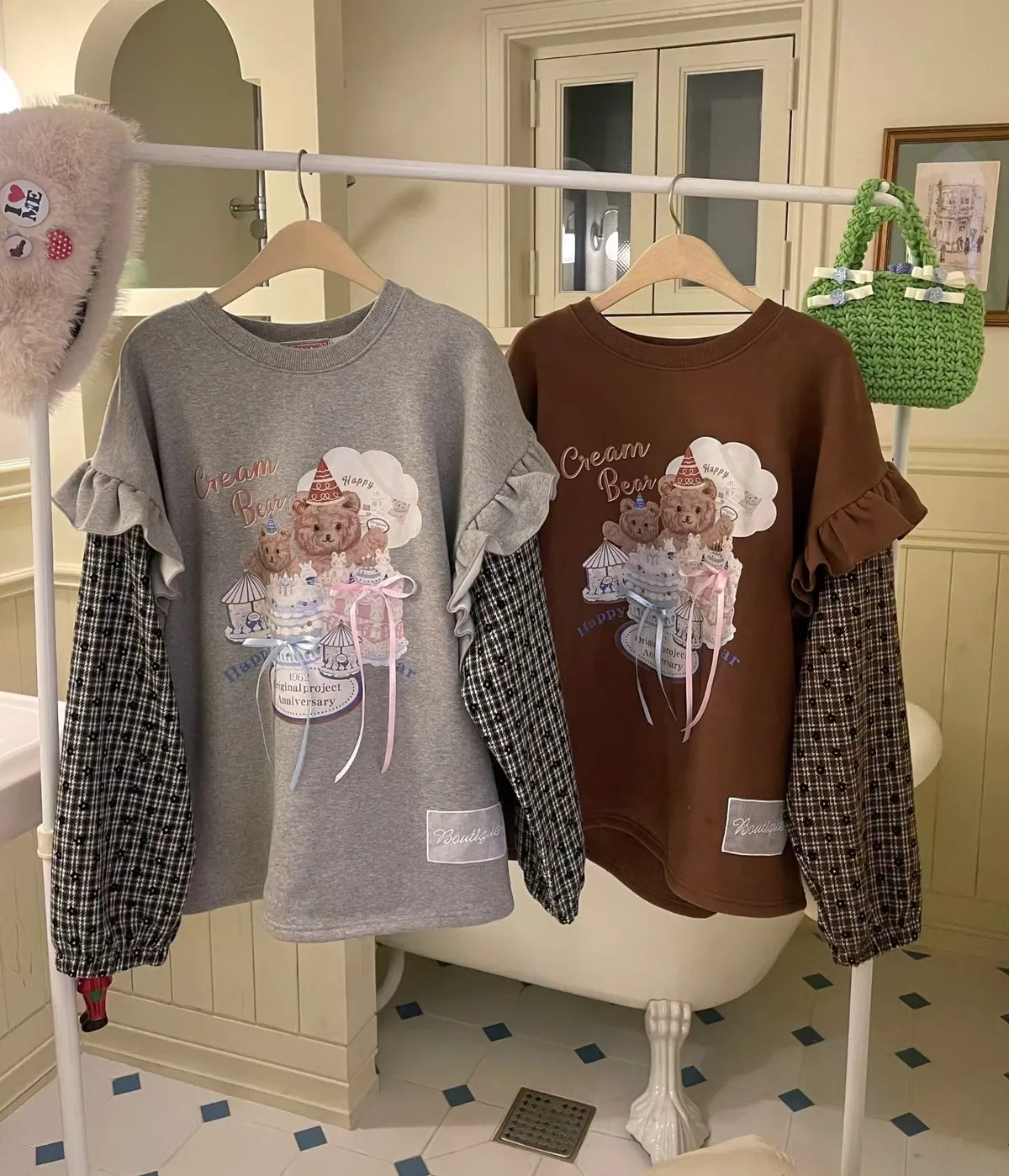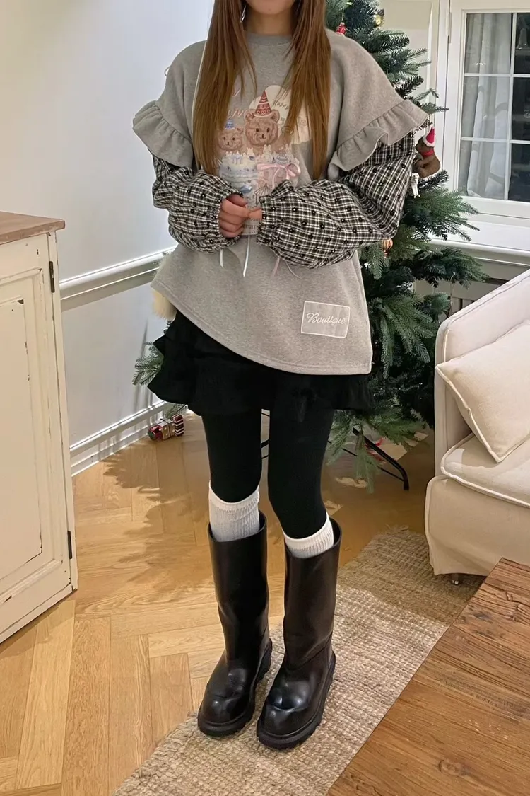 內裡加絨棉料材質拼接格紋毛料手袖,假兩件設計,質感直接升級 格紋裡還藏了小花圖案,甜得很細膩 袖子拼接處再加上波浪花邊設計,整件看起來立體又有層次 正面的小熊生日派對印花真的太犯規,還搭配立體緞帶蝴蝶結裝飾 可愛到不行卻完全不幼稚,是那種很有「高級童趣感」的可愛 落肩寬鬆版型,S-XL妞都可以穿