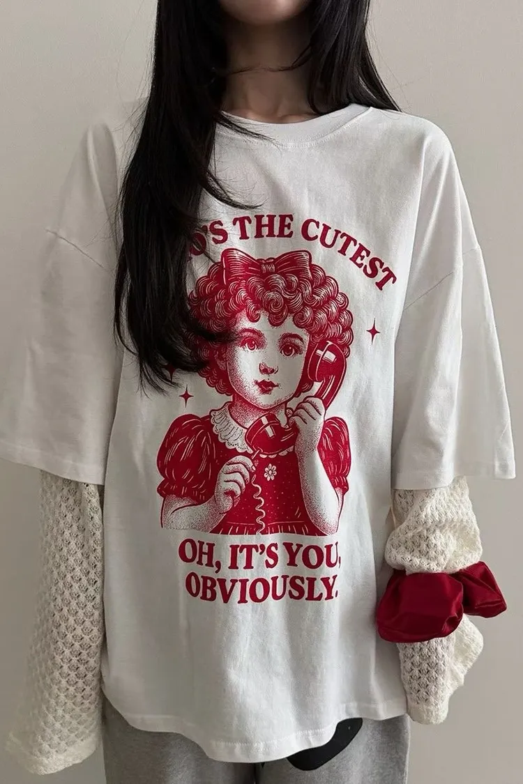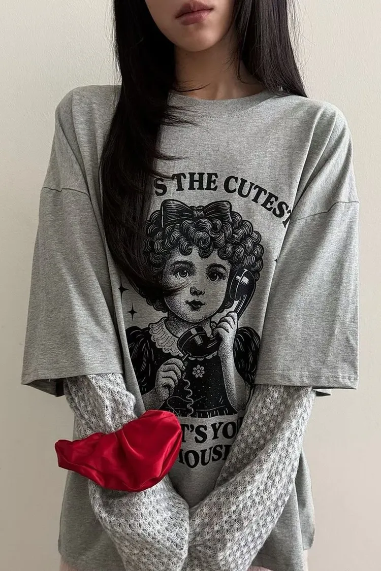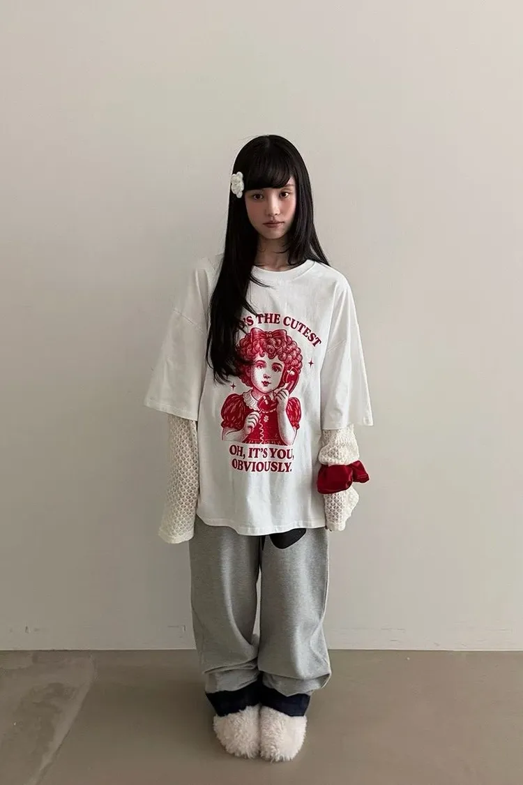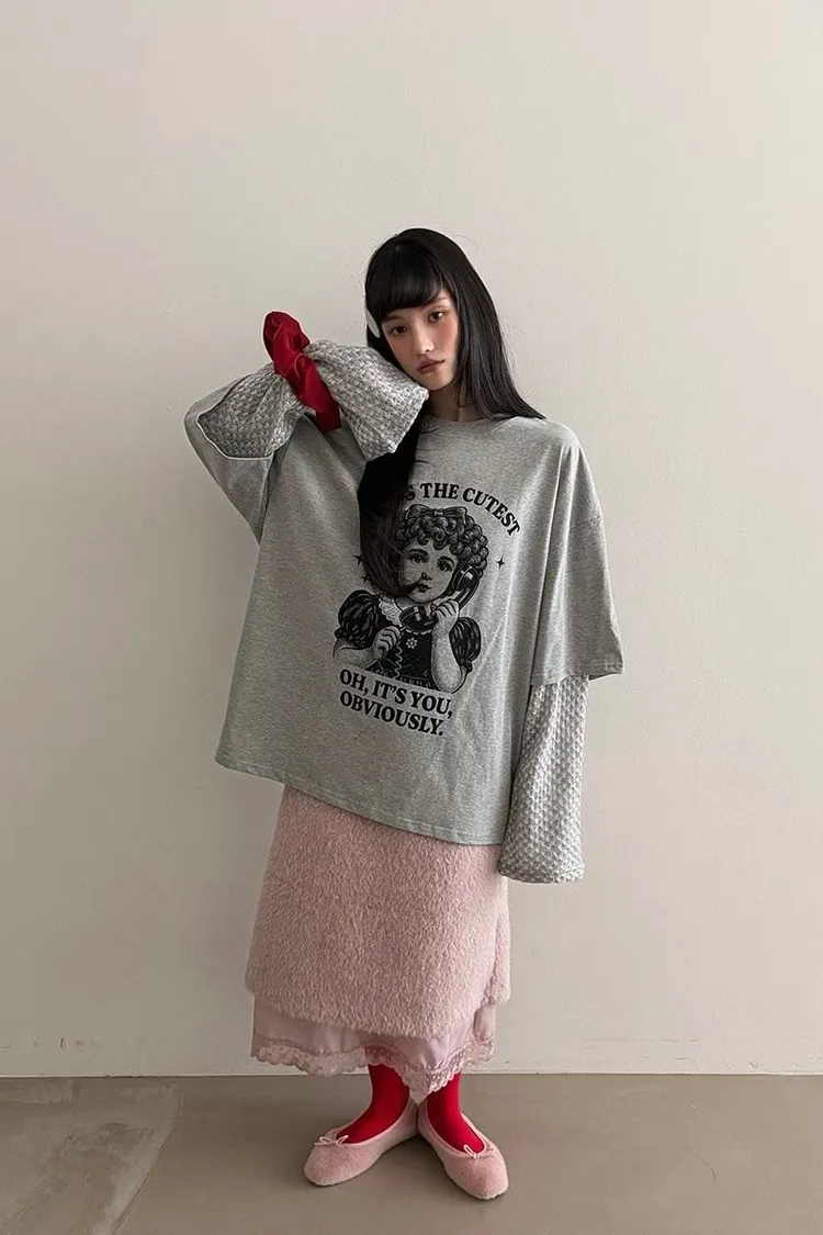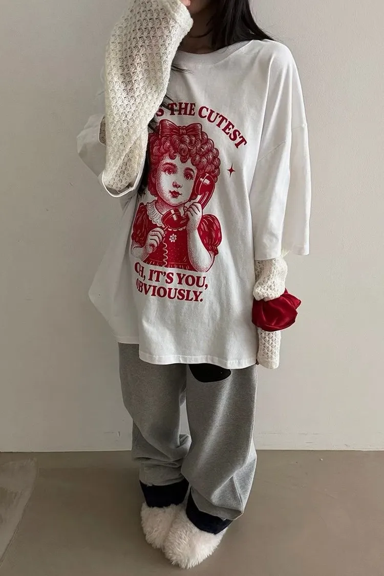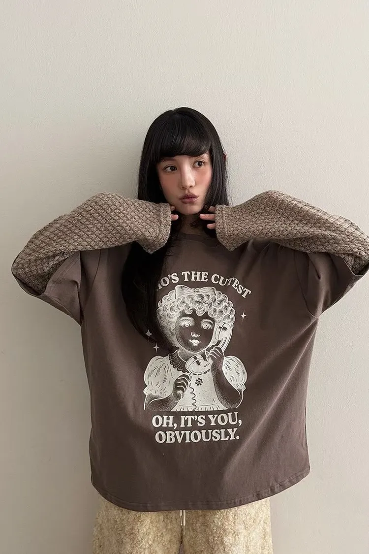 棉料材質、拼接針織手袖設計,多了一點溫度與層次,讓整體看起來不單調 拓印感的復古漫畫女孩搭配正線熱線通話的圖案 像從老雜誌裡翻出來的小插畫,帶點俏皮又有濃濃復古味 落肩寬鬆蓋臀版型,S-XL妞都可以穿,隨便一套就有型
