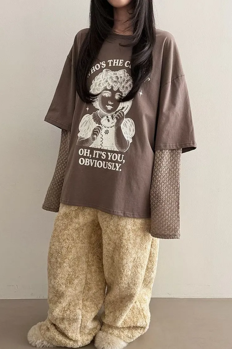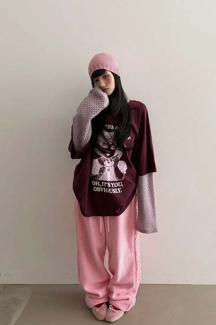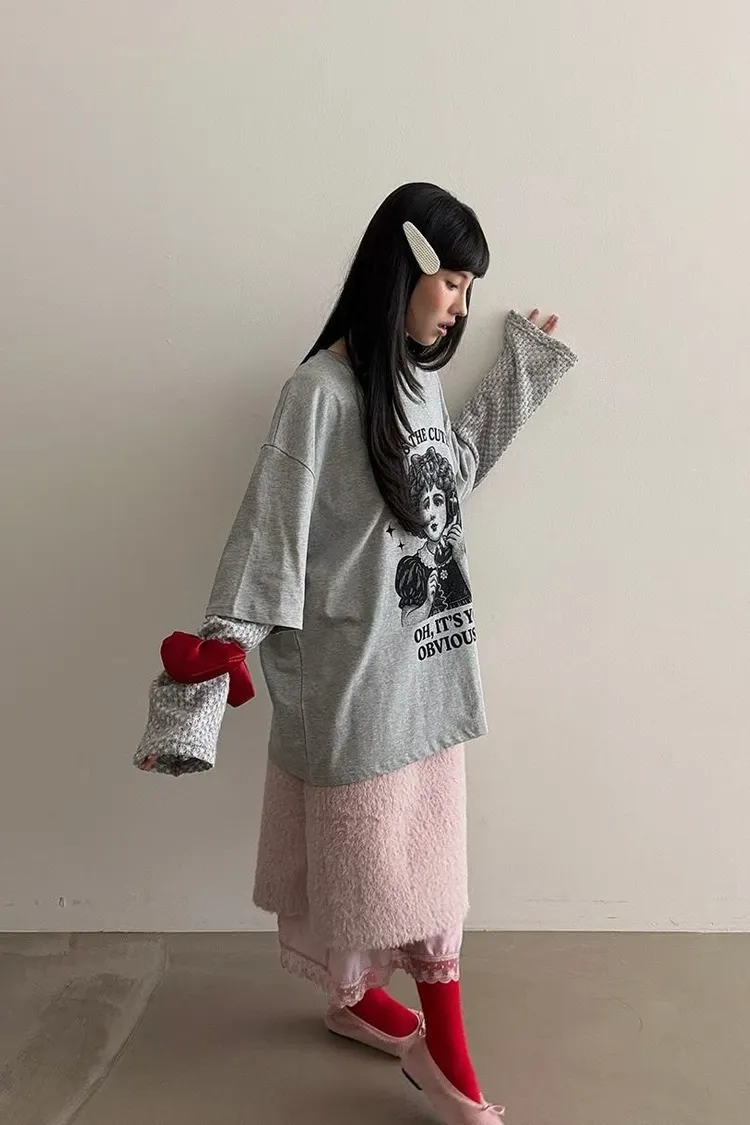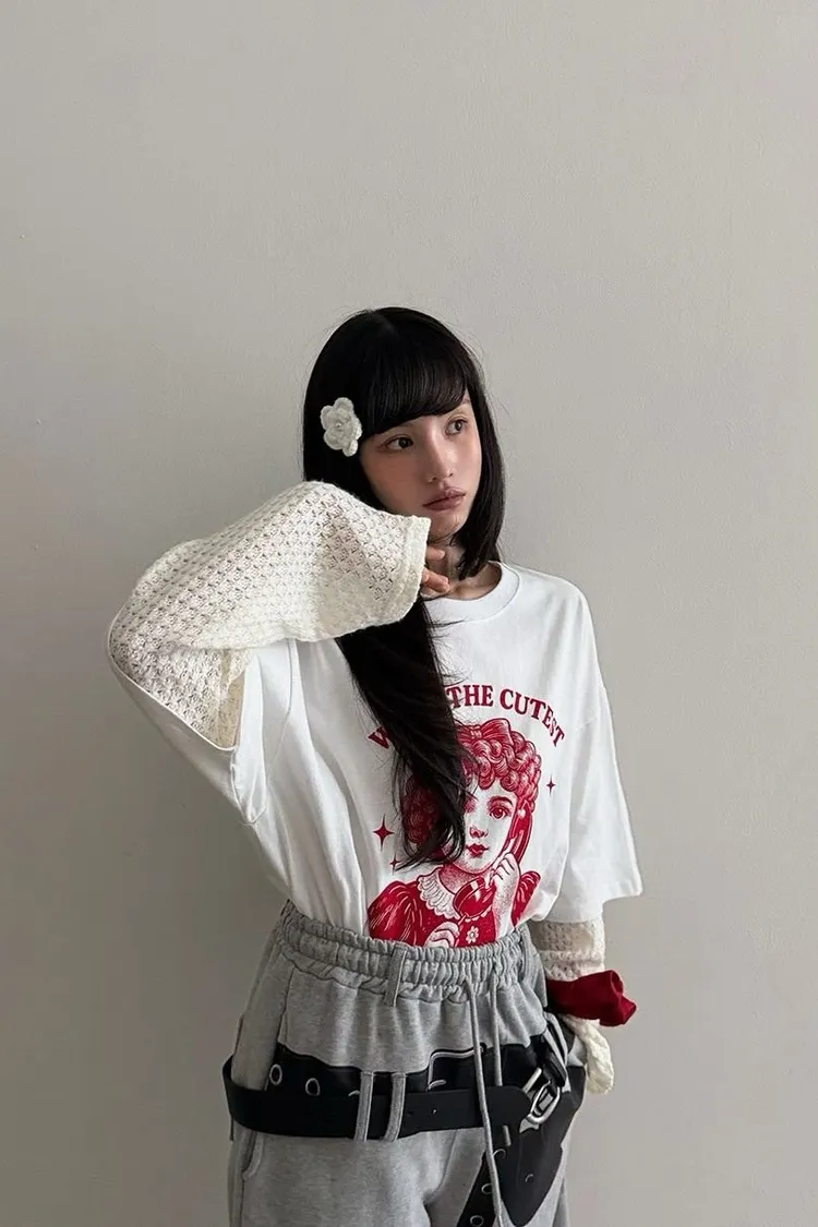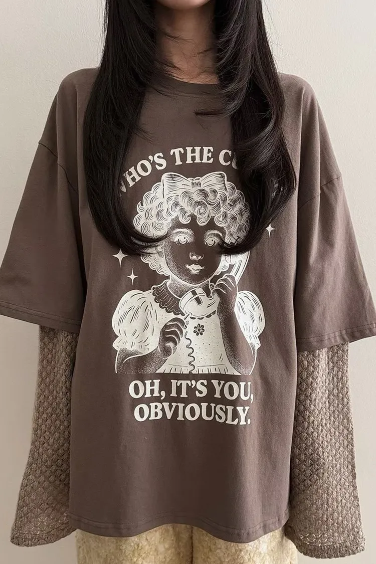 棉料材質、拼接針織手袖設計,多了一點溫度與層次,讓整體看起來不單調 拓印感的復古漫畫女孩搭配正線熱線通話的圖案 像從老雜誌裡翻出來的小插畫,帶點俏皮又有濃濃復古味 落肩寬鬆蓋臀版型,S-XL妞都可以穿,隨便一套就有型