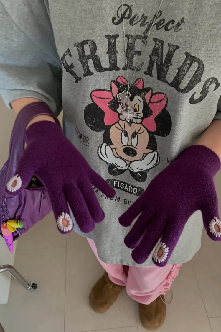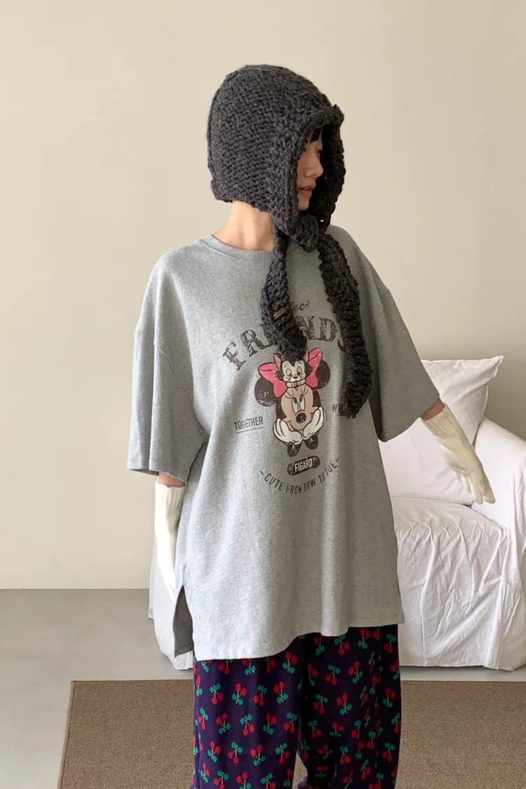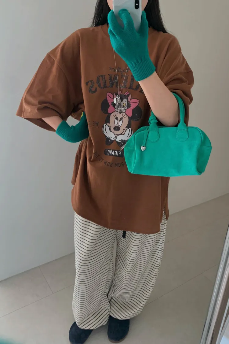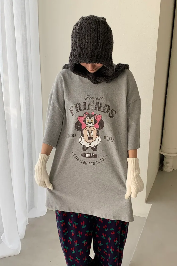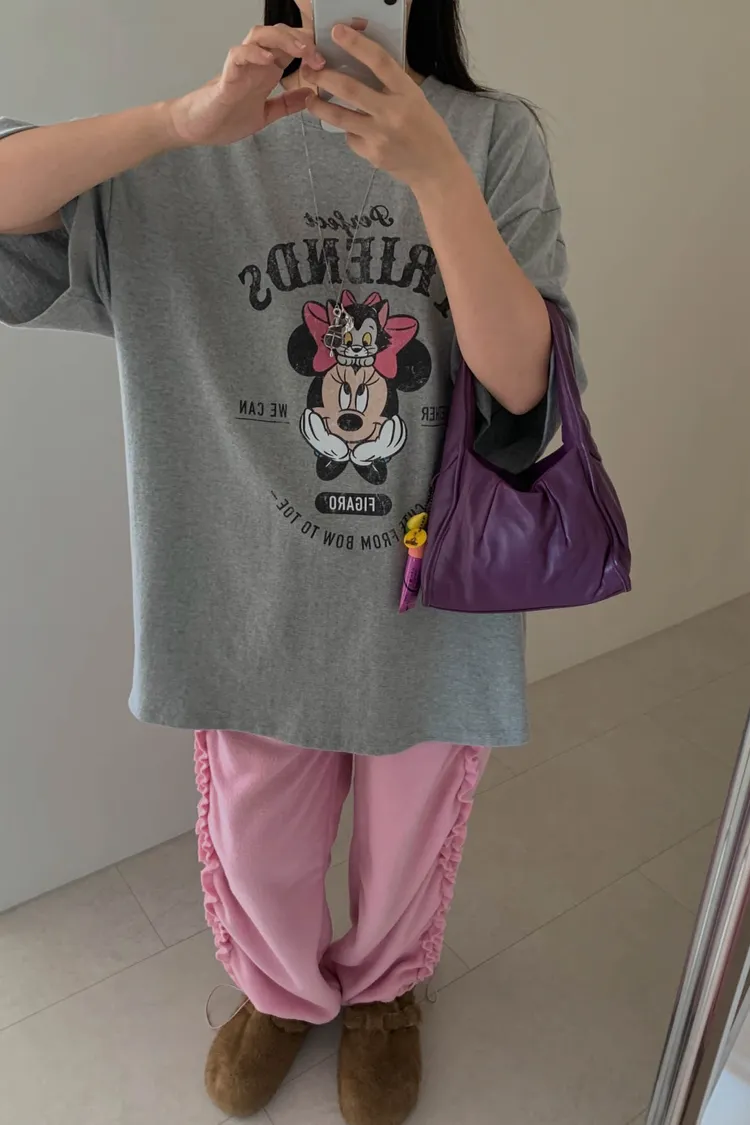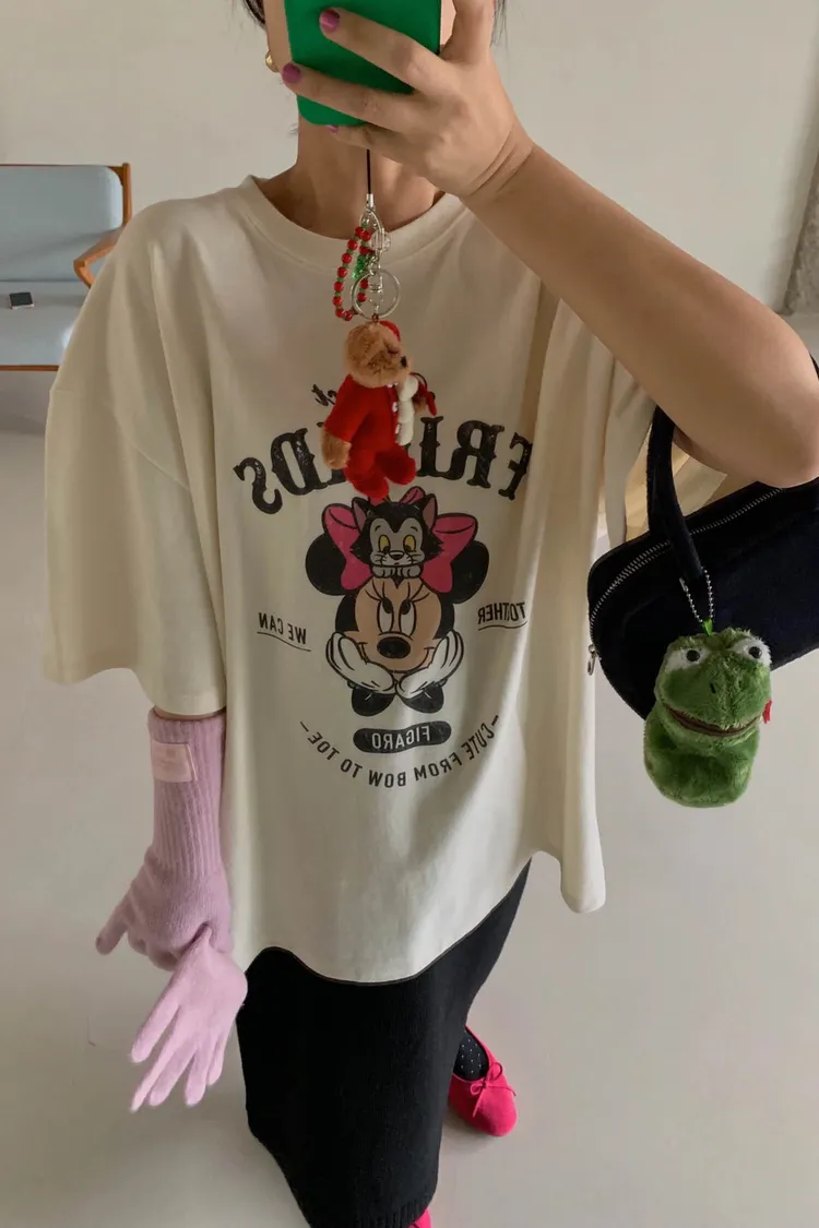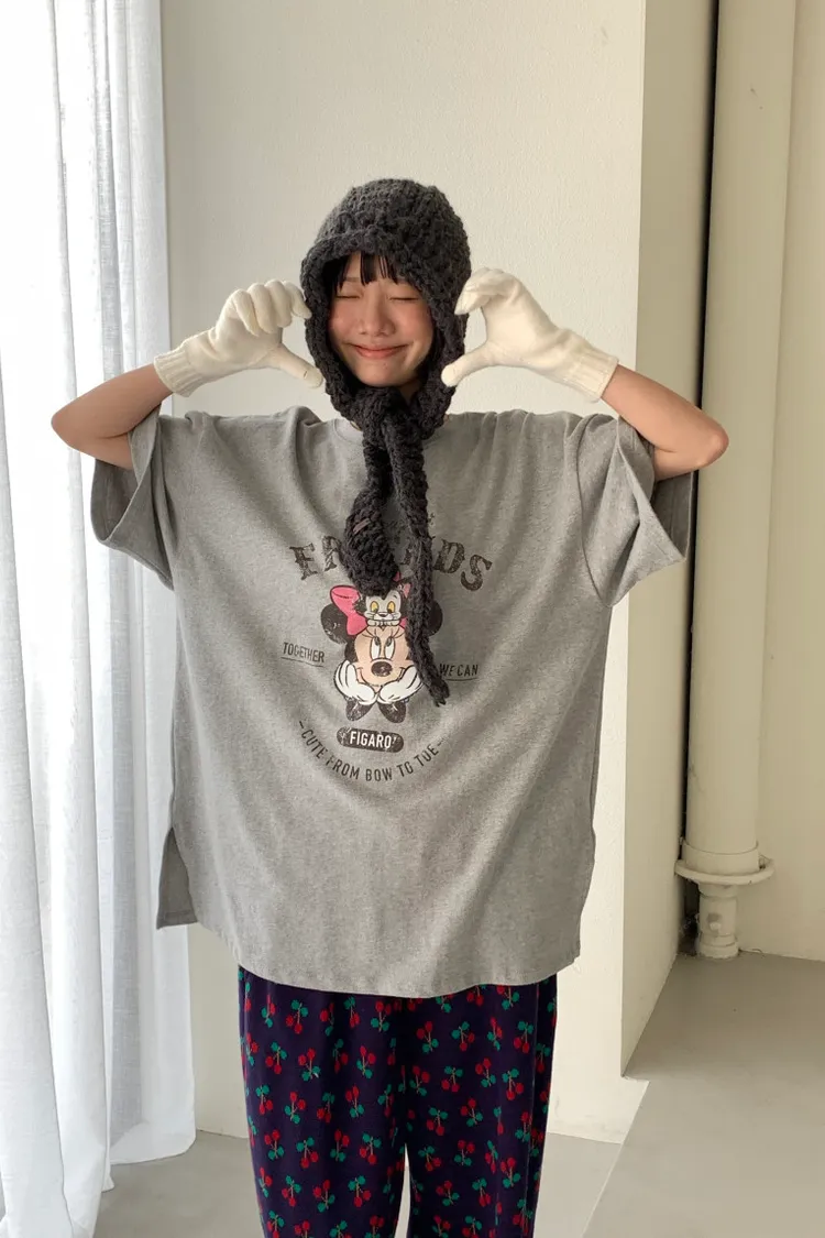 斑駁感米妮與英文字母印花甜美又俏皮,衣襬微開衩設計增添靈動感