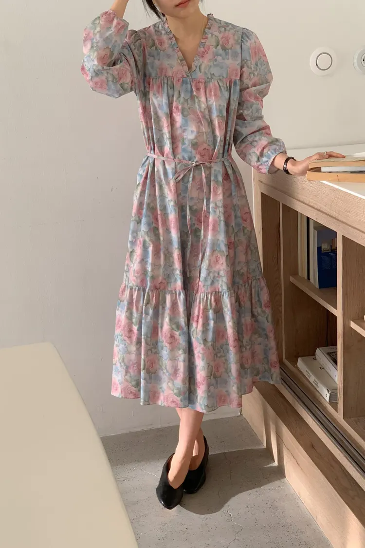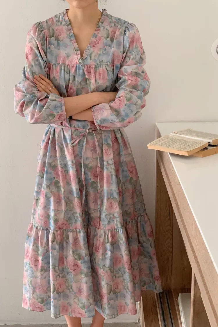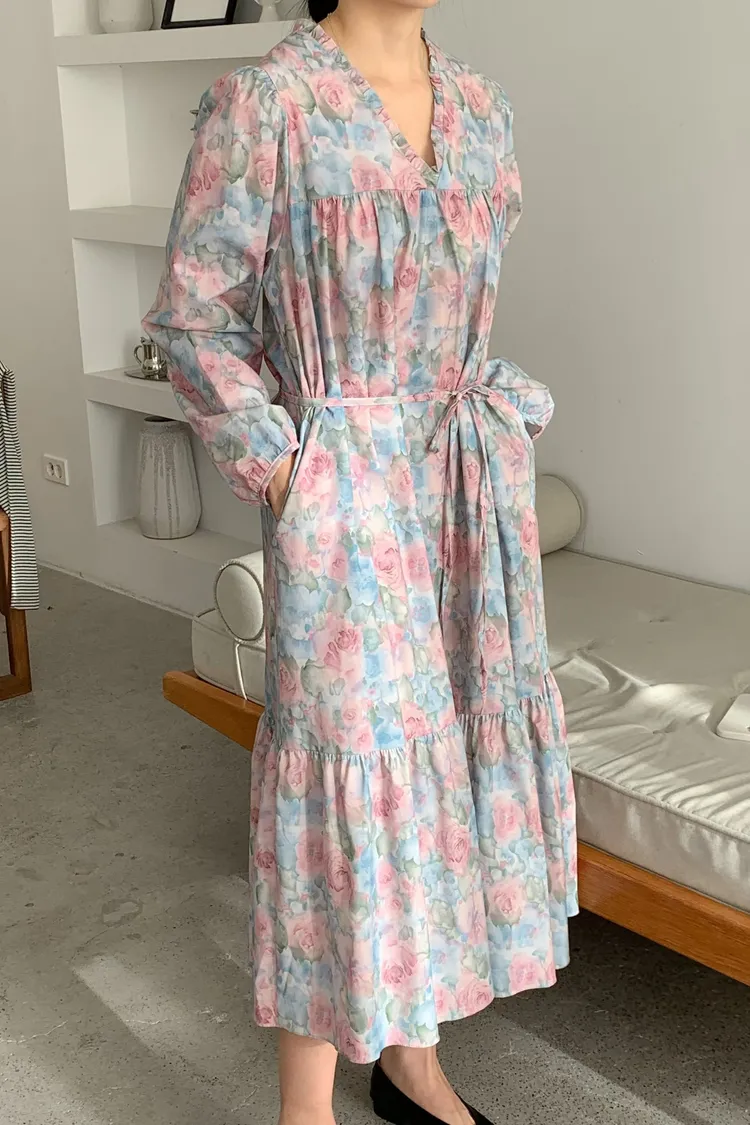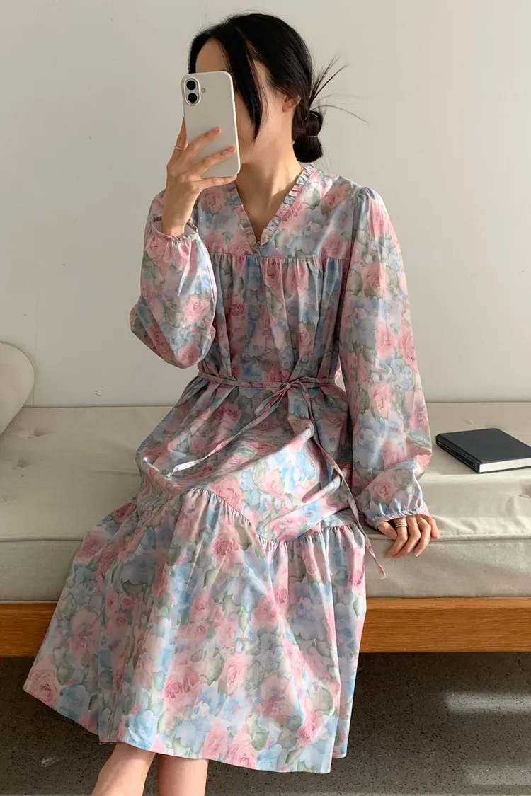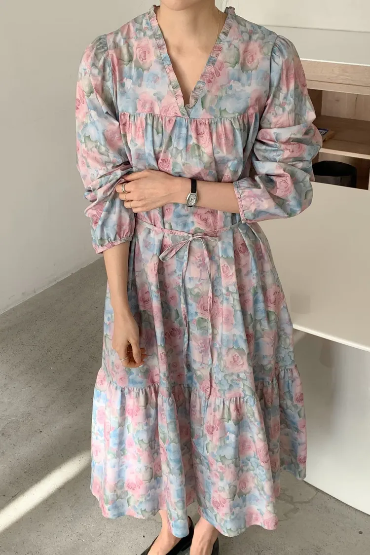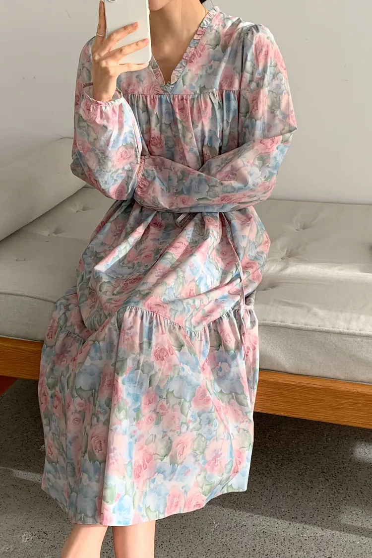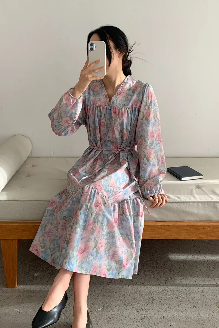 棉料材質輕盈親膚,傘狀裙襬自然展開優雅弧度,走動間散發輕甜氣息 粉嫩色系水彩暈染花卉如春日花園般柔美浪漫 V領剪裁修飾臉部線條,領口抓褶花邊增添細膩層次感,S-L妞都可以穿 背面有拉鍊好穿脫、有口袋 約會或日常漫步都能穿出清新甜美與溫柔高級感