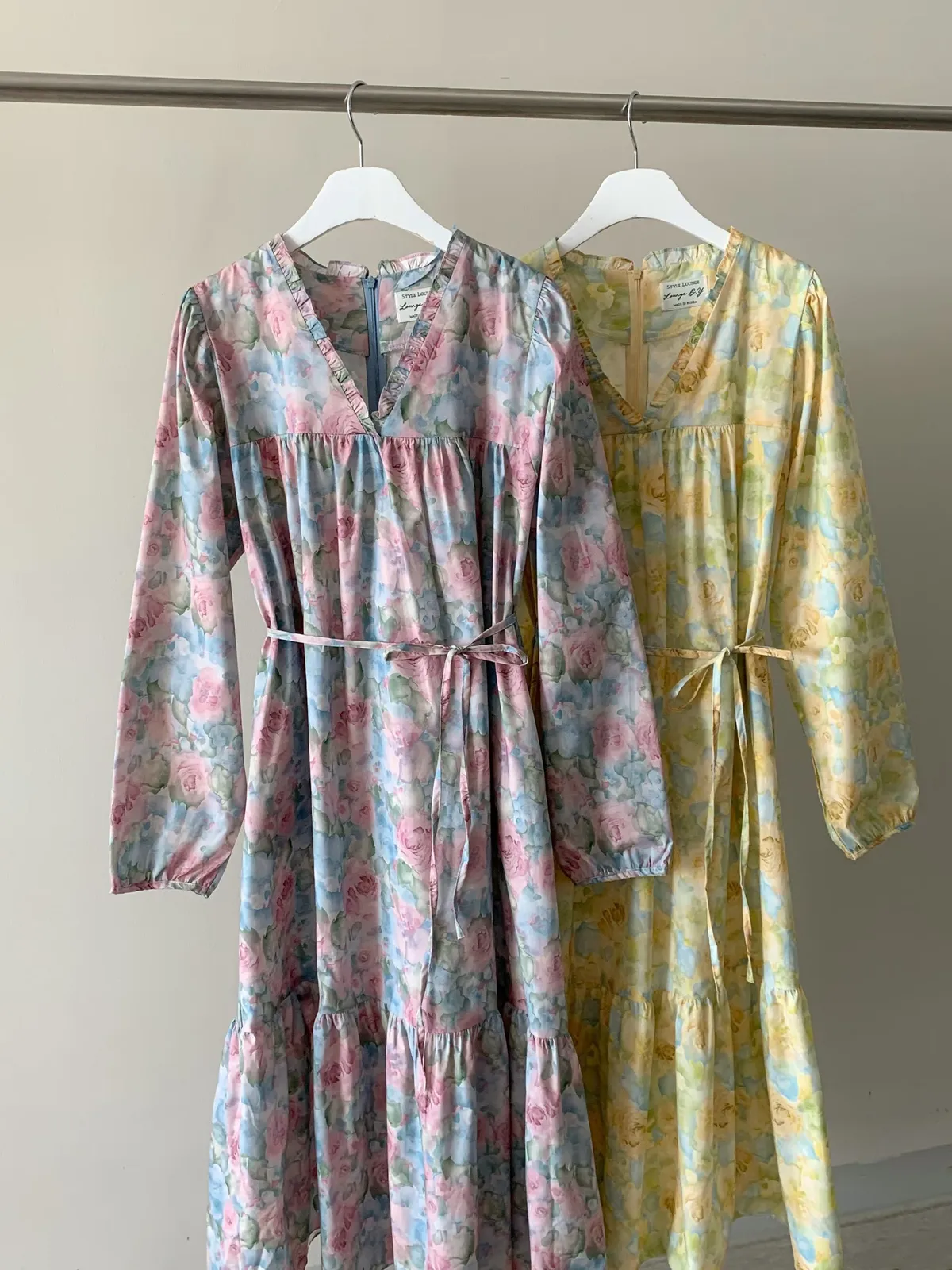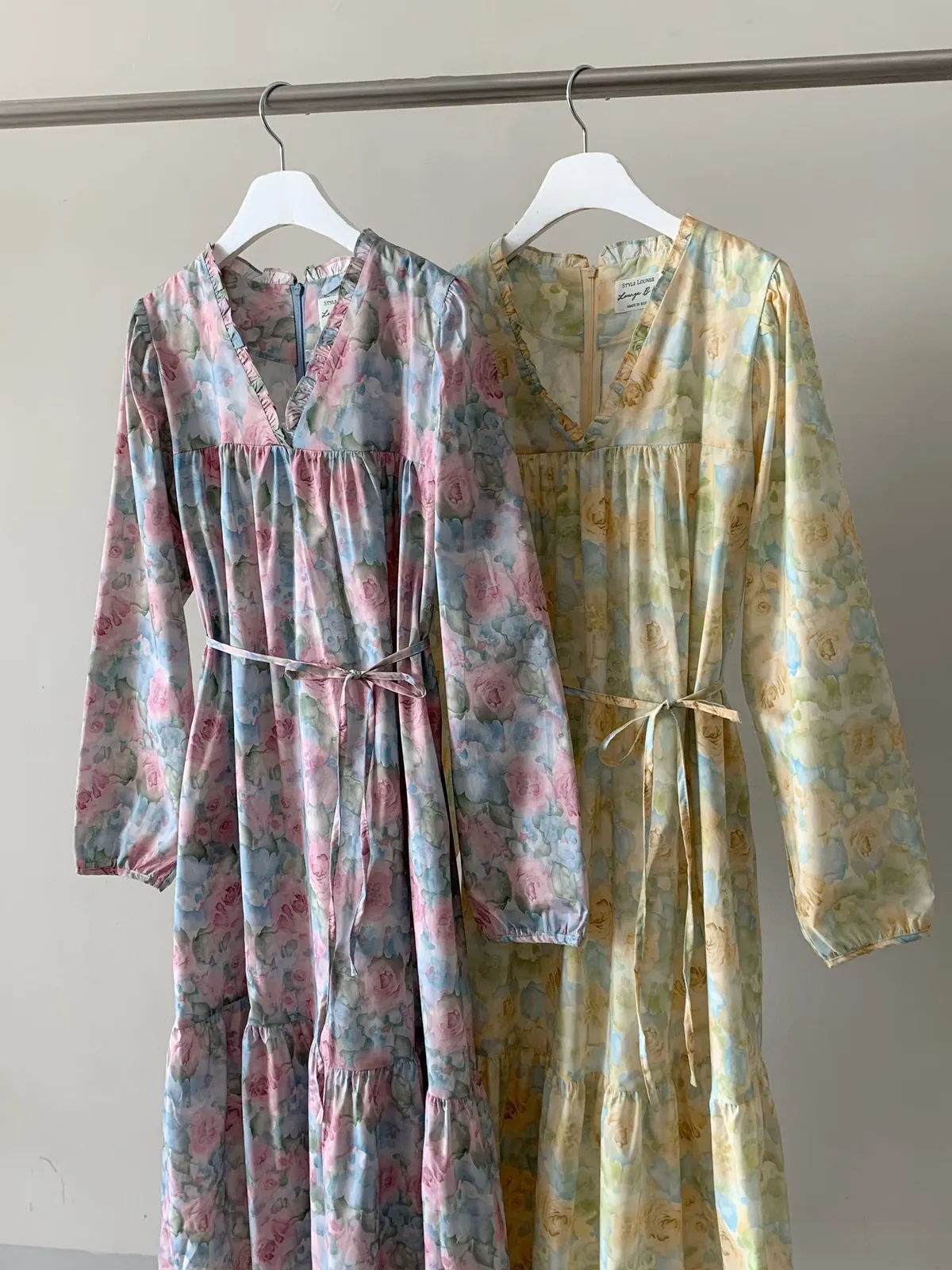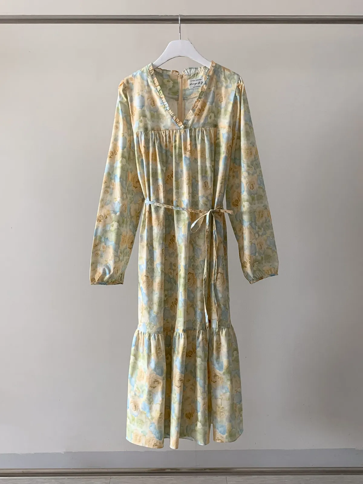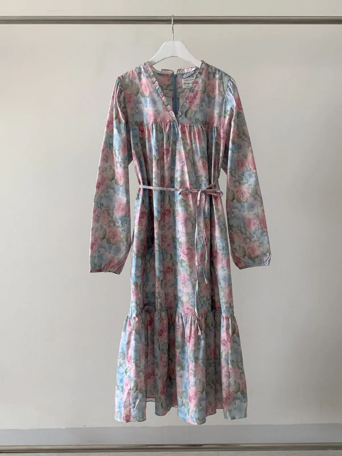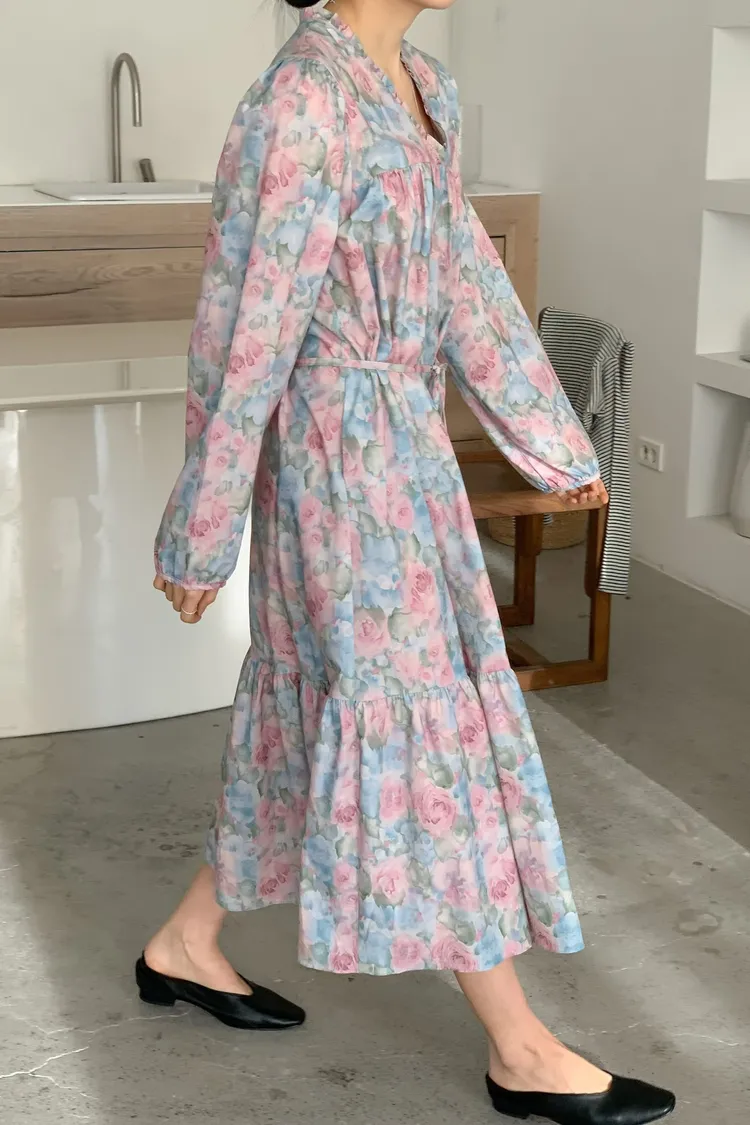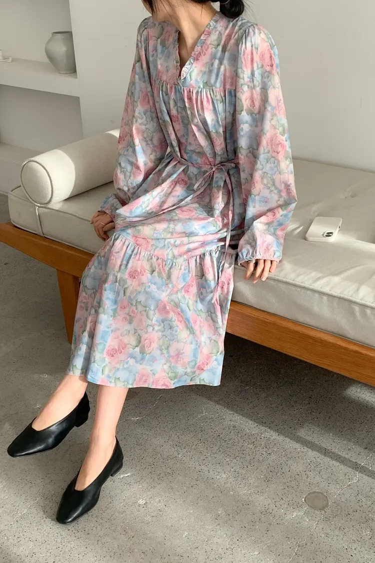 棉料材質輕盈親膚,傘狀裙襬自然展開優雅弧度,走動間散發輕甜氣息 粉嫩色系水彩暈染花卉如春日花園般柔美浪漫 V領剪裁修飾臉部線條,領口抓褶花邊增添細膩層次感,S-L妞都可以穿 背面有拉鍊好穿脫、有口袋 約會或日常漫步都能穿出清新甜美與溫柔高級感