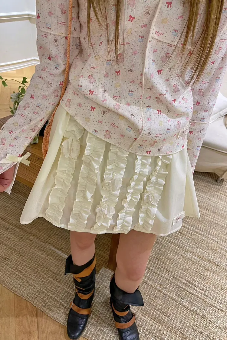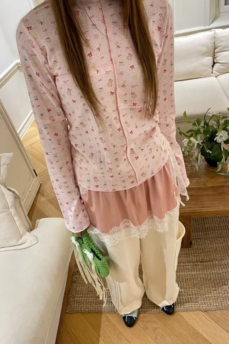 FET03蝴蝶緞帶精巧熊影拼接棉T上衣