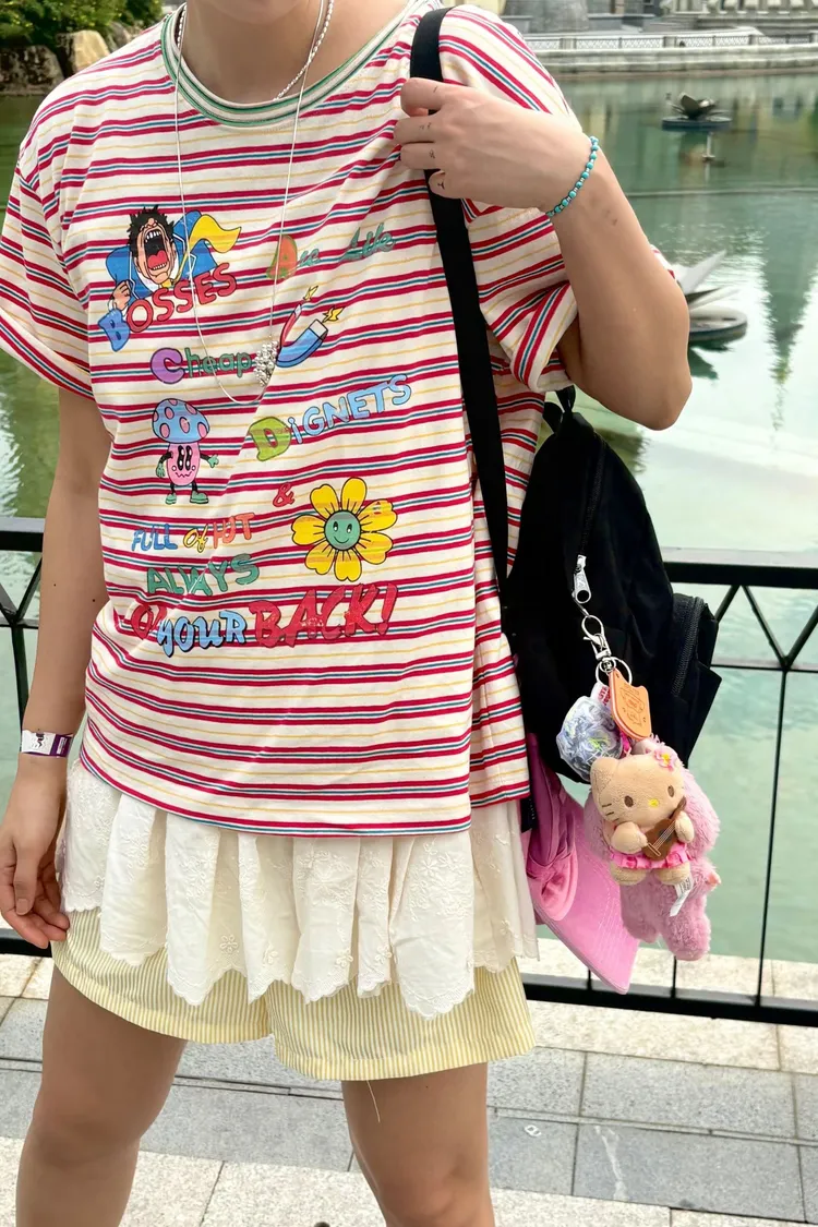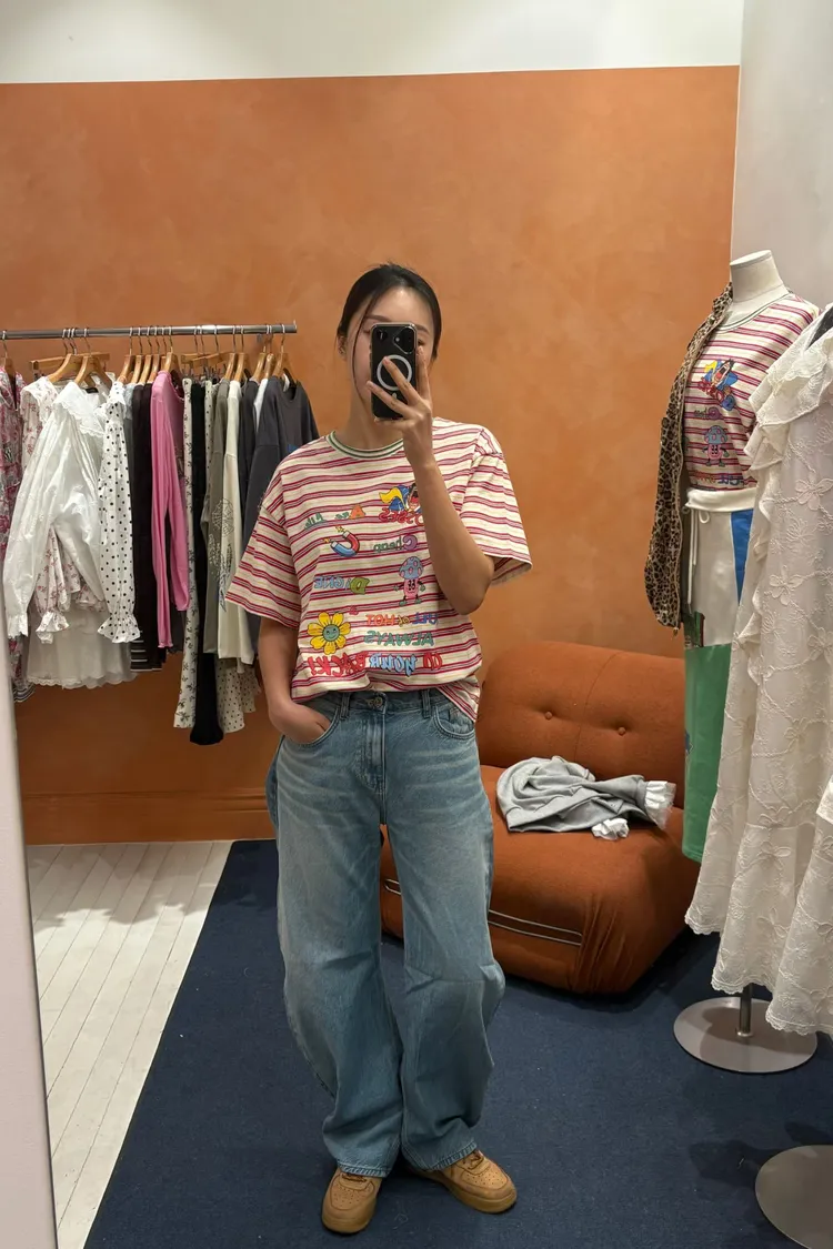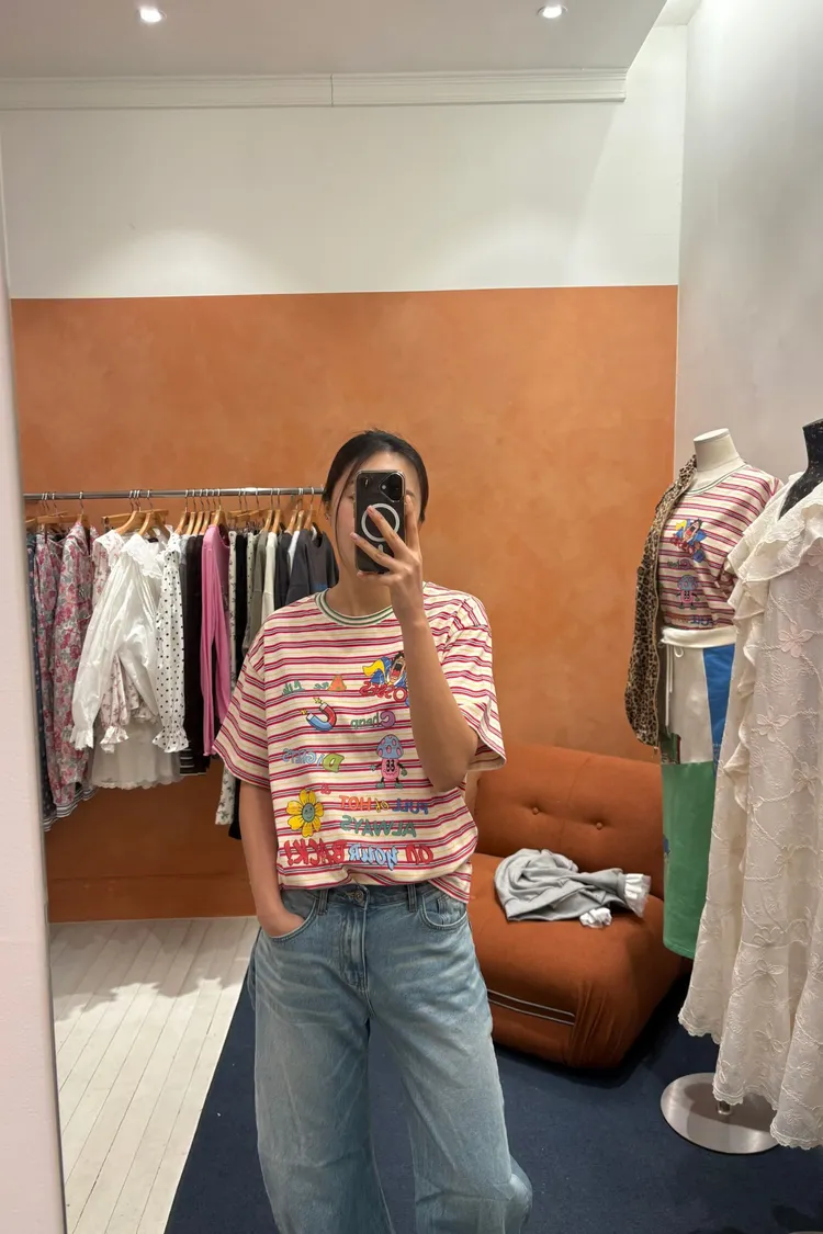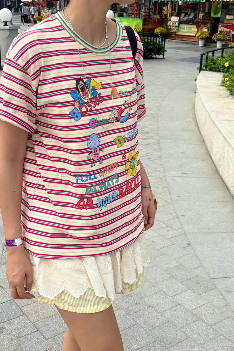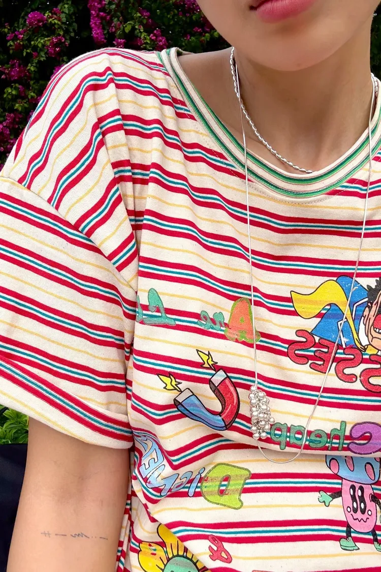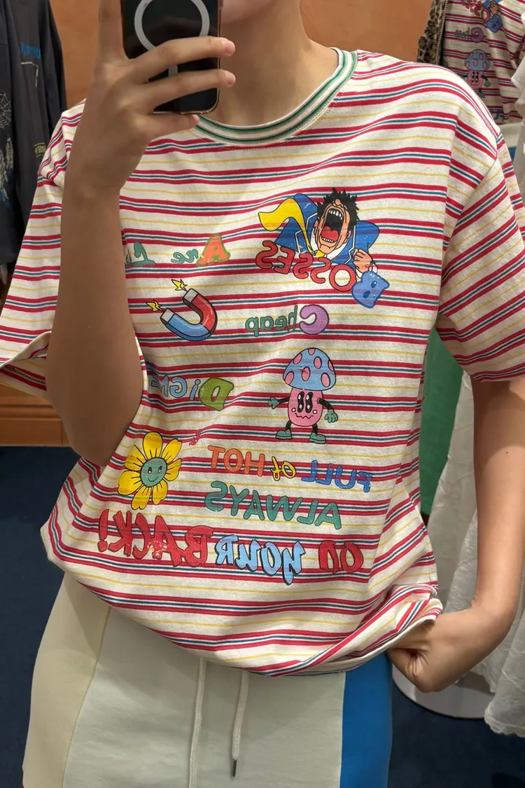 一看就很有活力感♡ 棉料材質、寬鬆版型,穿起來輕鬆自在,S-L妞都可以穿 底色是撞色粗細條紋,本身就很有存在感再加上復古褪色字母和童趣印花 整體變得俏皮又帶點舊舊可愛的味道,減齡但不幼稚 相同版型,FET06是純色款,可一併參考