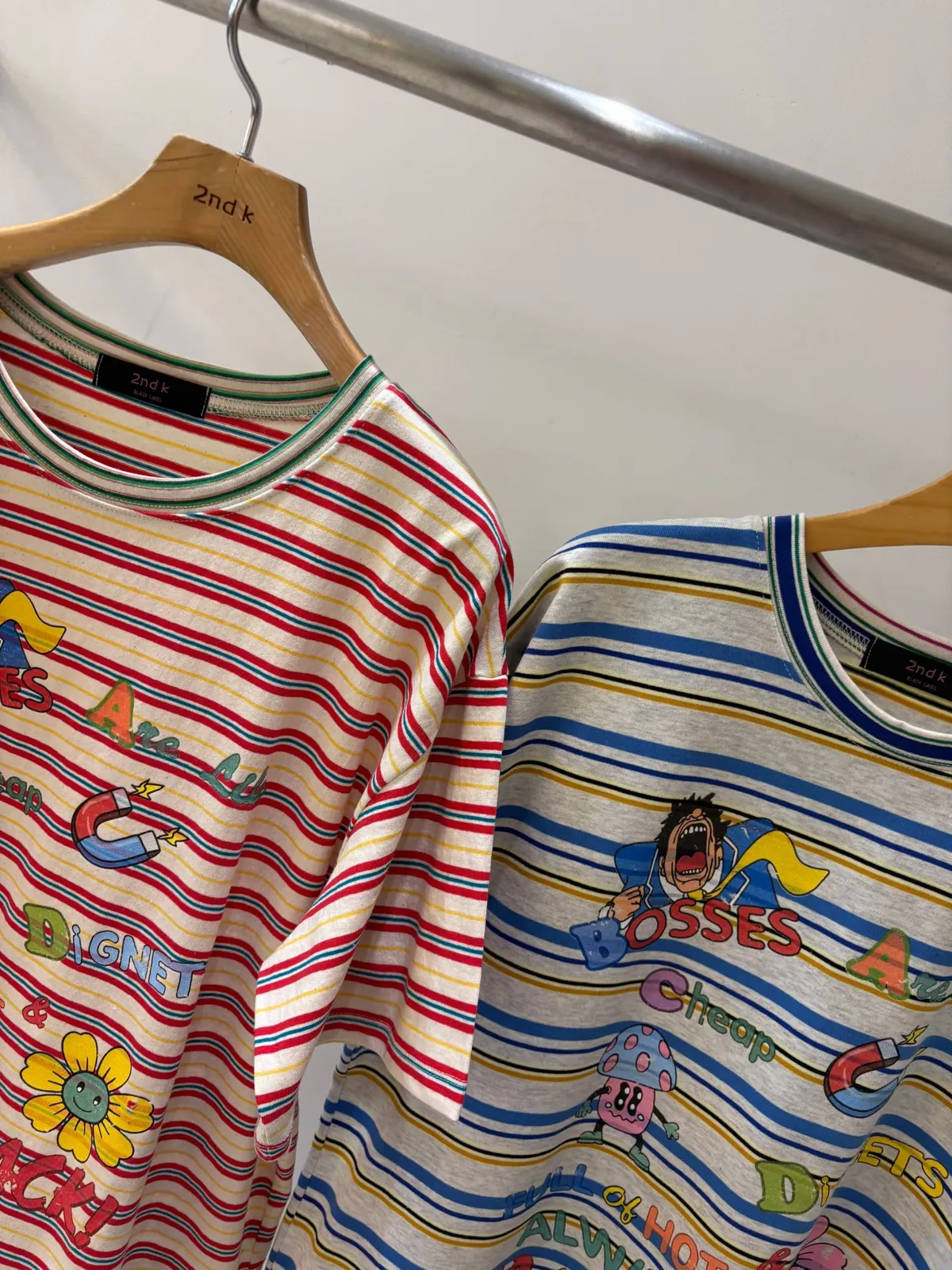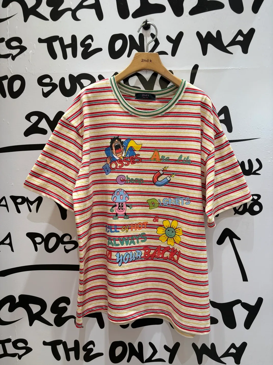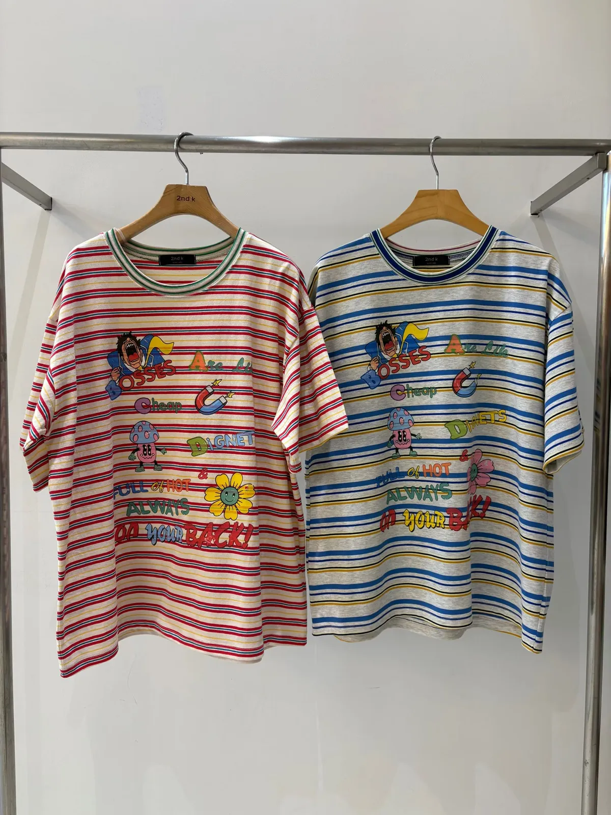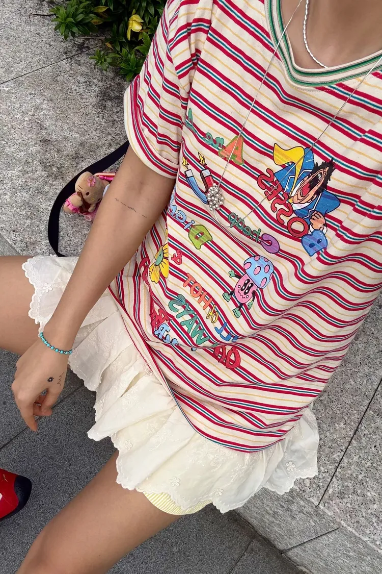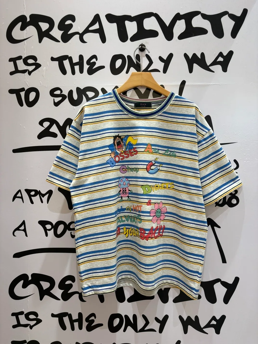 一看就很有活力感♡ 棉料材質、寬鬆版型,穿起來輕鬆自在,S-L妞都可以穿 底色是撞色粗細條紋,本身就很有存在感再加上復古褪色字母和童趣印花 整體變得俏皮又帶點舊舊可愛的味道,減齡但不幼稚 相同版型,FET06是純色款,可一併參考