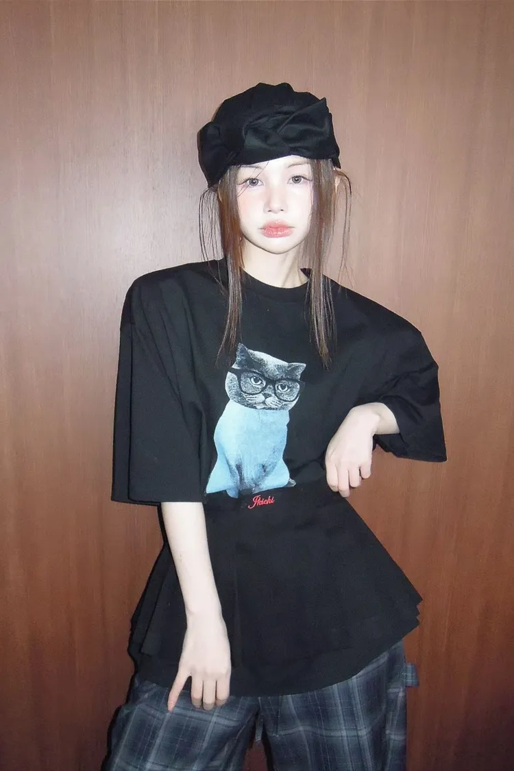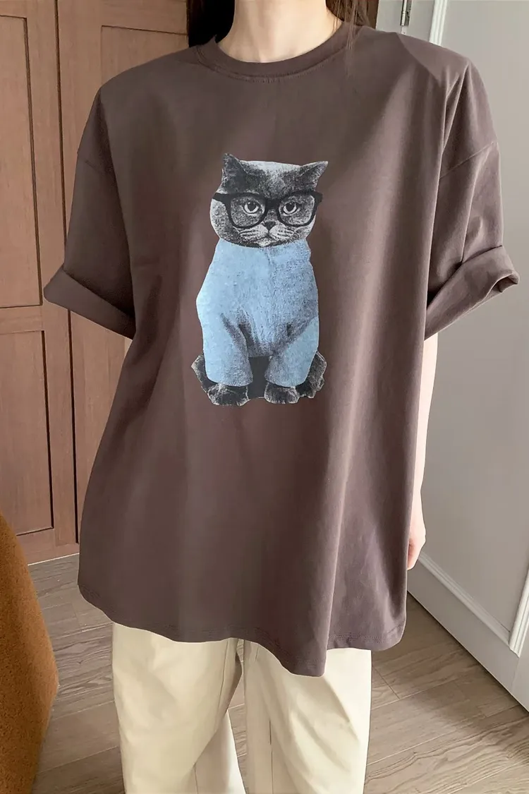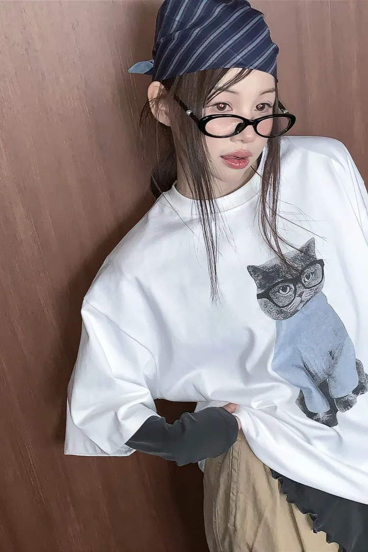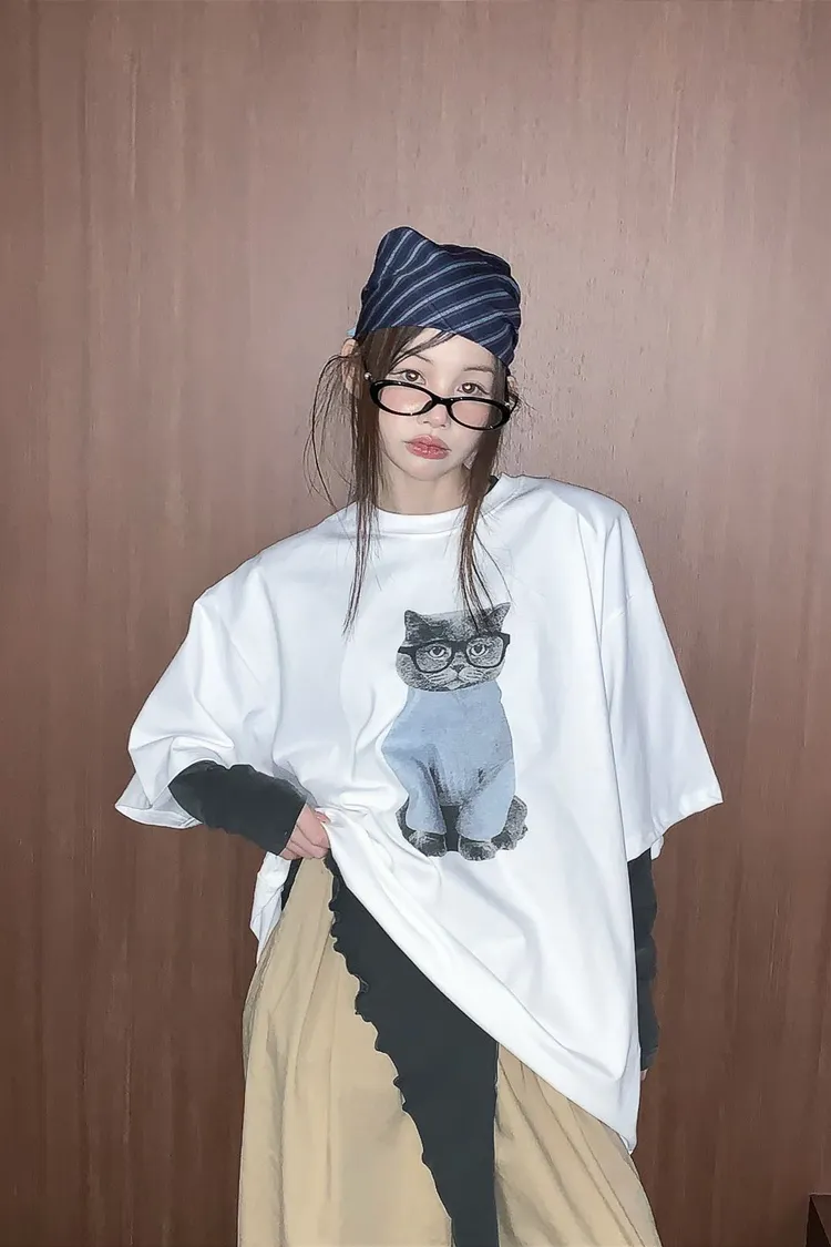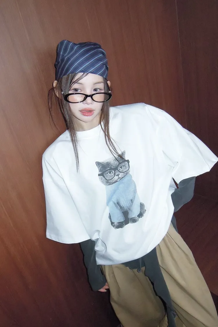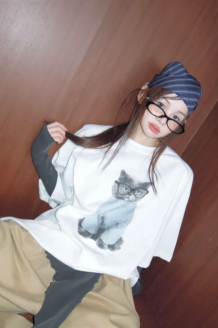 上身印有戴眼鏡的小貓咪,活潑俏皮又帶趣味感,輕鬆打造可愛俏皮日常造型
