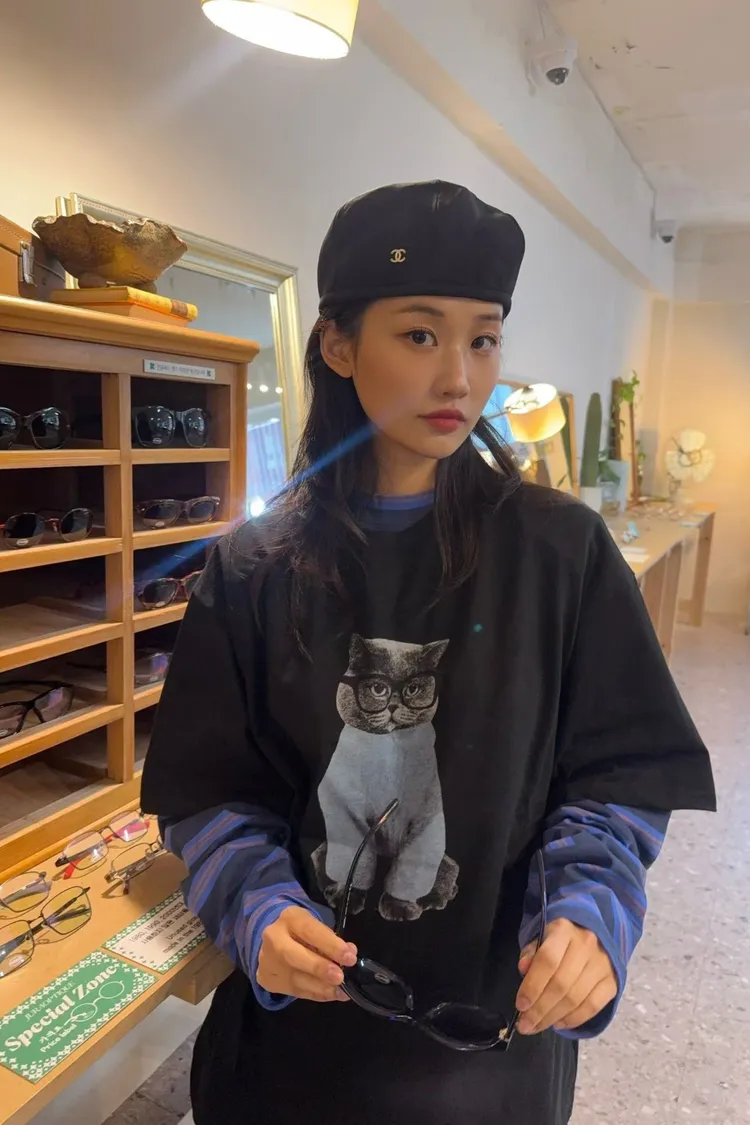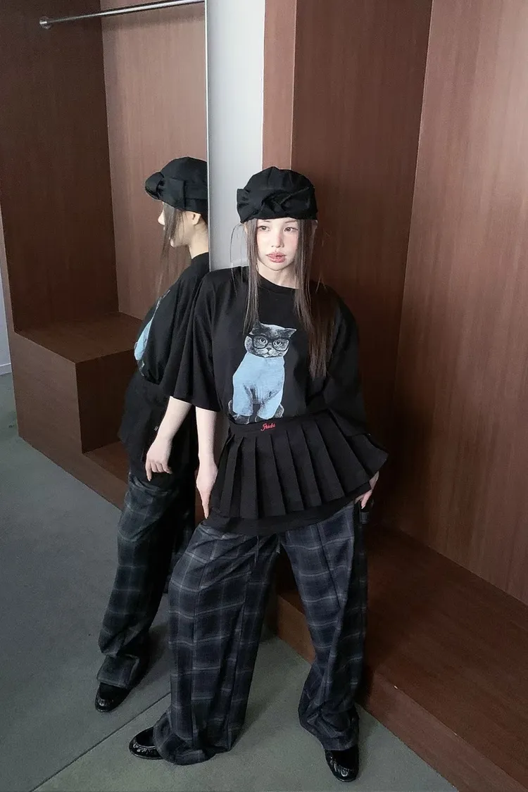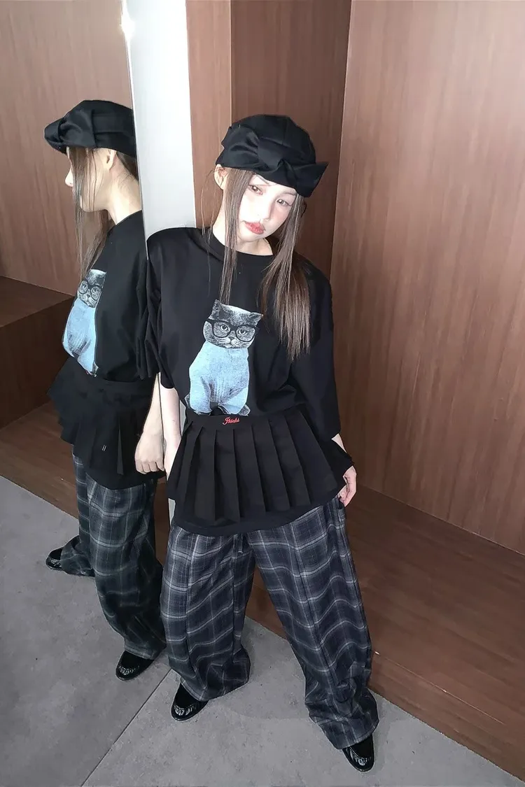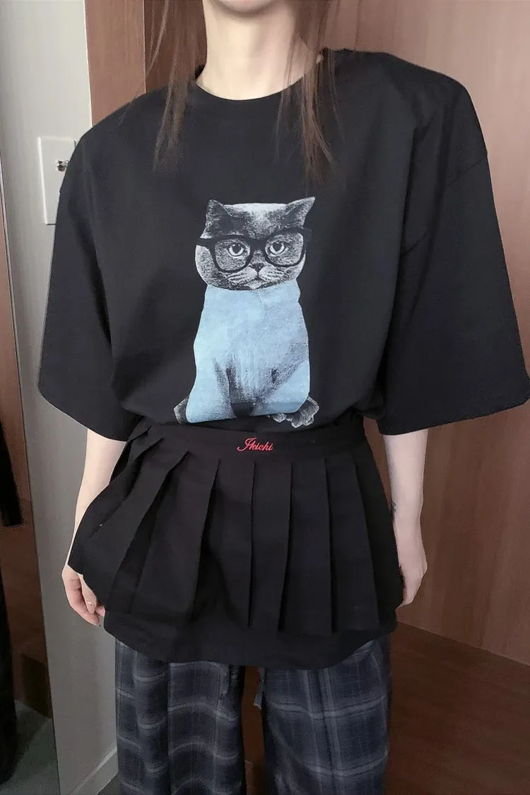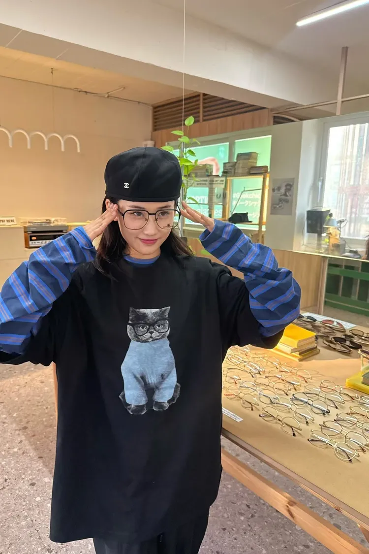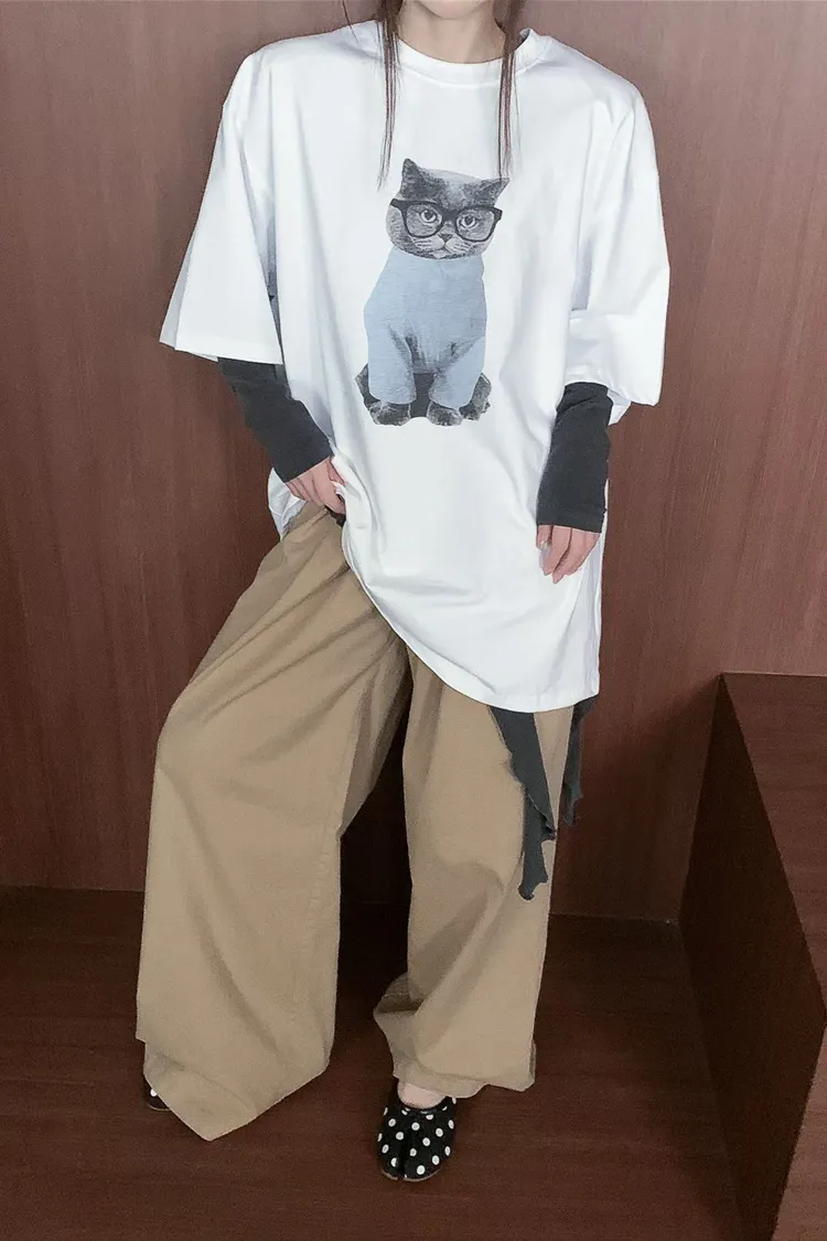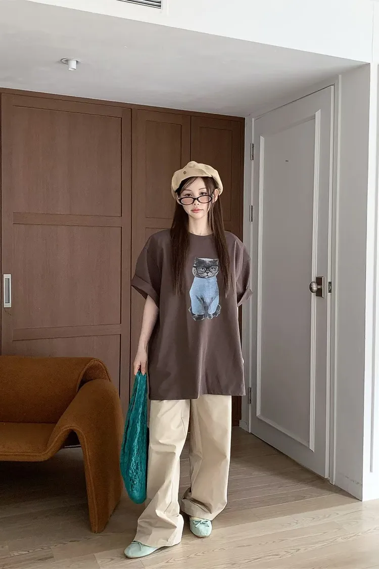上身印有戴眼鏡的小貓咪,活潑俏皮又帶趣味感,輕鬆打造可愛俏皮日常造型