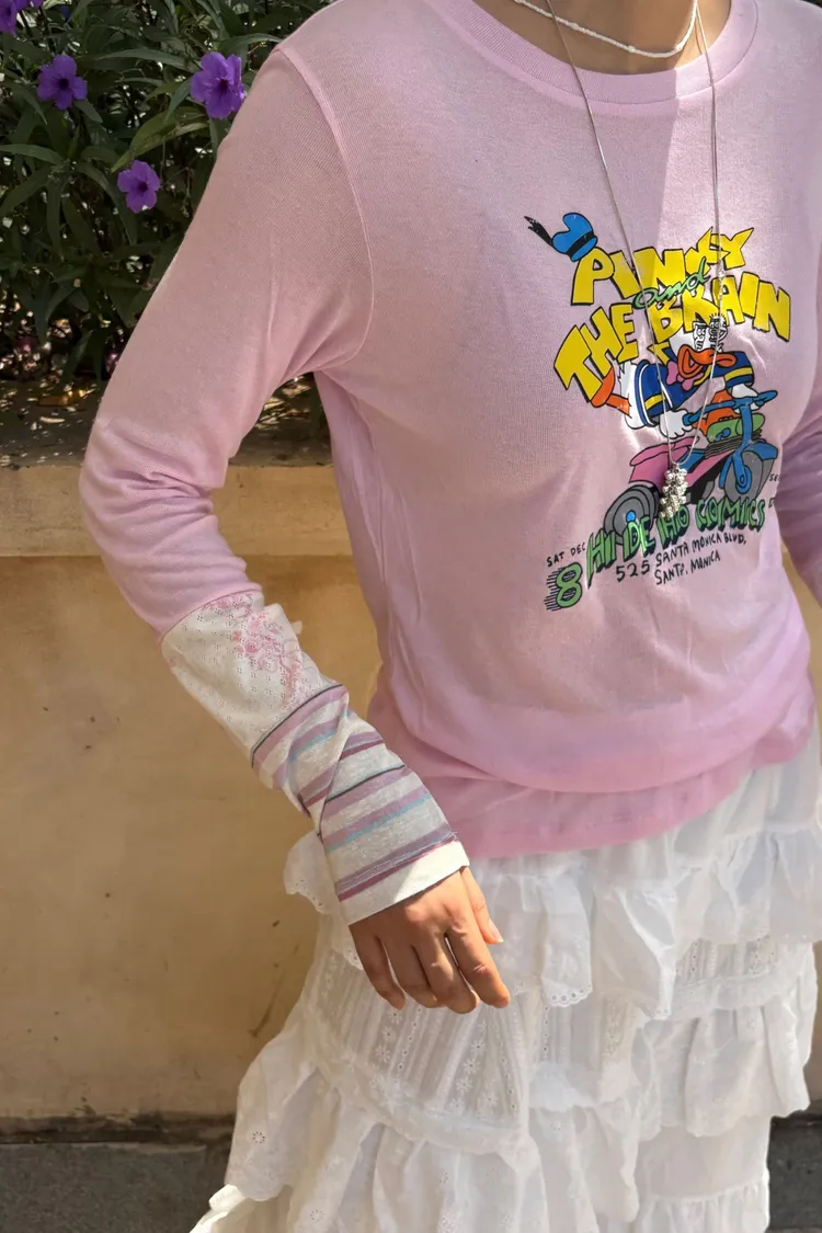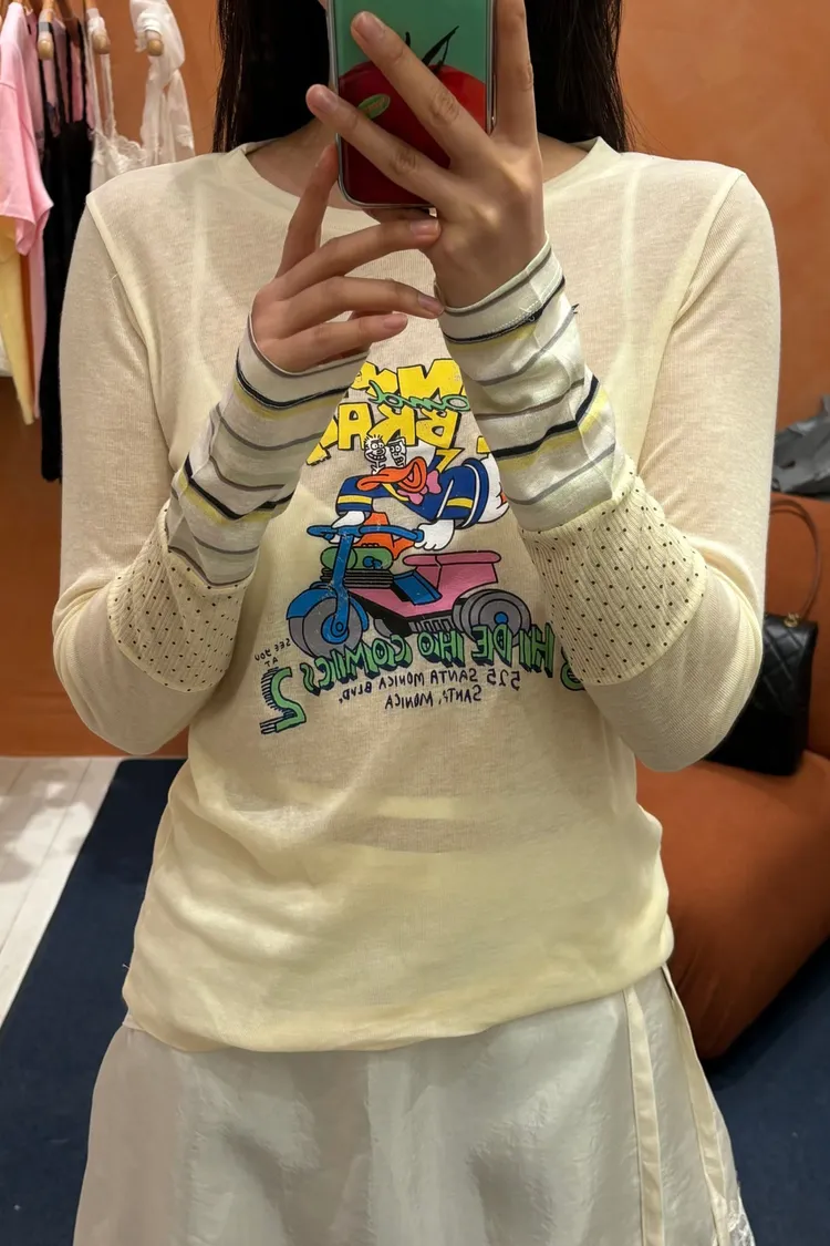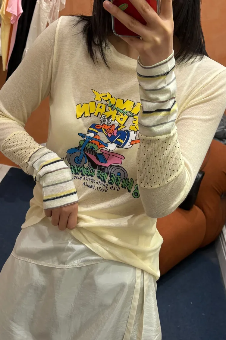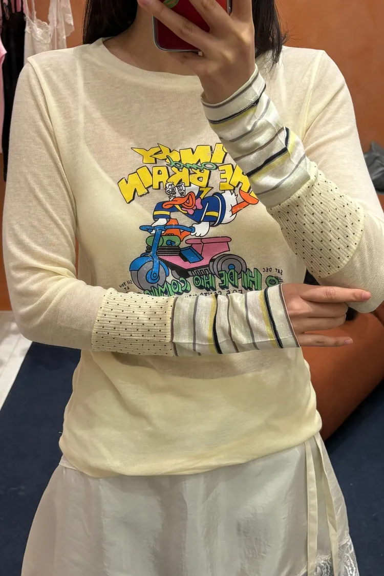 非常薄且高彈力的天絲面料,S-XL妞都可以穿 袖口有不對稱配色設計小巧俏皮 雖然穿著感比較貼身,棉花糖妞也不要害怕~ 把它當作打底來穿,搭配上背心洋、吊帶洋、連身褲穿 層次穿搭露出手袖小細節,就不會有好合身不自在的FU! 印有可愛唐老鴨趣味圖案,讓日常穿搭多了活潑幽默的小亮點 簡單搭就能散發童趣俏皮感