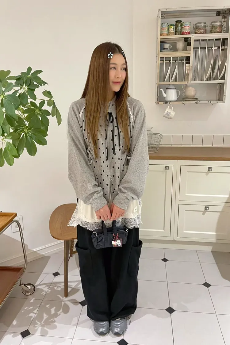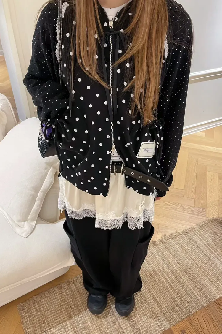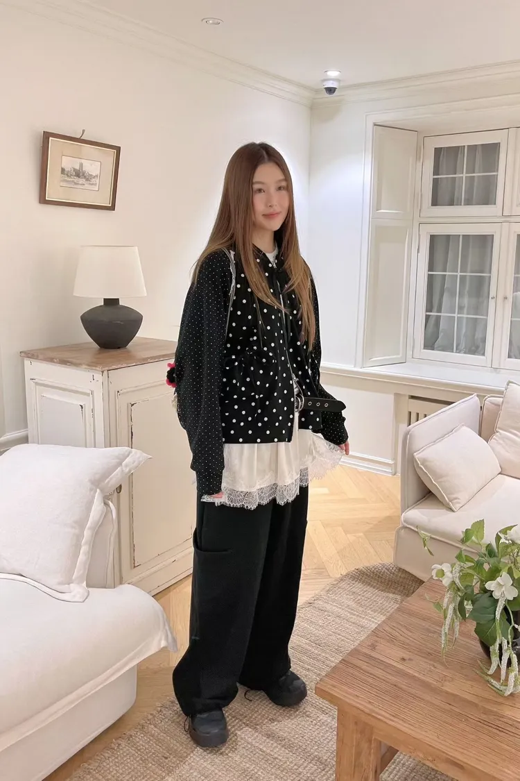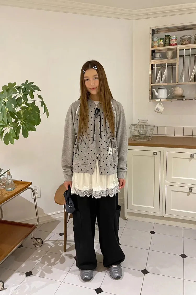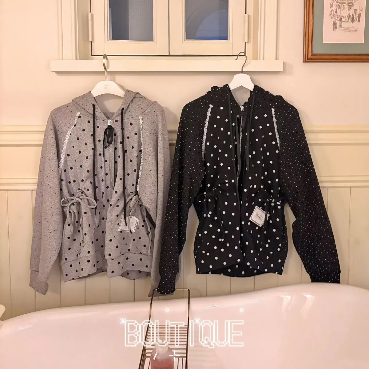 甜美與巧思一次擁有♡ 大小珍珠點點棉料材質增添活潑質感、寬鬆連帽版型,S-XL妞都可以穿 口袋頭是抽繩設計,抽緊還能有收腰效果!比例瞬間加分,超棒 雙頭拉鏈,拉鏈頭綁帶蝴蝶結小巧可愛,肩下兩側緞帶花邊拼接細節 是日常出門、拍照都加分的夢幻外套