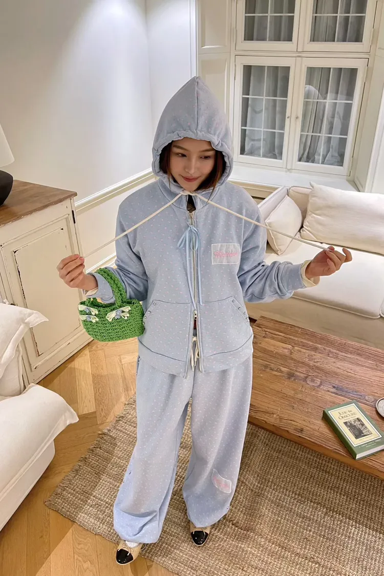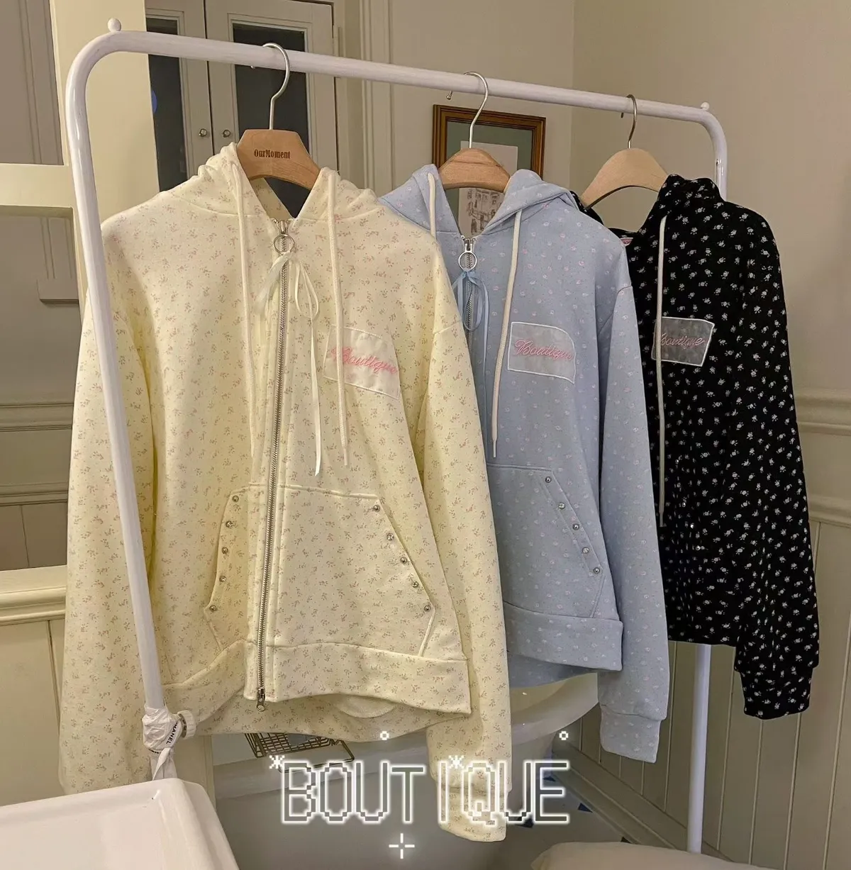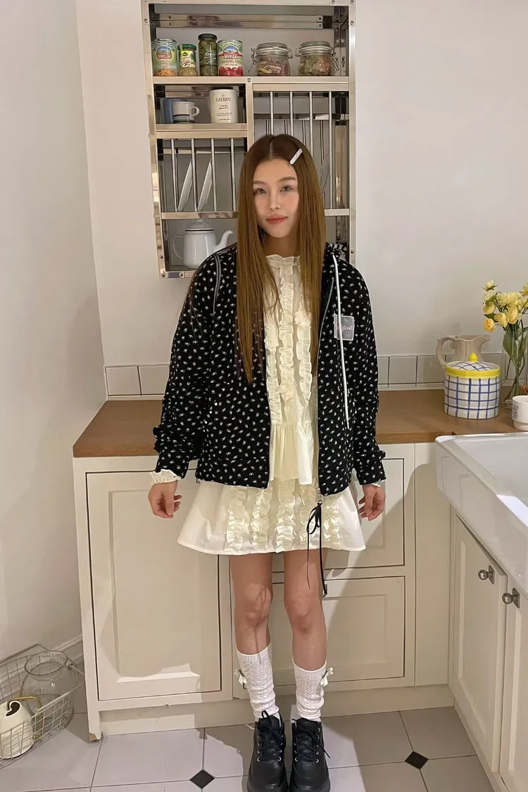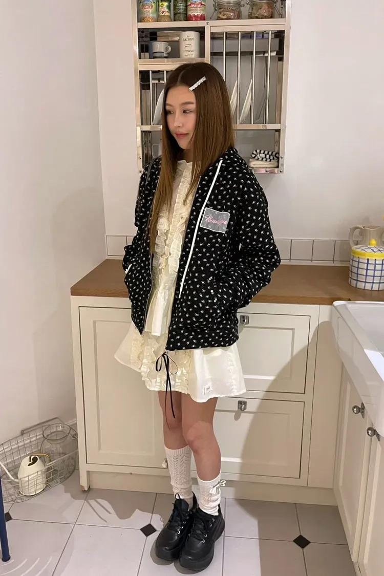 外套落肩寬鬆版型,雙頭拉鏈,其中一個拉鍊頭綁著緞帶蝴蝶結