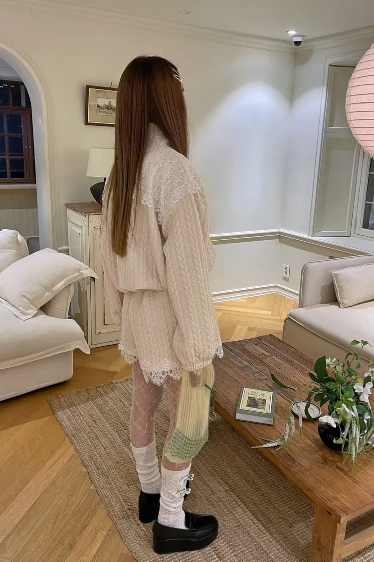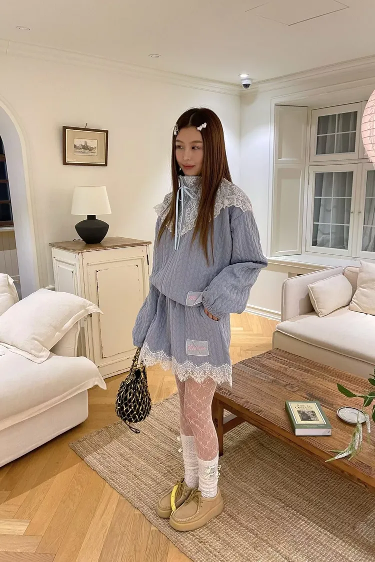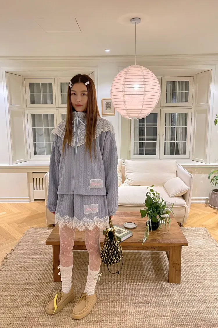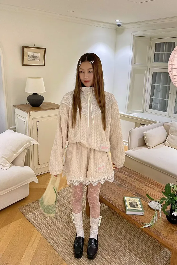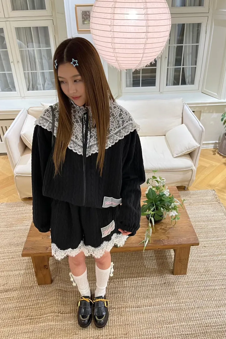 精緻又不失可愛的氛圍 立體織紋棉料材質摸起來有質感,寬鬆版型,S-XL妞都可以穿 外套立領設計,大片蕾絲拼接,衣襬有收繩可收腰,隨意調整就能穿出好比例 緞帶蝴蝶結拉鍊頭細節真的讓人心動,有口袋 短褲腰部整圈彈性鬆緊,褲腳也都有蕾絲拼接,有口袋 成套穿甜美又有存在感,單穿混搭也一樣超加分