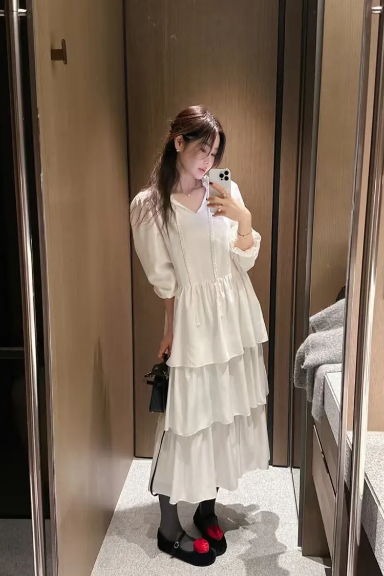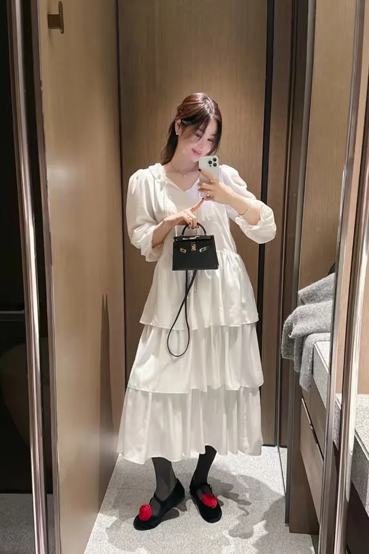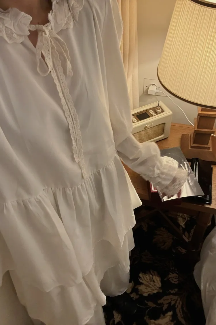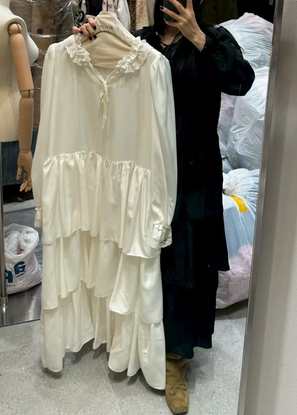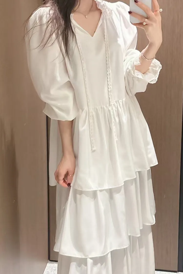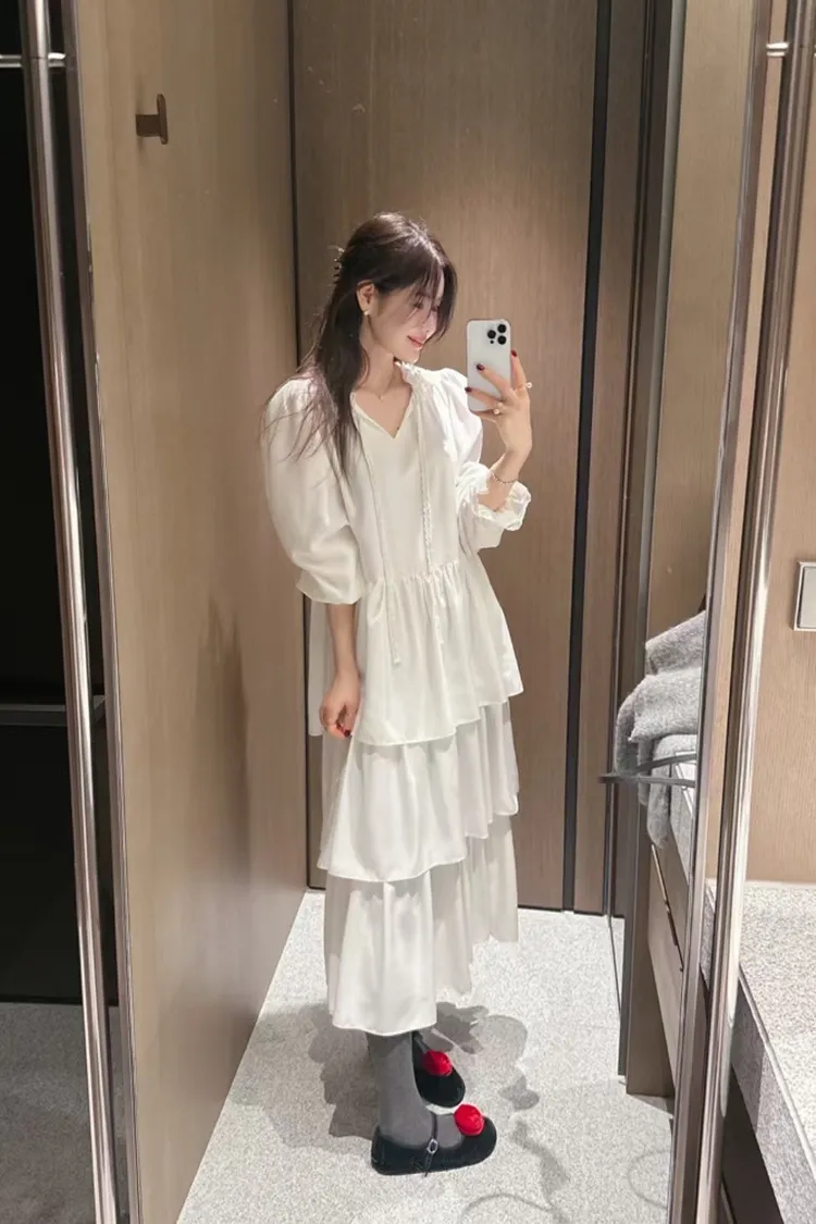 絲緞感聚脂纖維面料,穿起來輕盈舒適 層次蛋糕裙擺甜美又俏皮,修飾身型 寬鬆版型,S-L妞都可以穿 V 領搭配抓折花邊拼接緞帶蕾絲,加上可愛緞帶綁帶設計 想自然垂墜或綁成蝴蝶結都超仙氣 袖口彈性鬆緊,拼接網紗蕾絲,讓整體甜美又有層次感