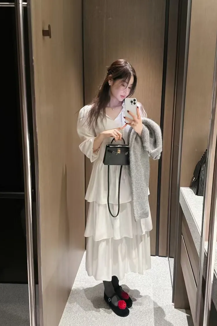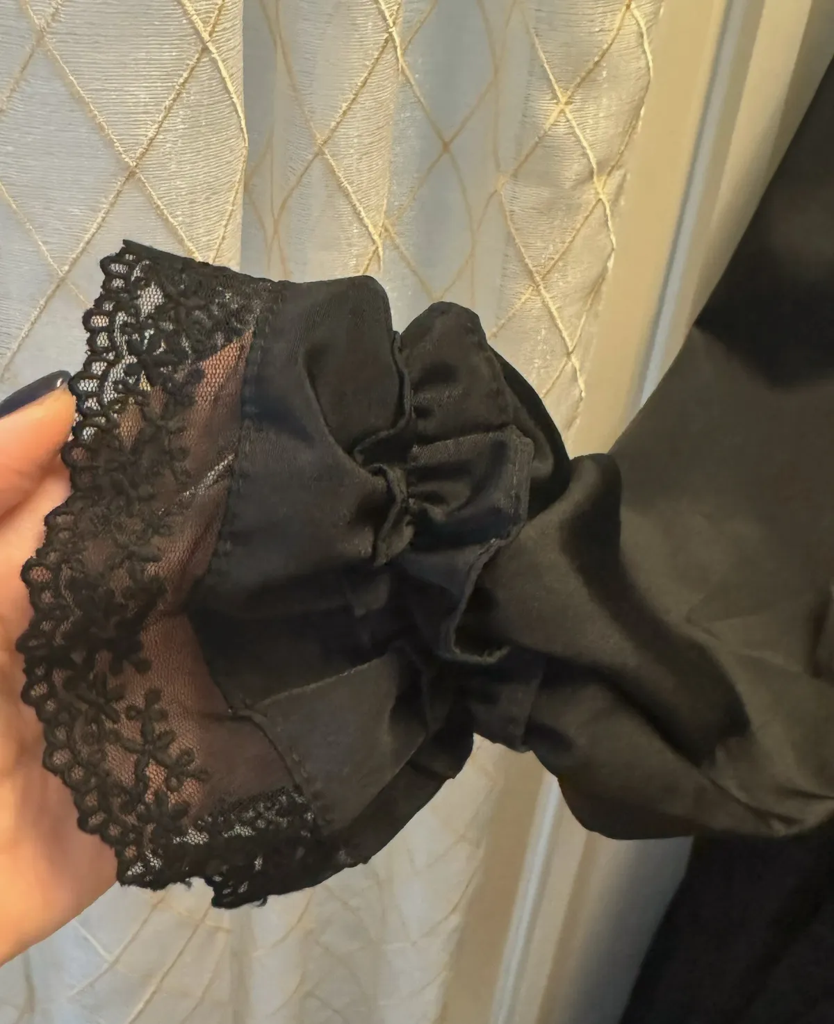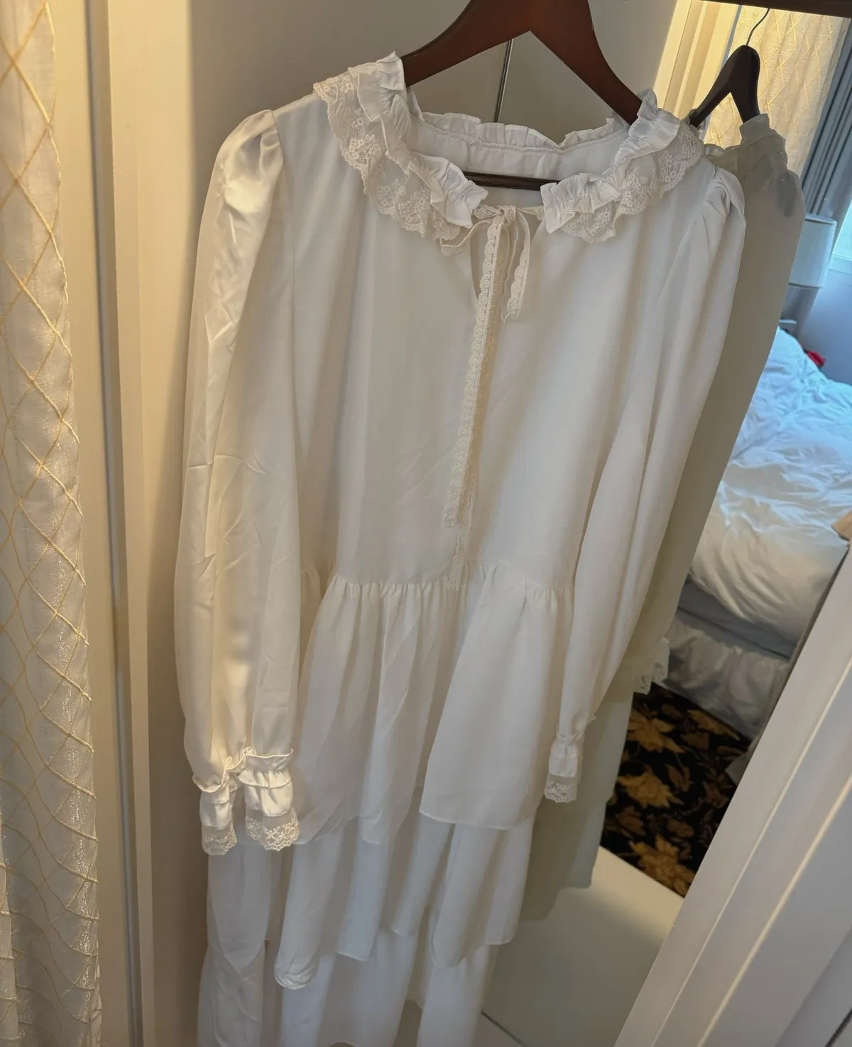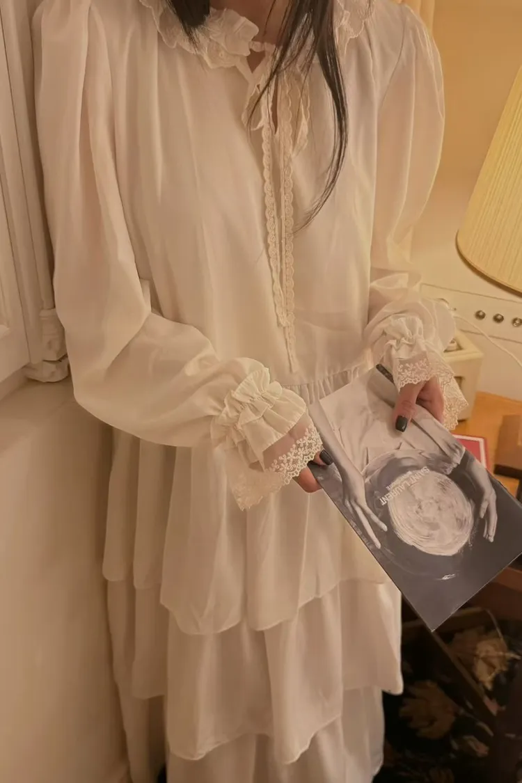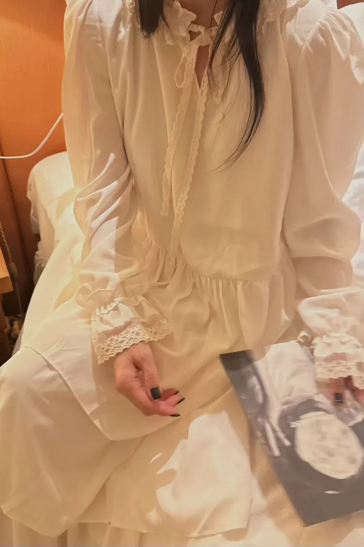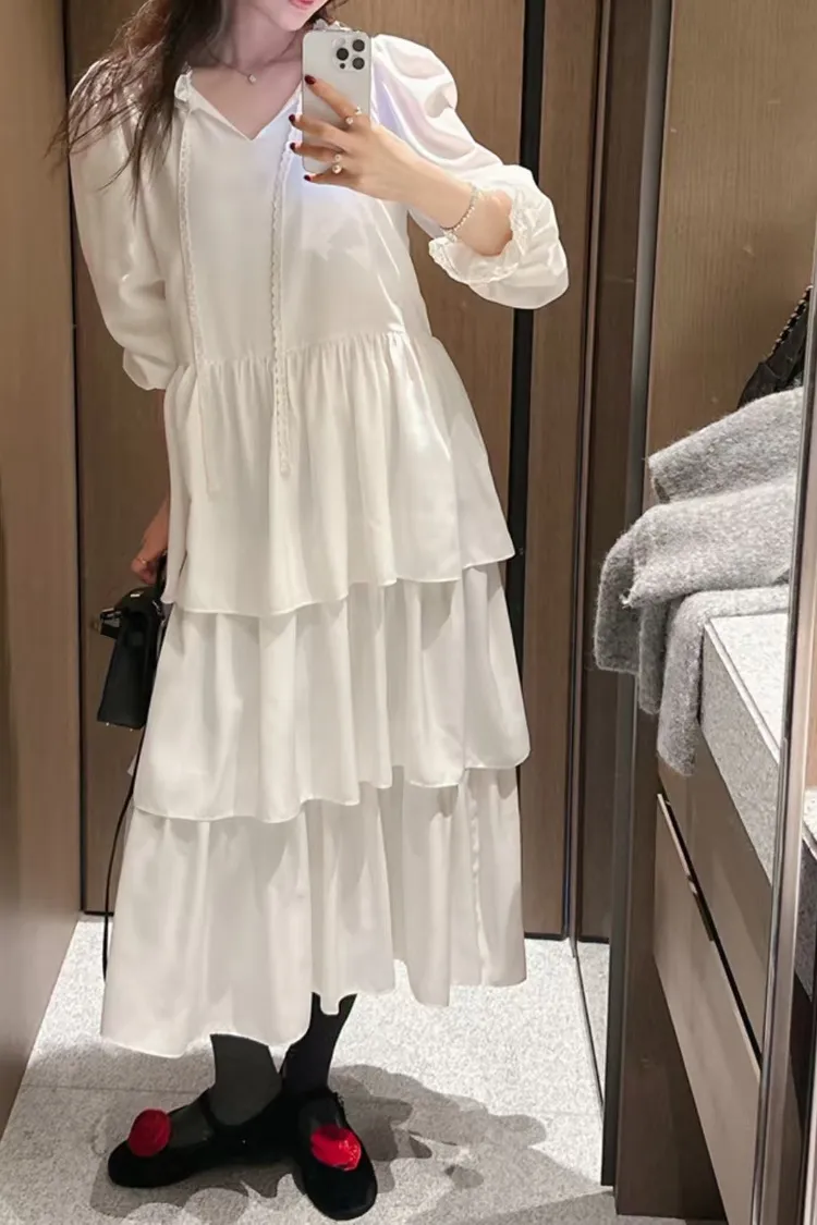 絲緞感聚脂纖維面料,穿起來輕盈舒適 層次蛋糕裙擺甜美又俏皮,修飾身型 寬鬆版型,S-L妞都可以穿 V 領搭配抓折花邊拼接緞帶蕾絲,加上可愛緞帶綁帶設計 想自然垂墜或綁成蝴蝶結都超仙氣 袖口彈性鬆緊,拼接網紗蕾絲,讓整體甜美又有層次感