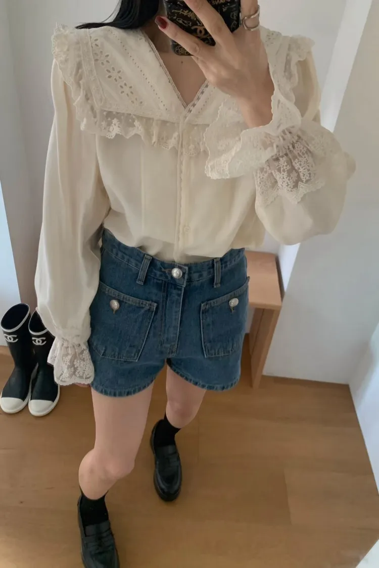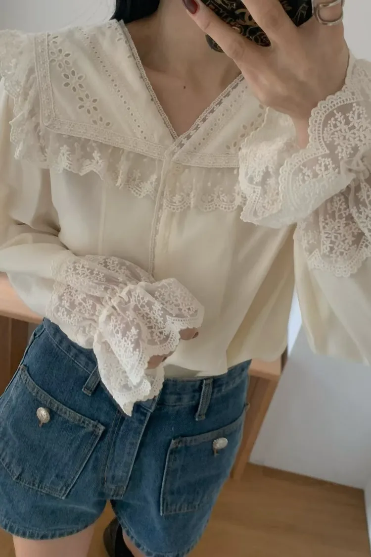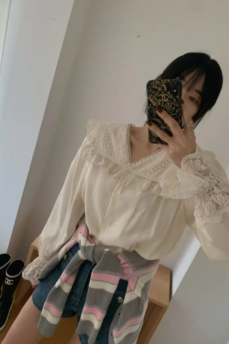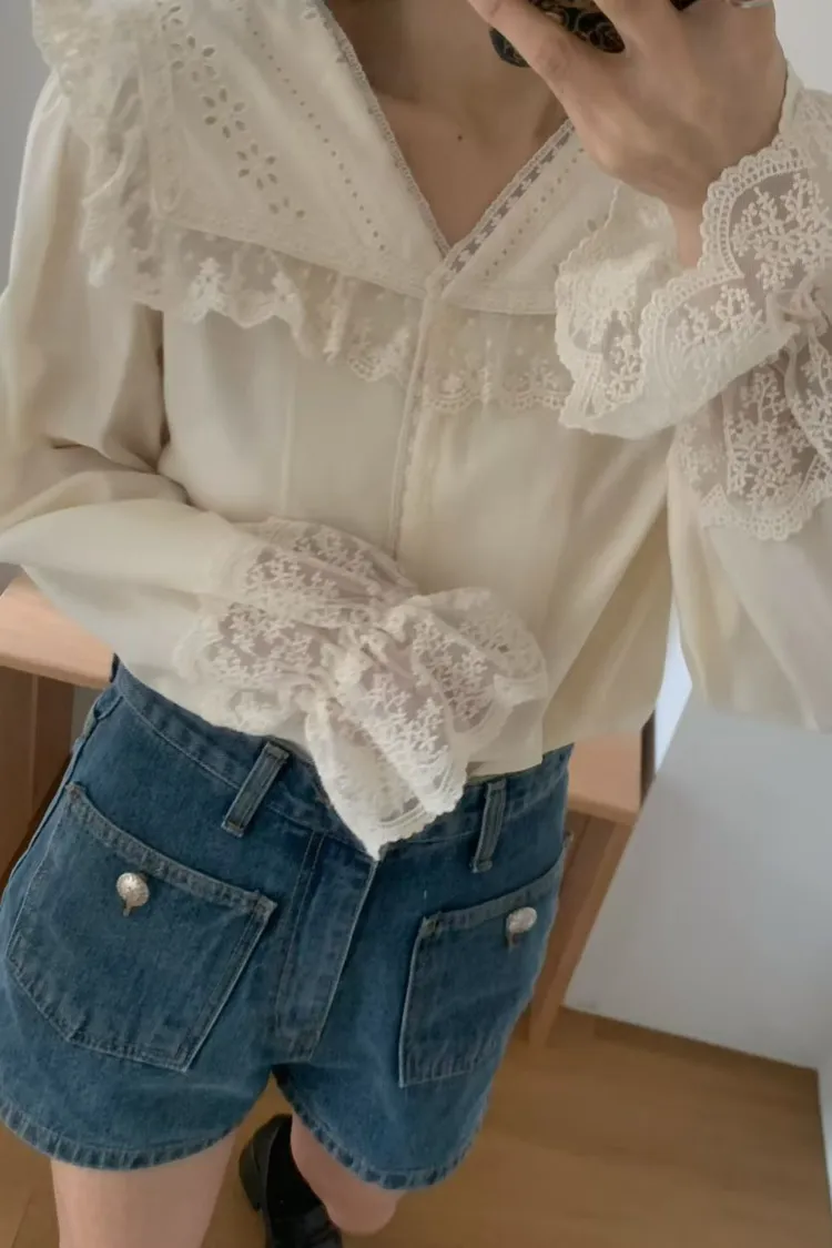 JYT07糖霜海軍蕾絲翻領襯衫上衣