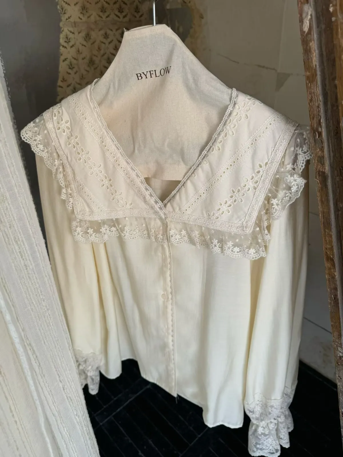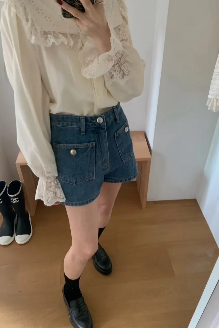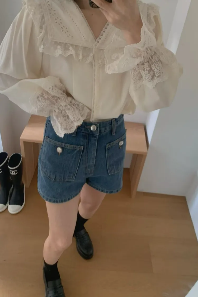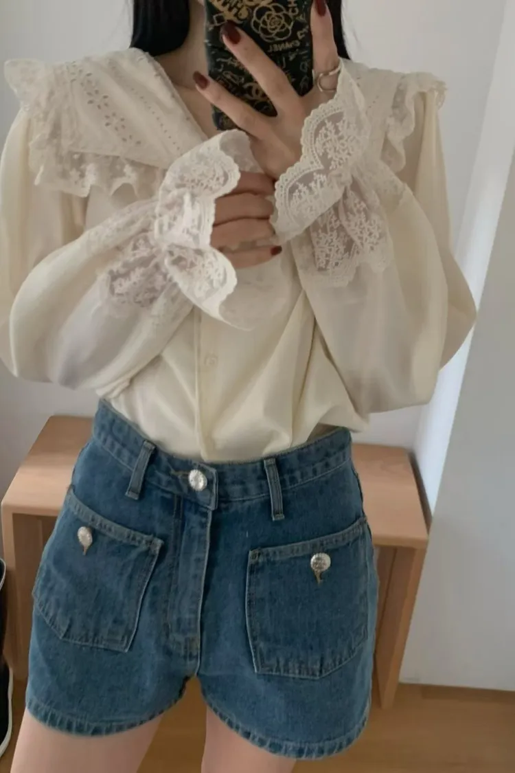 JYT07糖霜海軍蕾絲翻領襯衫上衣