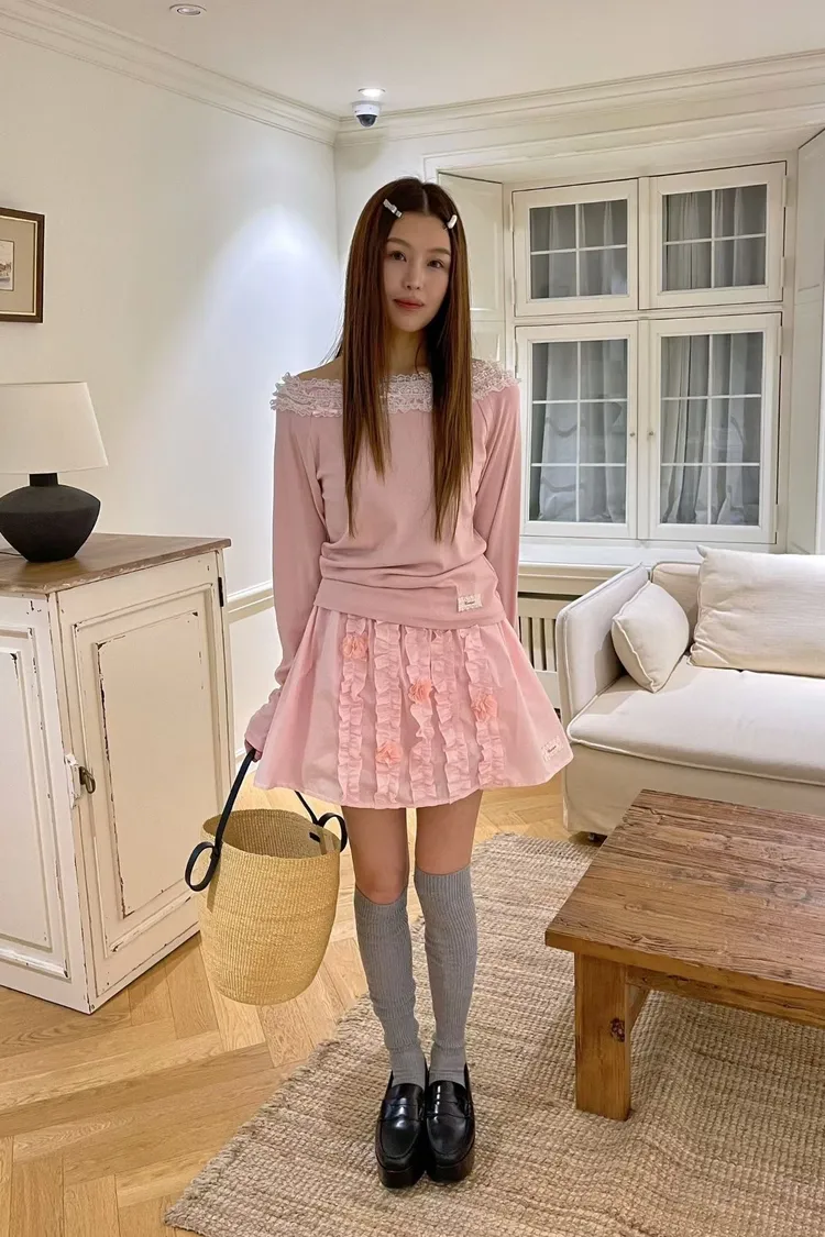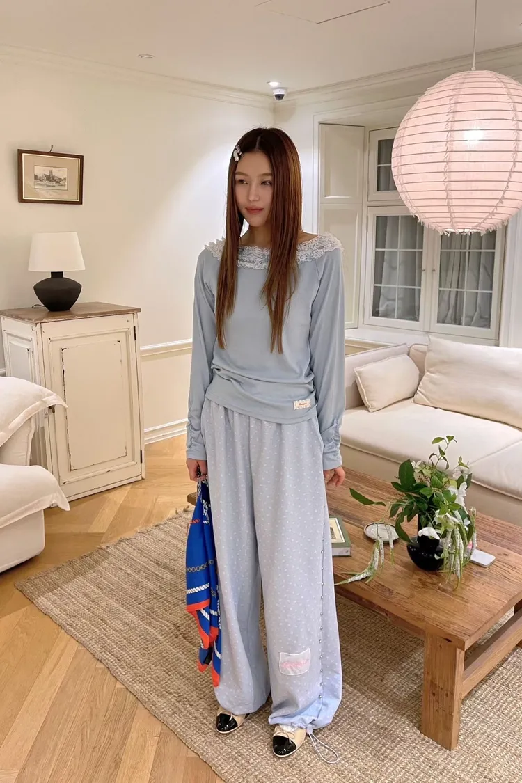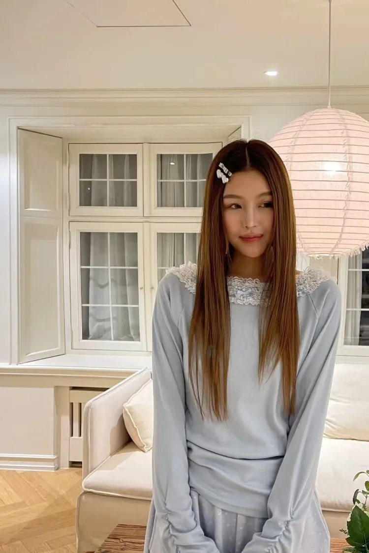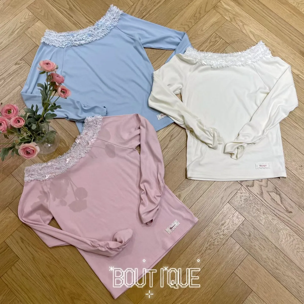 彈性棉料材質穿起來舒服不拘束、S-XL妞都可以穿 蝴蝶結絲帶蕾絲滾邊拼接,正常穿是大圓領不露肩 也可以單拉一側小露肩,或是左右都拉開當一字領穿 袖口皺折設計讓整體更有立體感 單穿或是當內搭露出領口都超美