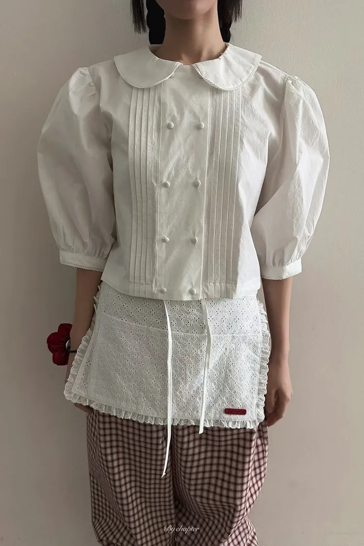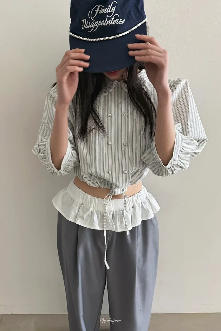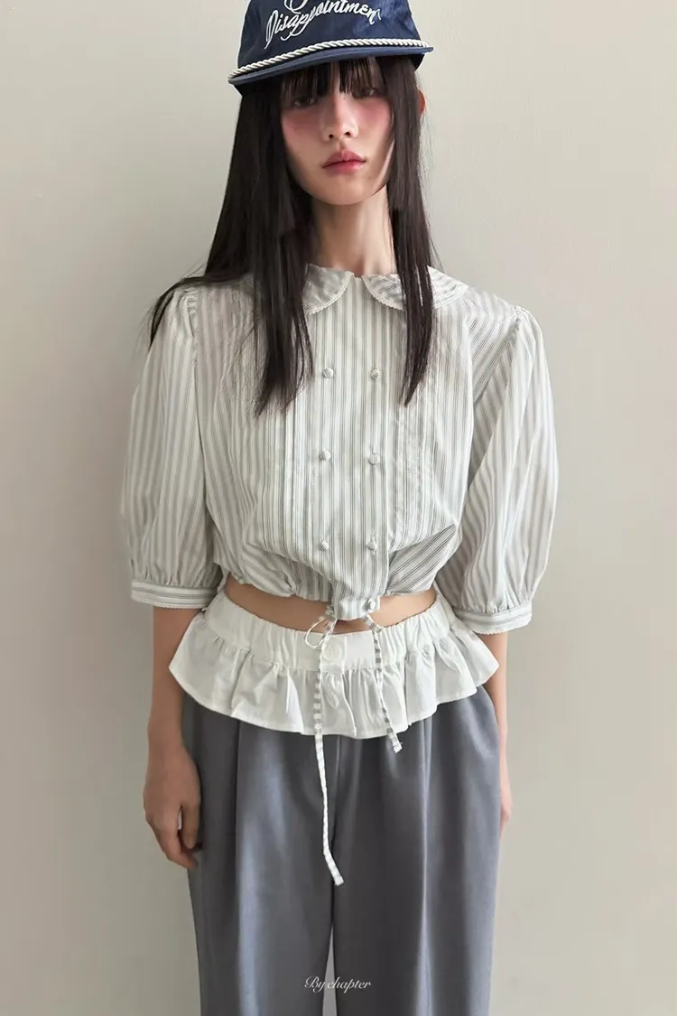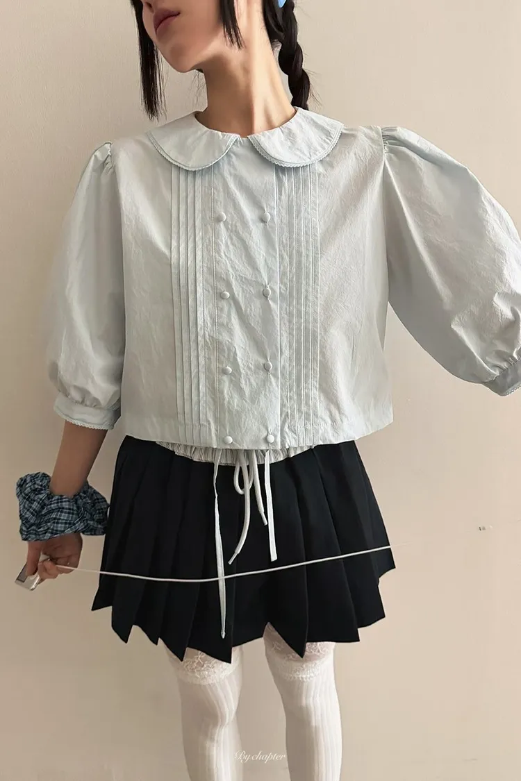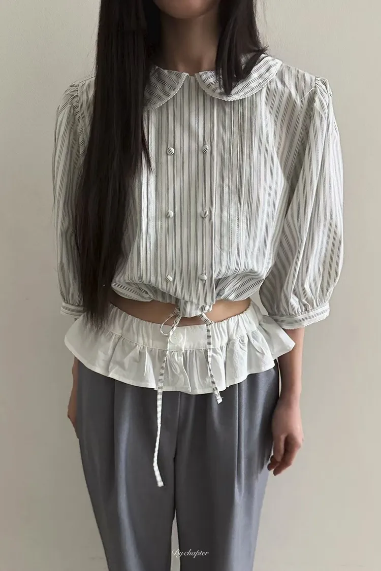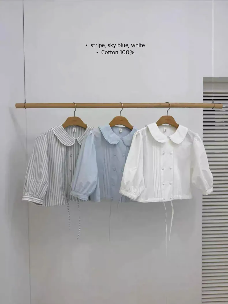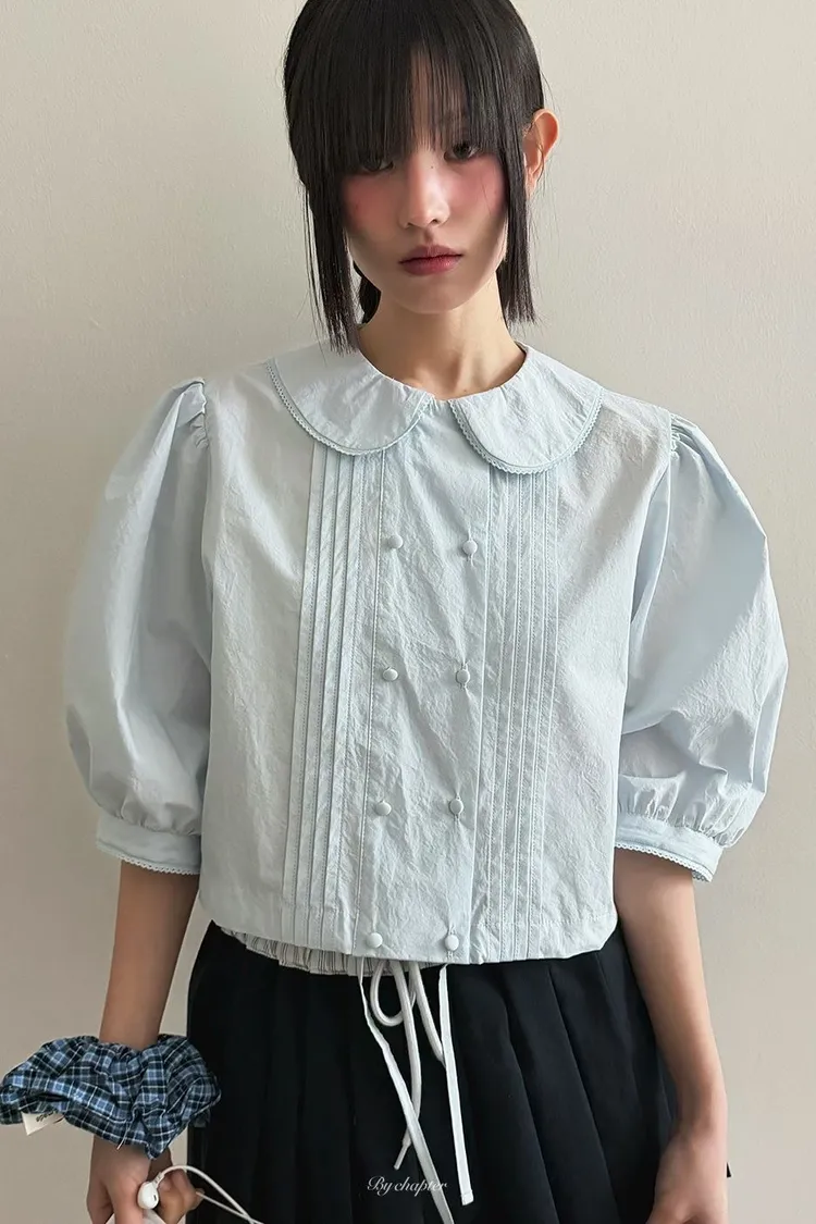 棉料材質輕盈透氣、小圓翻領搭配雙排扣設計整體感覺超級乖巧又帶點小復古氣息 排扣兩側還有打折細節,讓版型更立體有層次感 七分袖短版設計,剛好修飾比例,衣襬有抽繩可收縮,甜美中又帶點率性 歐膩說排扣打開當小罩衫穿也好看,能一路穿到夏天