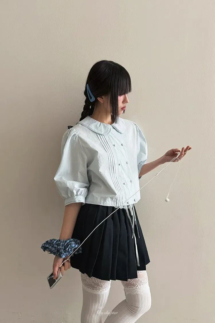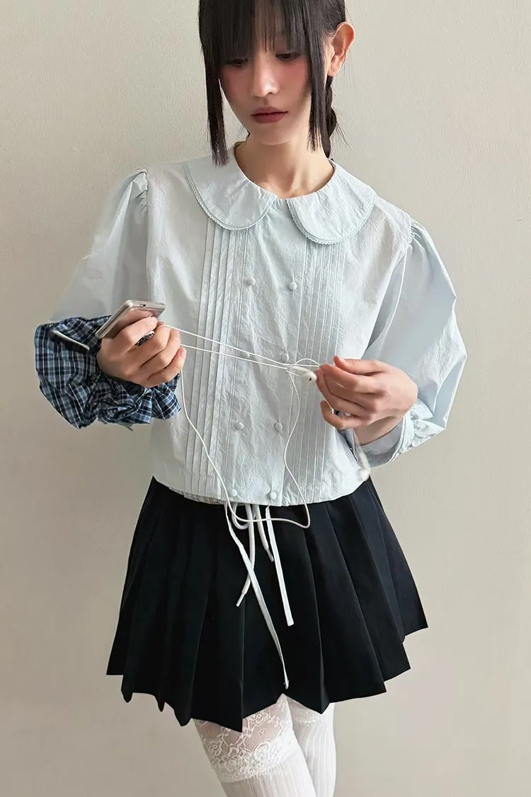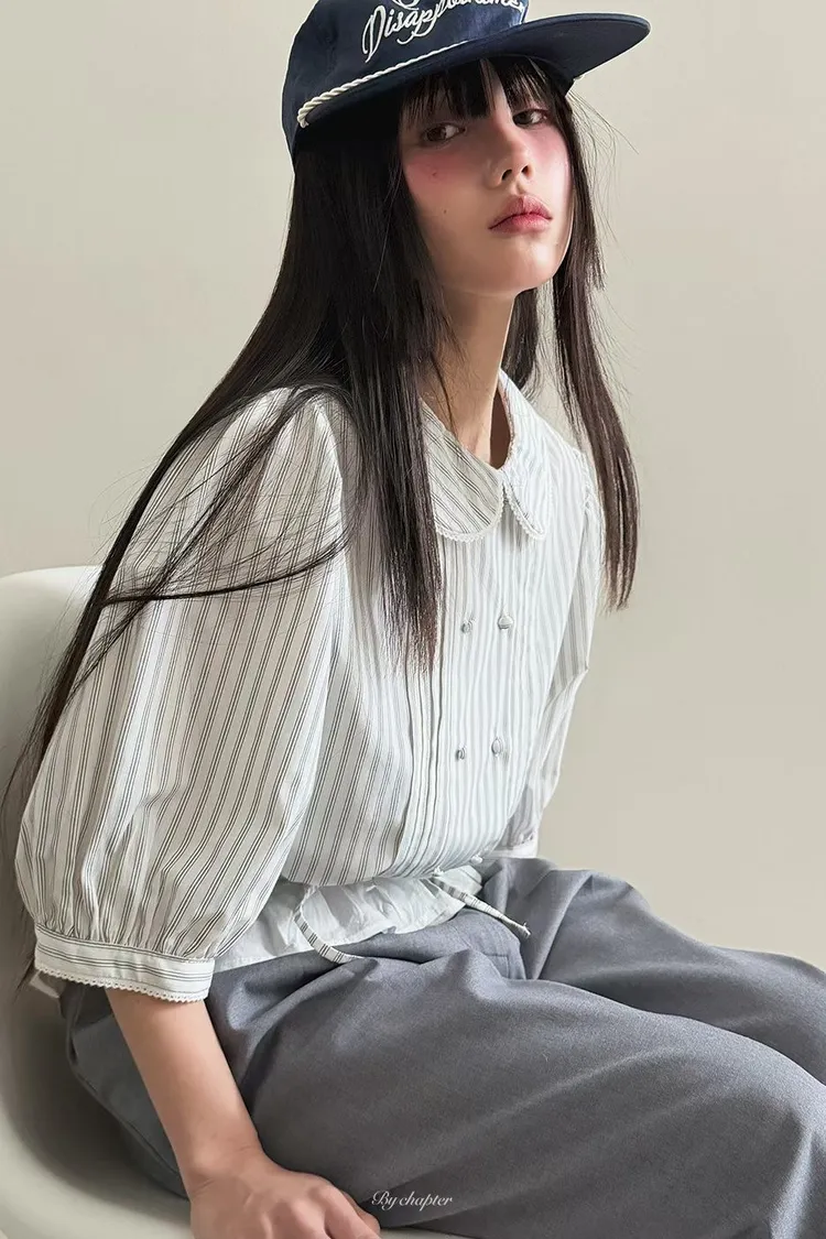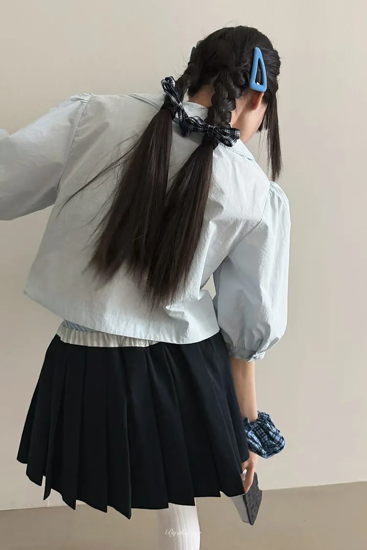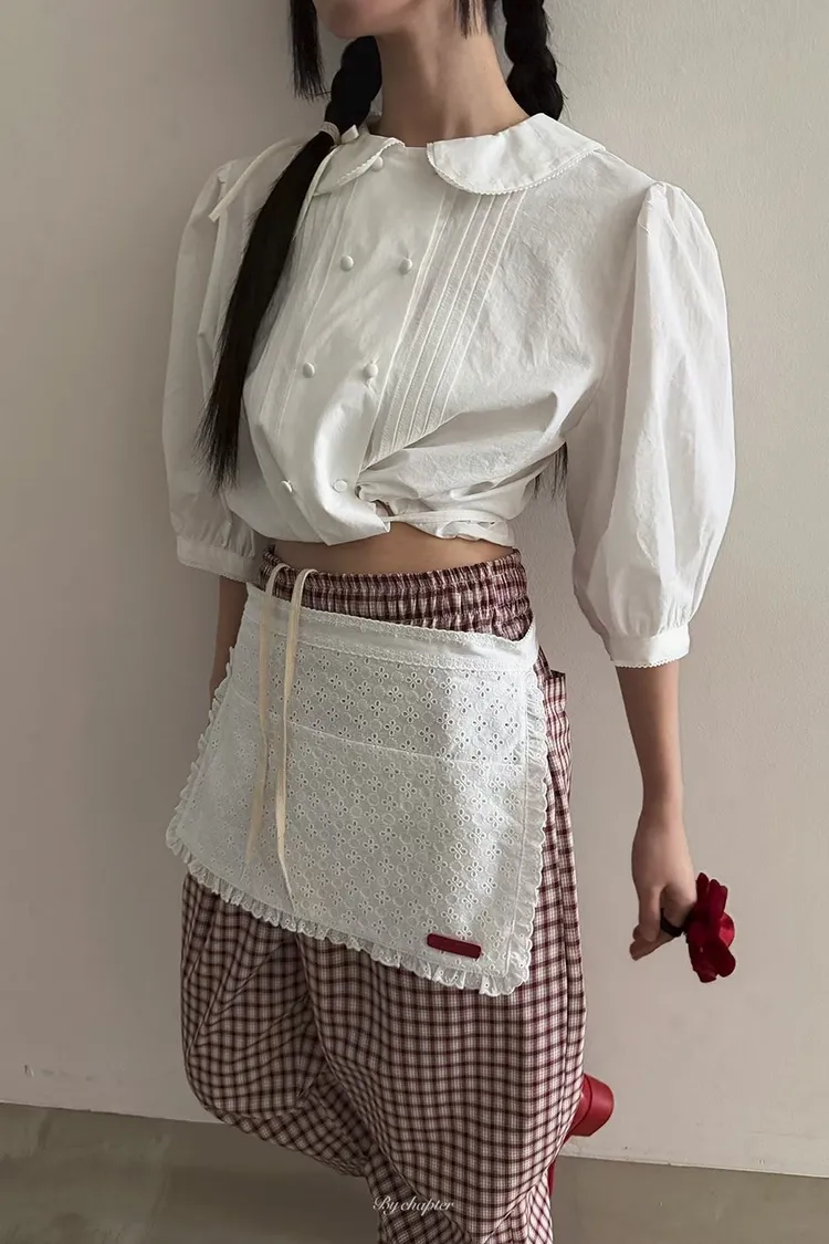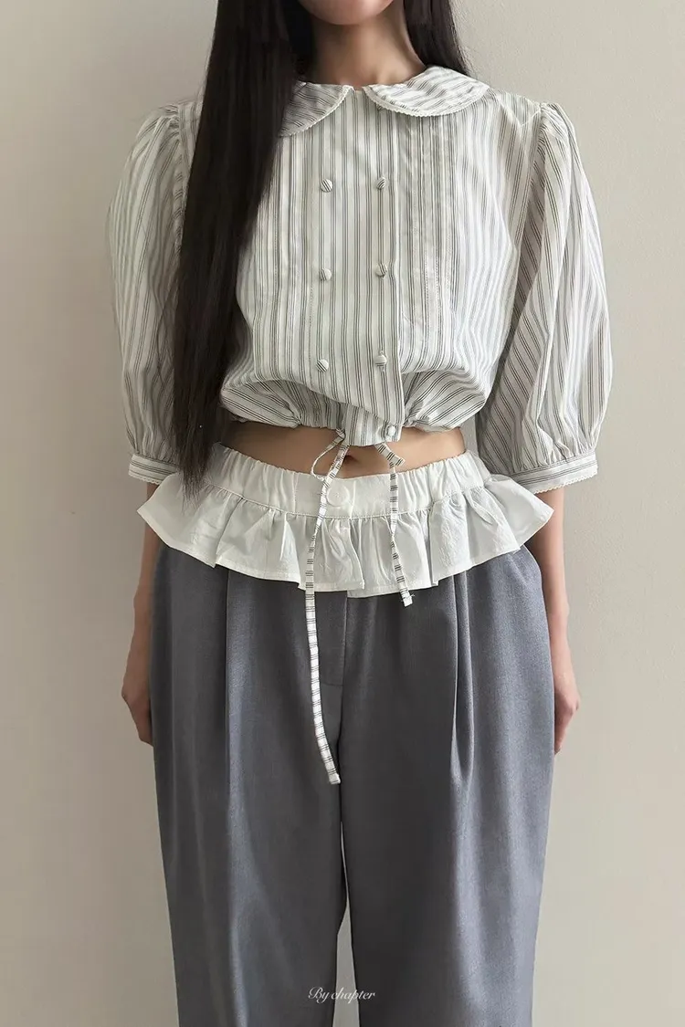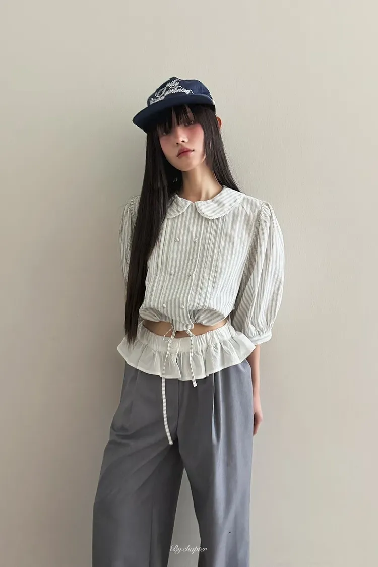 棉料材質輕盈透氣、小圓翻領搭配雙排扣設計整體感覺超級乖巧又帶點小復古氣息 排扣兩側還有打折細節,讓版型更立體有層次感 七分袖短版設計,剛好修飾比例,衣襬有抽繩可收縮,甜美中又帶點率性 歐膩說排扣打開當小罩衫穿也好看,能一路穿到夏天