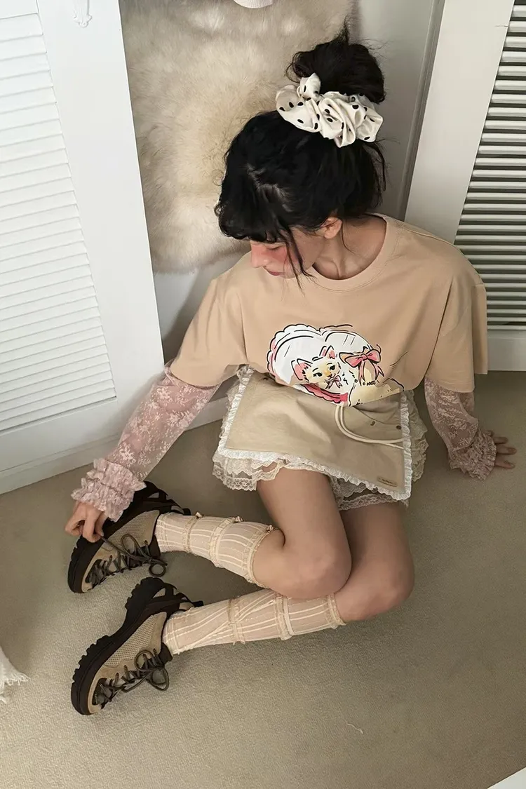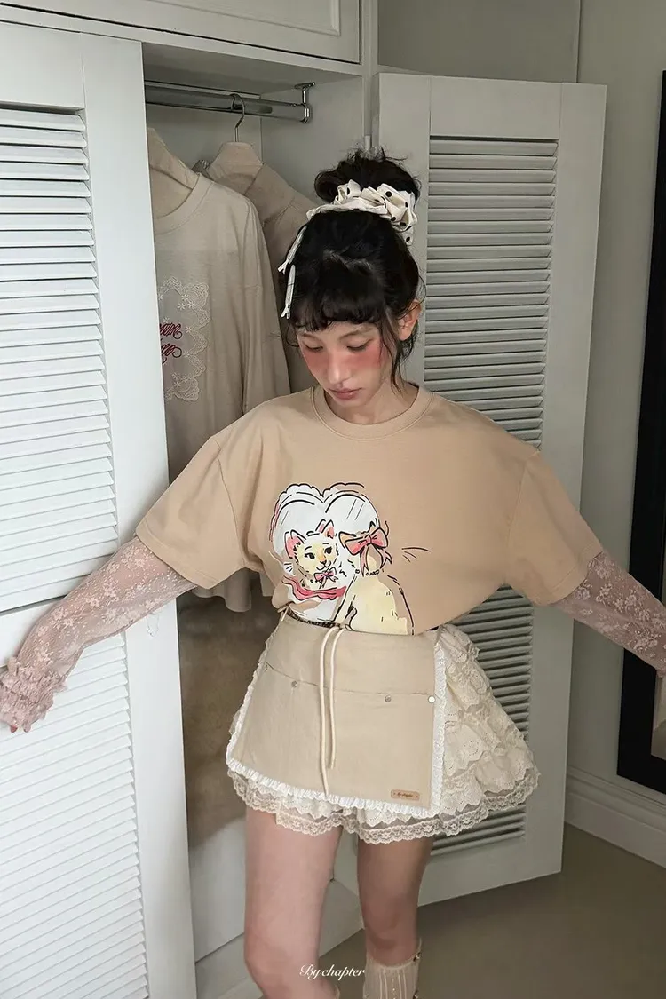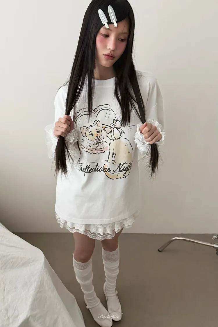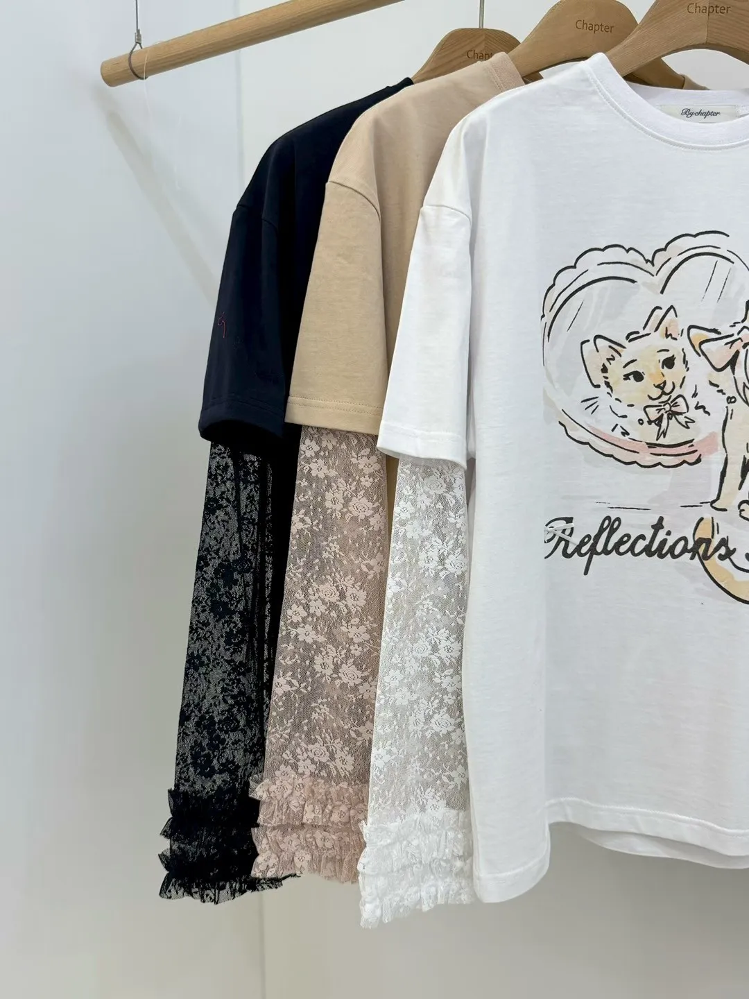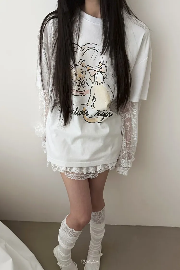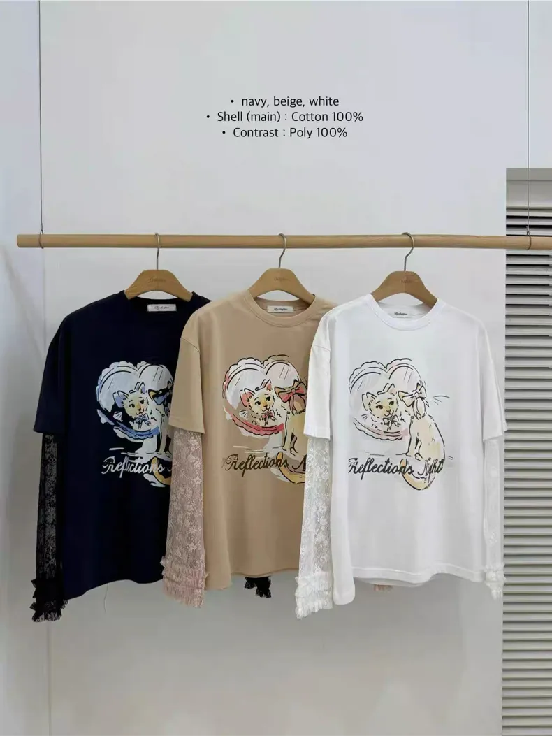 棉料材質拼接透膚蕾絲手袖,假兩件設計 一穿上就有層次感,甜美中又帶點小時髦 落肩寬鬆版型,S-L妞都可以穿,舒服又不挑身形 最吸睛的就是那隻「貓千金照鏡子」的印花圖案 帶點俏皮又很有故事感,穿出門保證被誇可愛