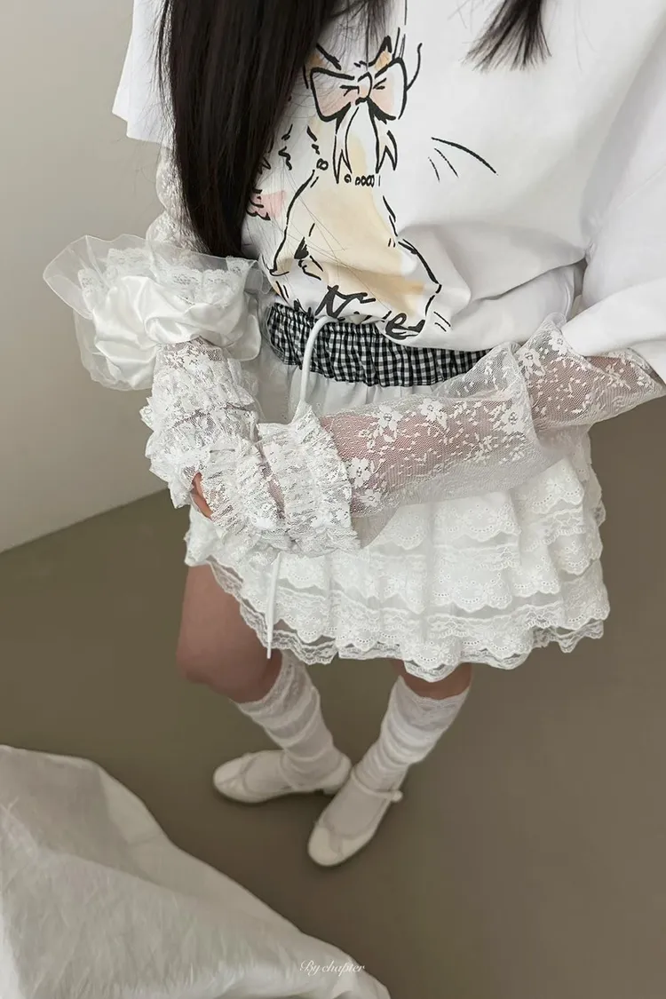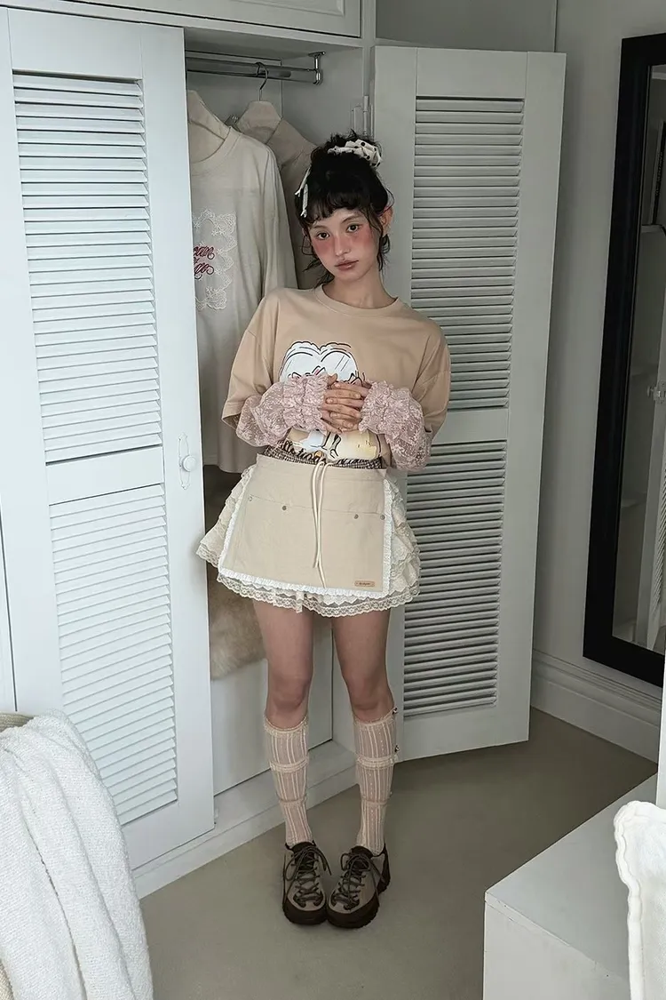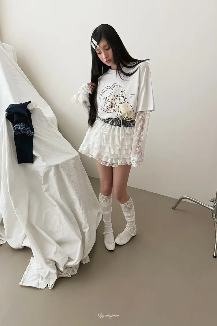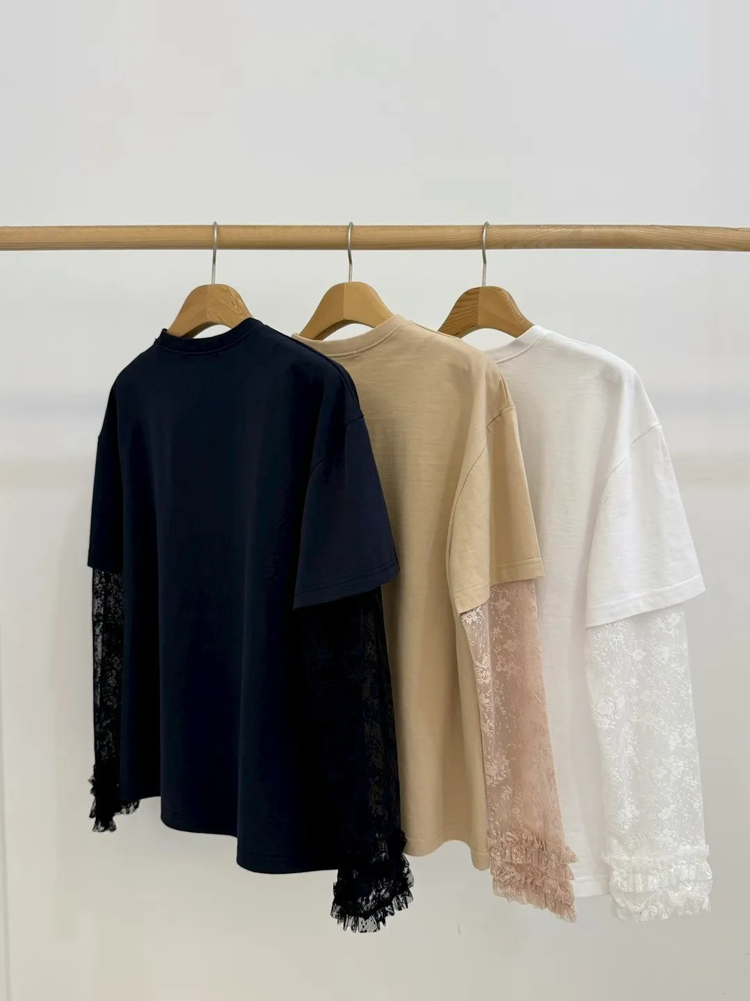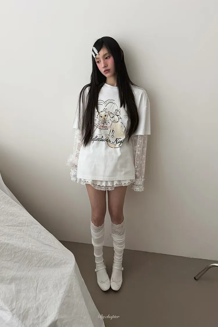 棉料材質拼接透膚蕾絲手袖,假兩件設計 一穿上就有層次感,甜美中又帶點小時髦 落肩寬鬆版型,S-L妞都可以穿,舒服又不挑身形 最吸睛的就是那隻「貓千金照鏡子」的印花圖案 帶點俏皮又很有故事感,穿出門保證被誇可愛