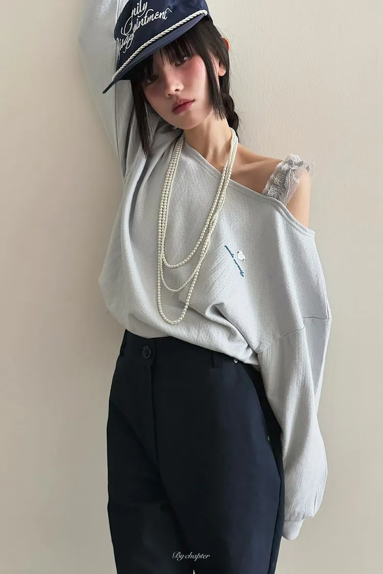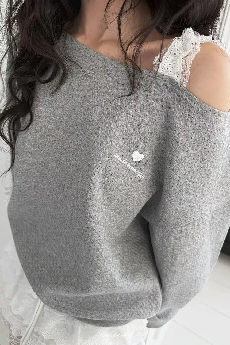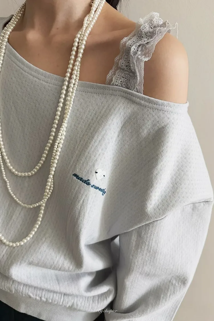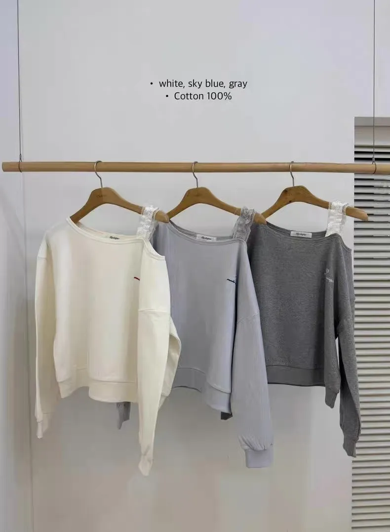 一看就很有質感又帶點甜美小巧思~ 非常柔軟的棉料自帶紋理感,單肩有棉蕾絲和網紗蕾絲層次拼接的肩帶設計 讓整體多了幾分精緻與浪漫感,穿起來輕鬆卻很有造型亮點 寬鬆版型,S-L妞都可以穿 胸口有小小刺繡和母貝小愛心,低調卻很加分 韓國熱銷色是白、藍