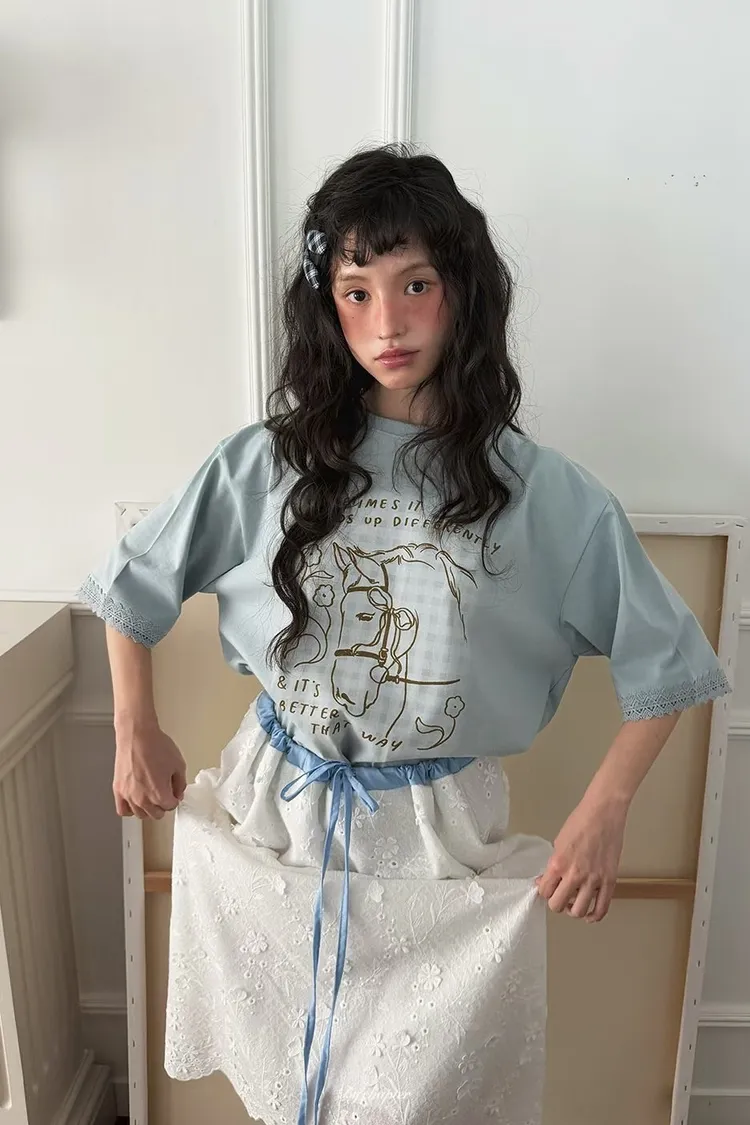一穿上就是滿滿的童趣時髦感~ 棉料材質、落肩寬鬆版型,舒服好駕馭,S-L妞都可以穿出可愛鬆弛感 胸前的塊狀格紋設計裡,加入線條畫風的花朵、馬和俏皮字母標語 整體很有設計感又帶點復古小文青氛圍 袖口蕾絲拼接細節,讓休閒中多了幾分甜美精緻感