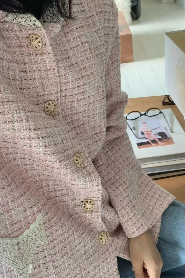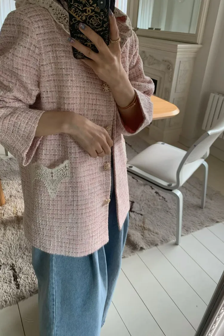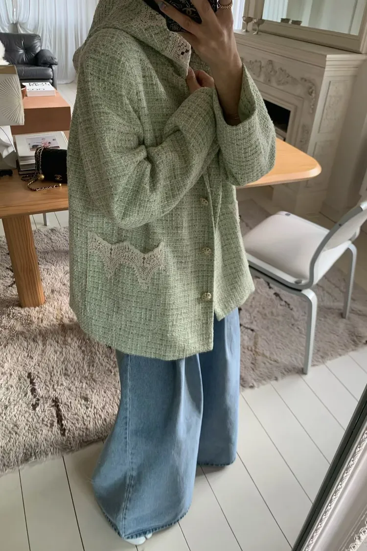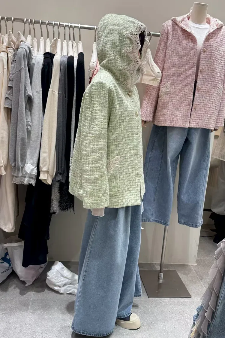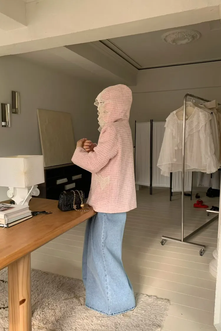JYU03小香軟呢雕花蕾絲拼接連帽外套