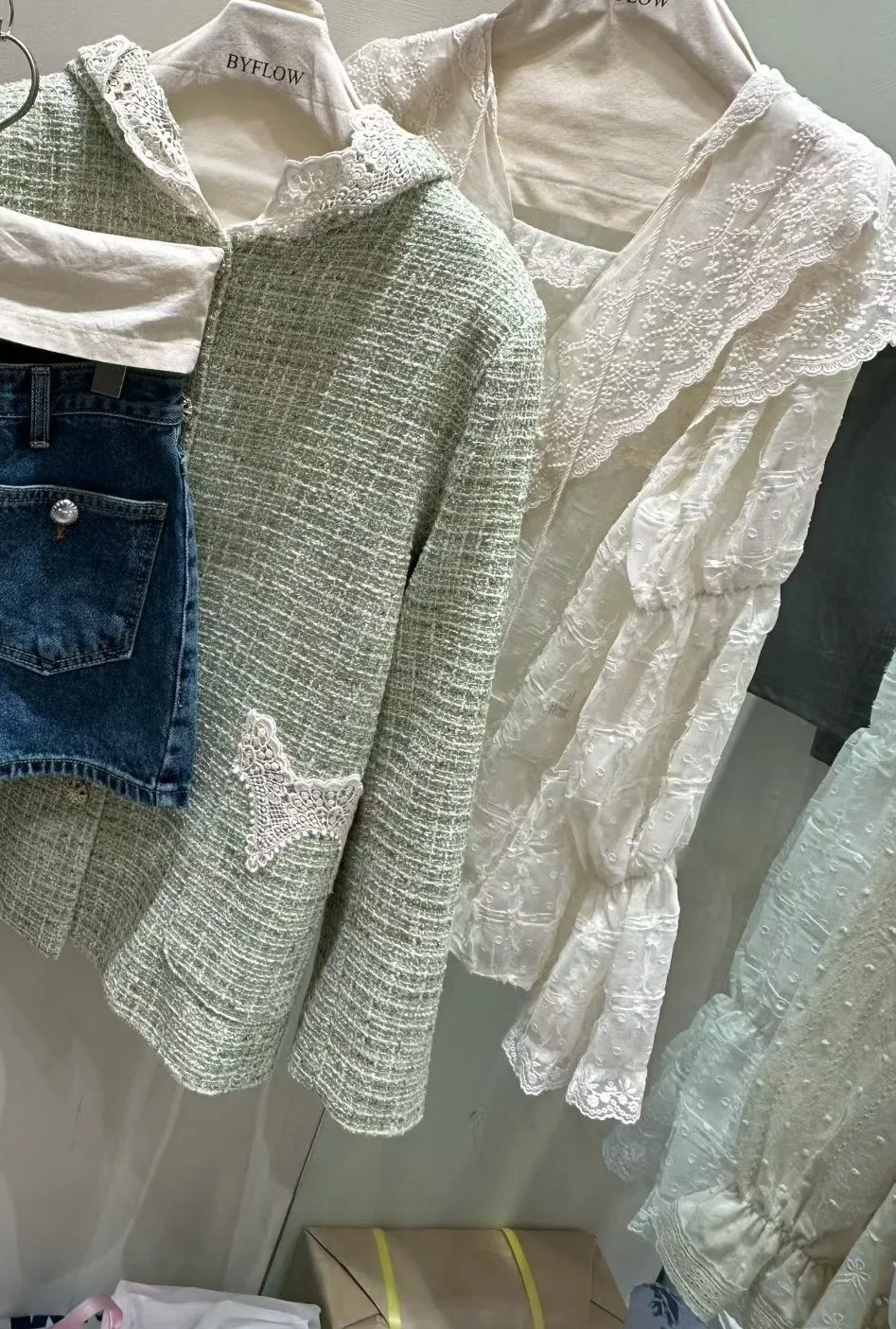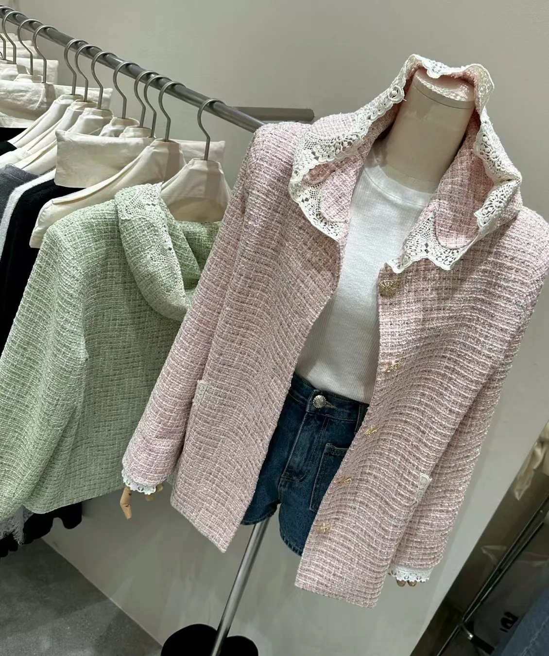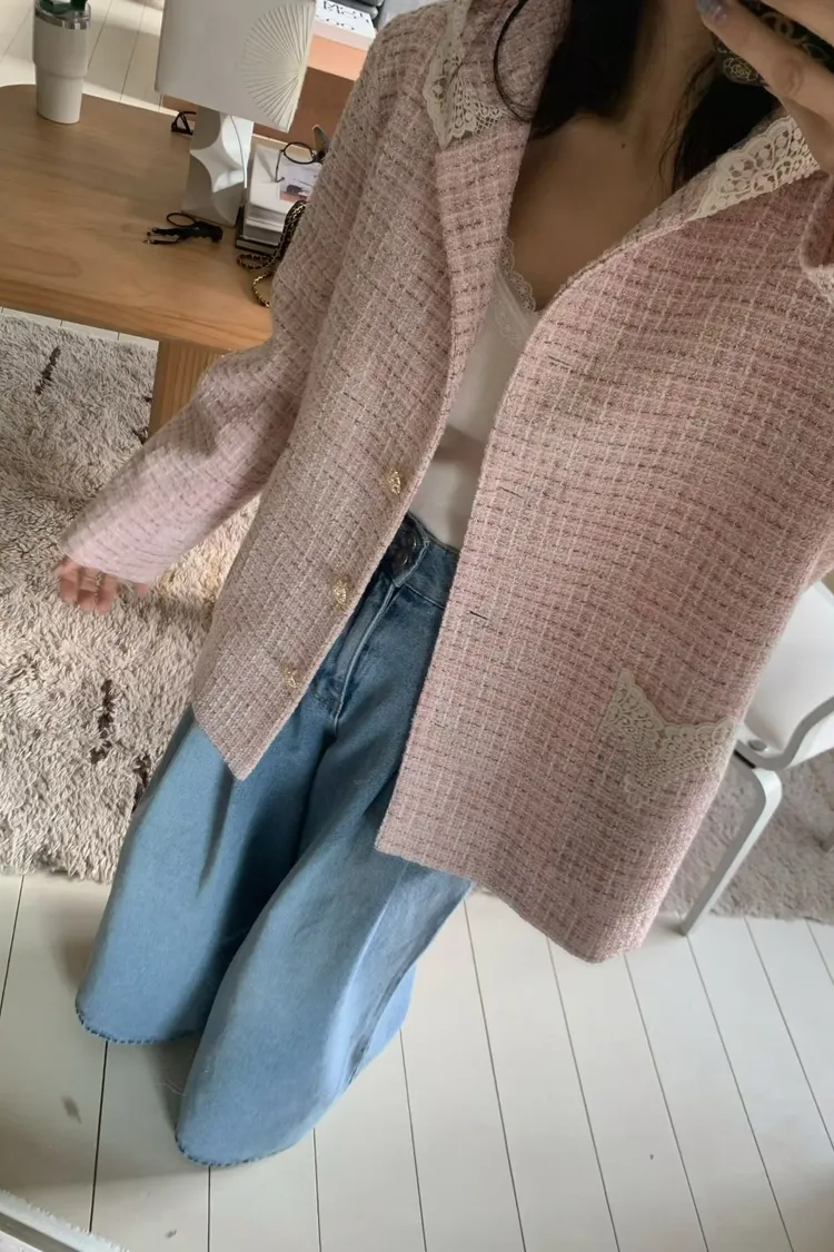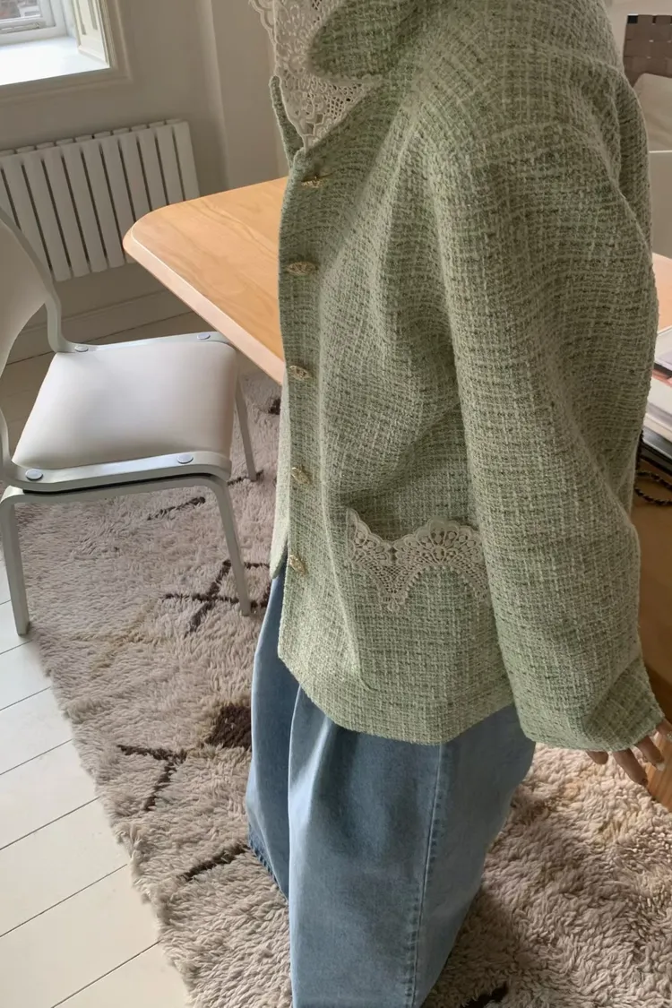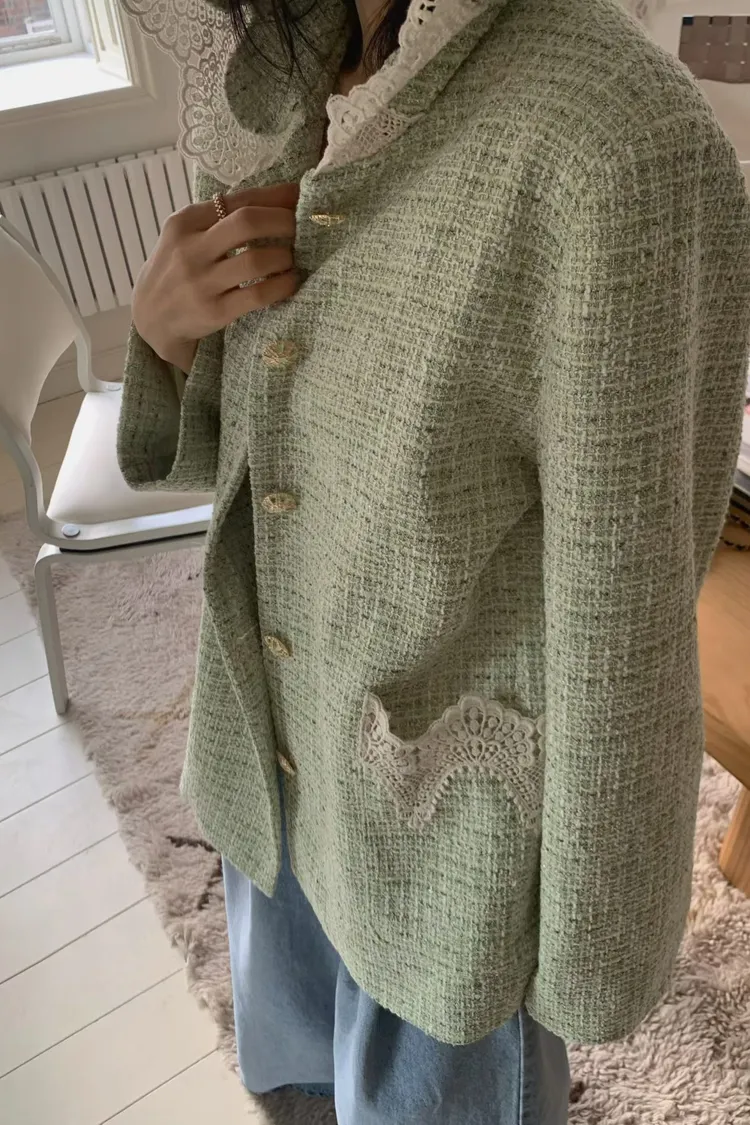 JYU03小香軟呢雕花蕾絲拼接連帽外套