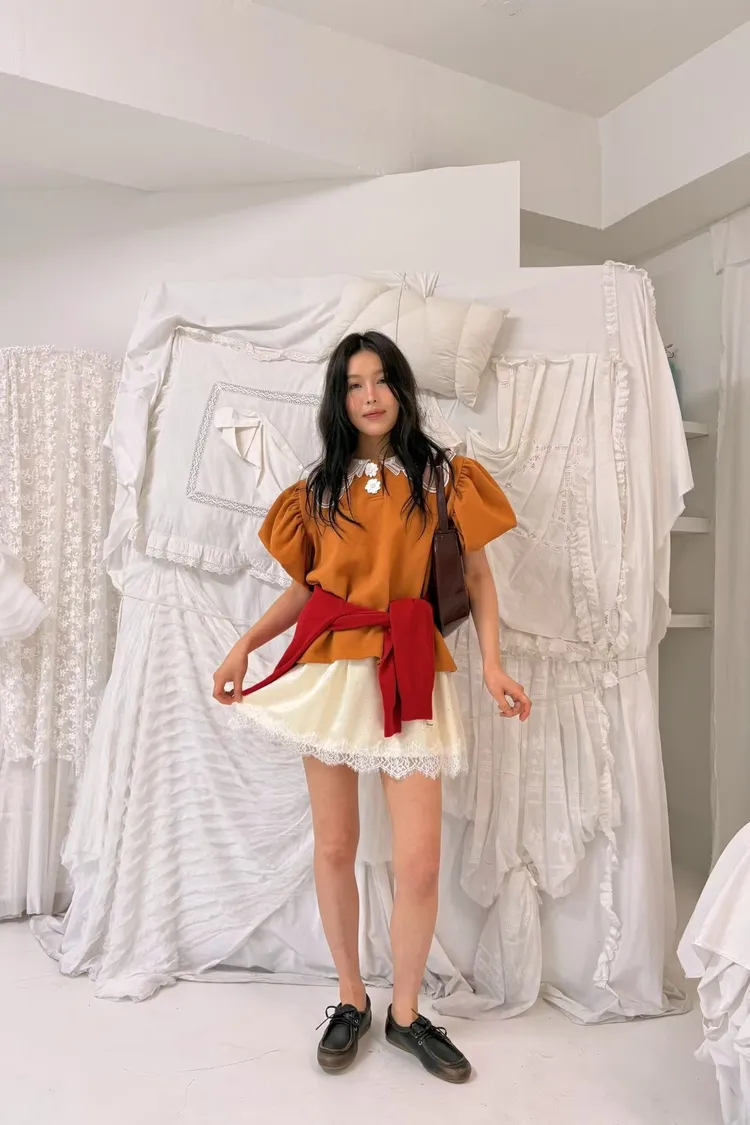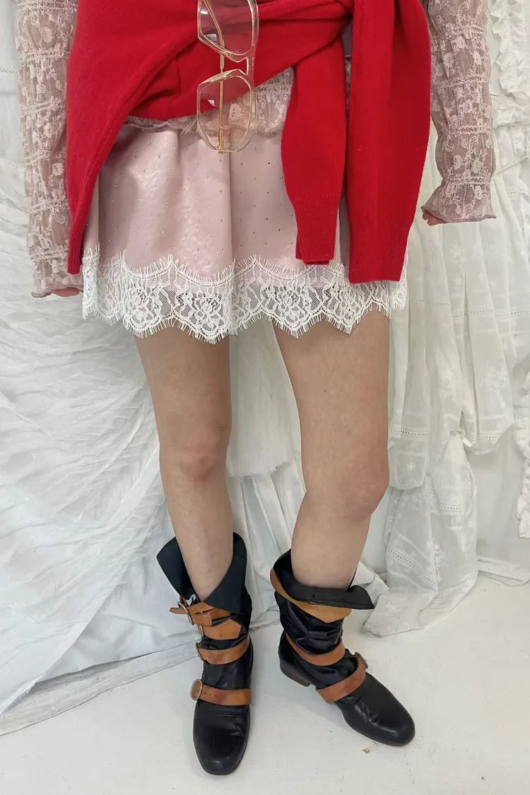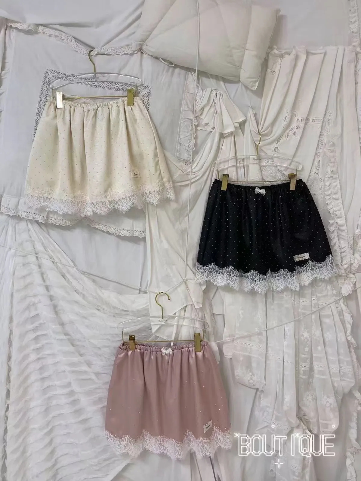 讓人忍不住多看兩眼✨ 帶有閃閃水鑽的絲光面料,肉眼看很閃~ A字版型穿起來腿部比例瞬間被拉長,輕鬆修飾線條 睫毛蕾絲滾邊拼接,細節感滿滿,小小浪漫又帶一點甜美感 內裡是小短褲!不走光 腰部整圈彈性鬆緊,S-L妞都可以穿