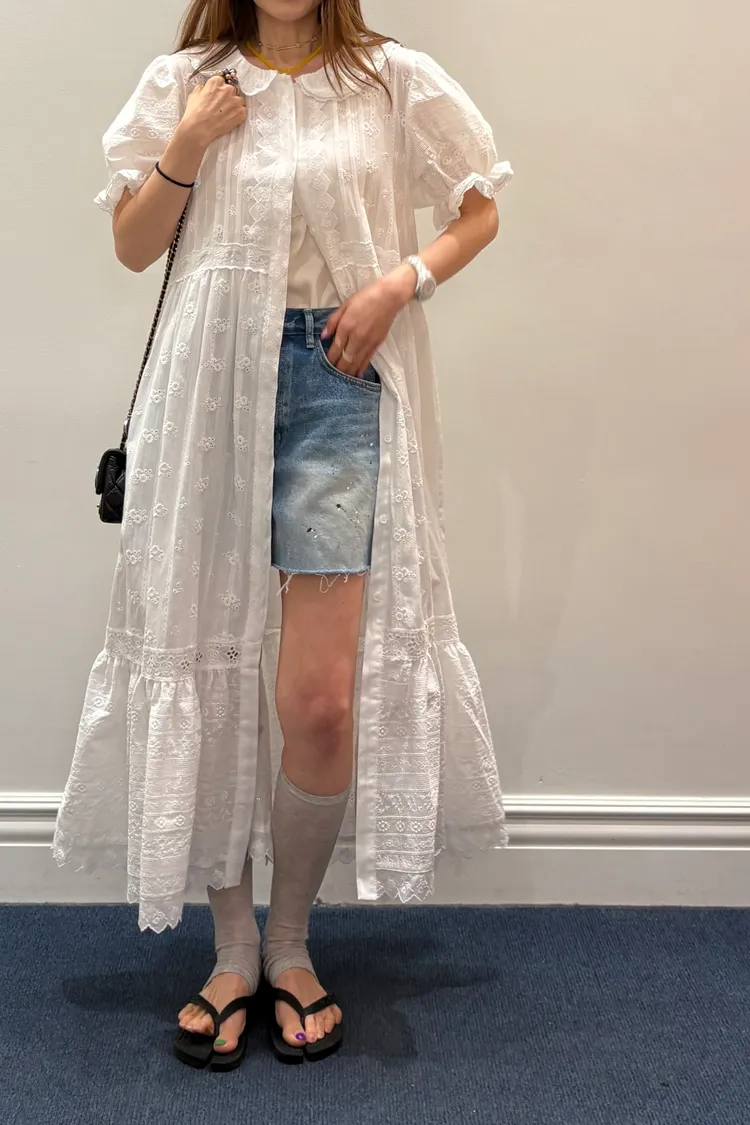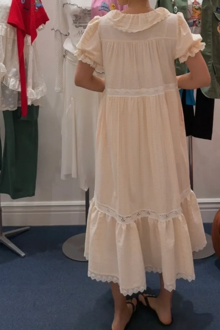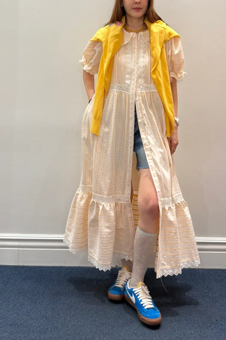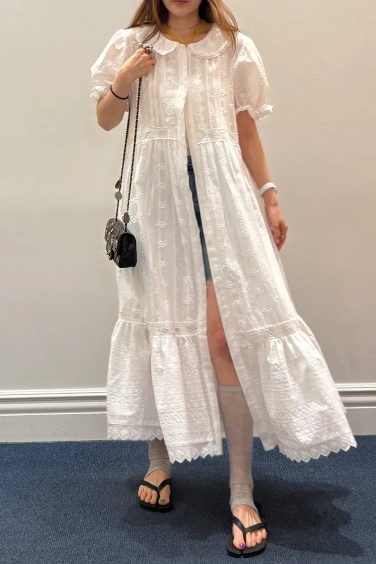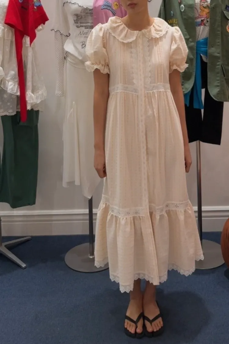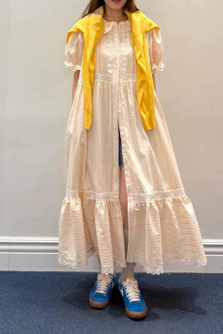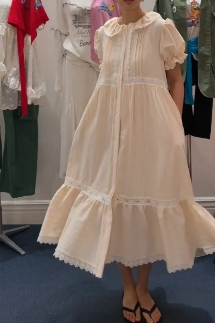 一穿上就是滿滿初戀感♡ 棉料材質,娃娃領排扣寬鬆版型,S-L妞都可以穿,清新又舒服 白色款是布蕾絲面料,藍色、橘黃是小花花棉料材質 領口、袖口、腰間、裙擺都有拼接刺繡蕾絲織帶,細節精緻又溫柔 有內襯、有口袋 全扣當洋裝、開釦當罩衫穿都好看 韓國熱銷色是白蕾絲