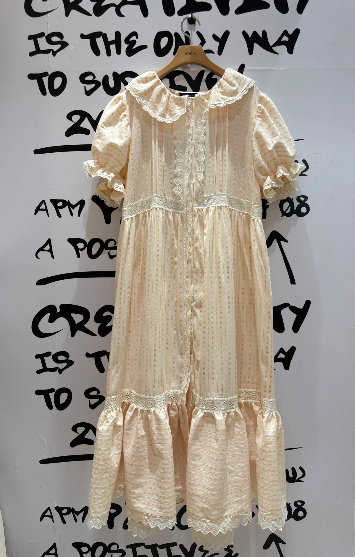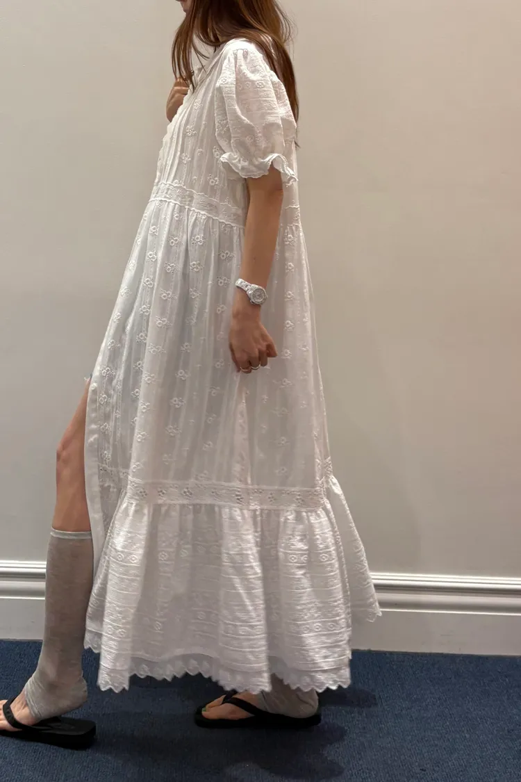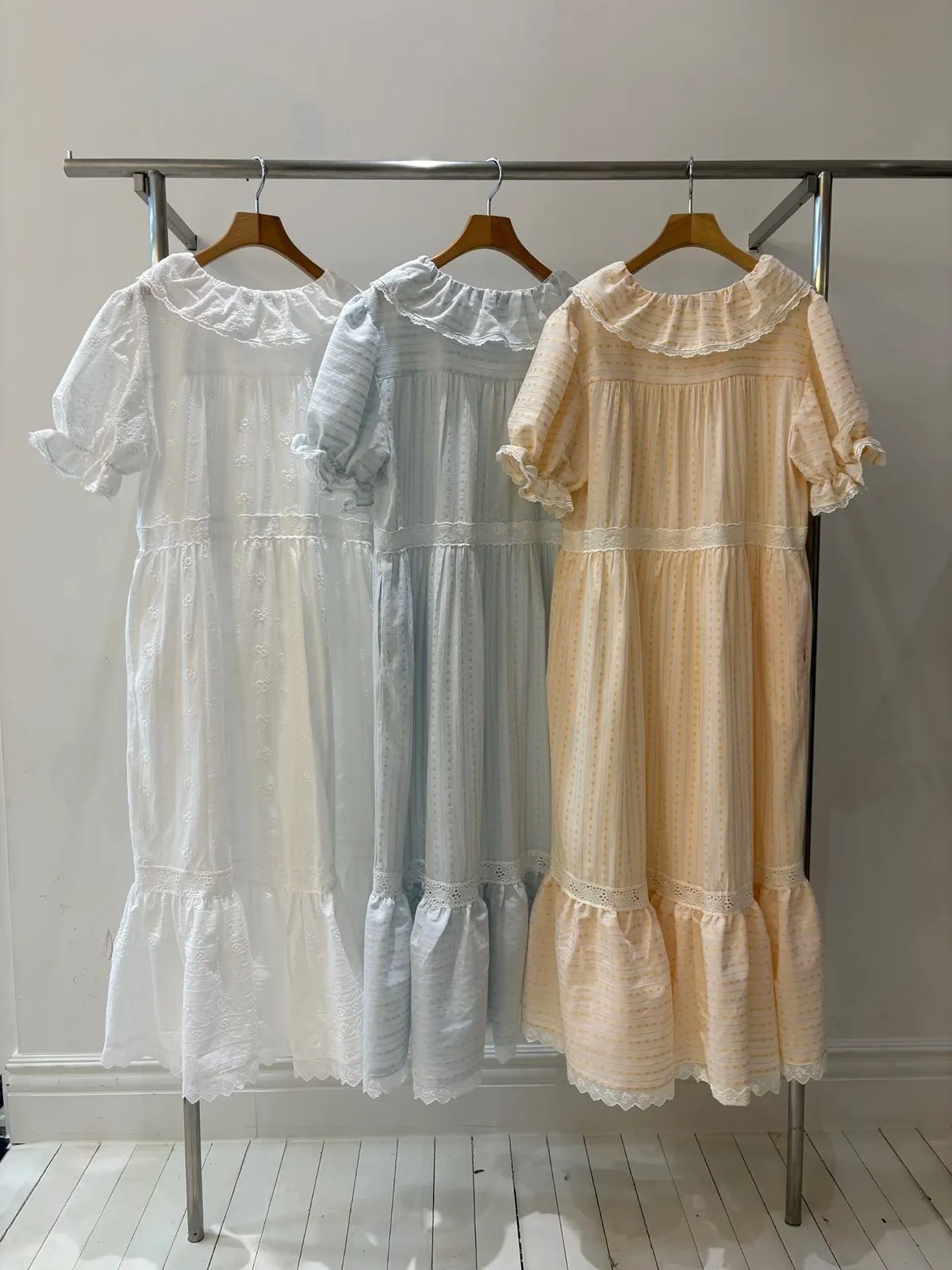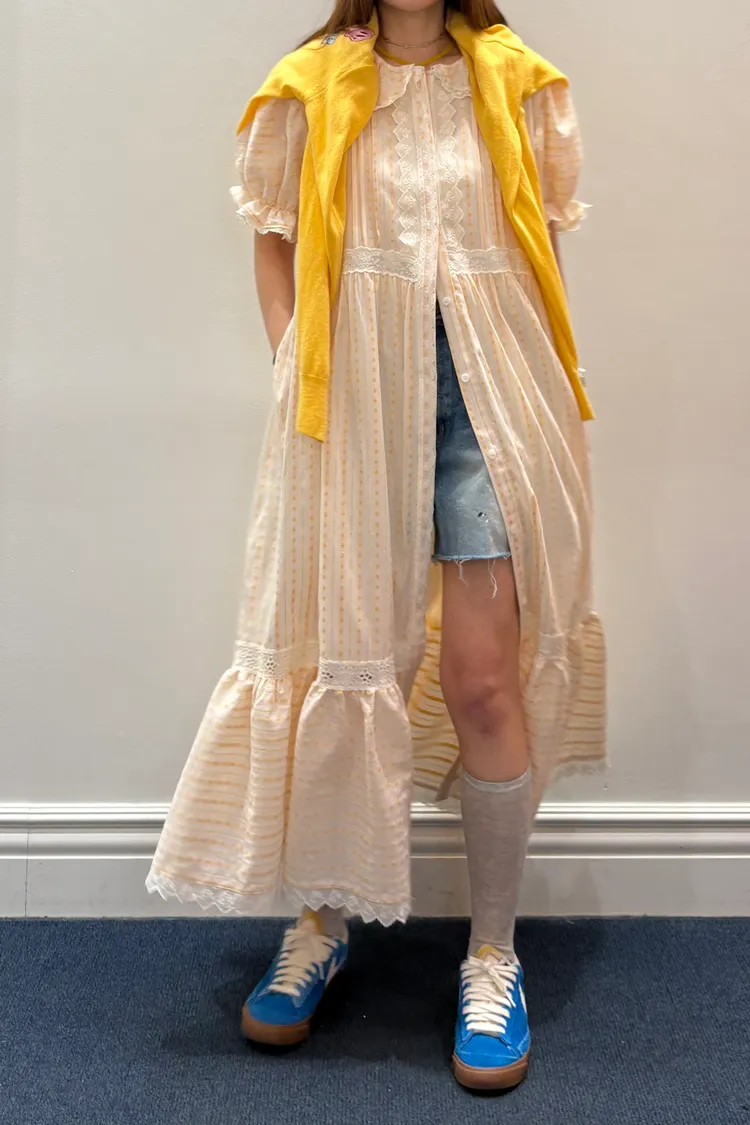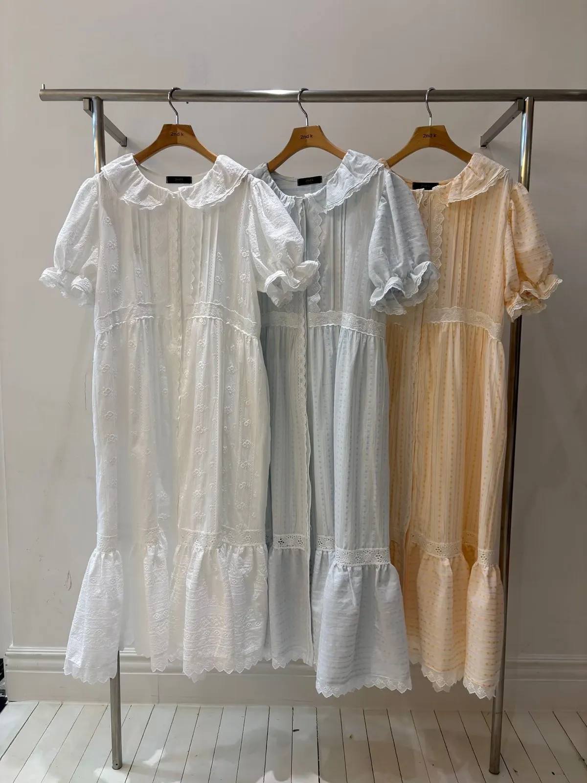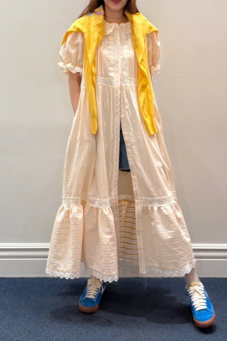 一穿上就是滿滿初戀感♡ 棉料材質,娃娃領排扣寬鬆版型,S-L妞都可以穿,清新又舒服 白色款是布蕾絲面料,藍色、橘黃是小花花棉料材質 領口、袖口、腰間、裙擺都有拼接刺繡蕾絲織帶,細節精緻又溫柔 有內襯、有口袋 全扣當洋裝、開釦當罩衫穿都好看 韓國熱銷色是白蕾絲