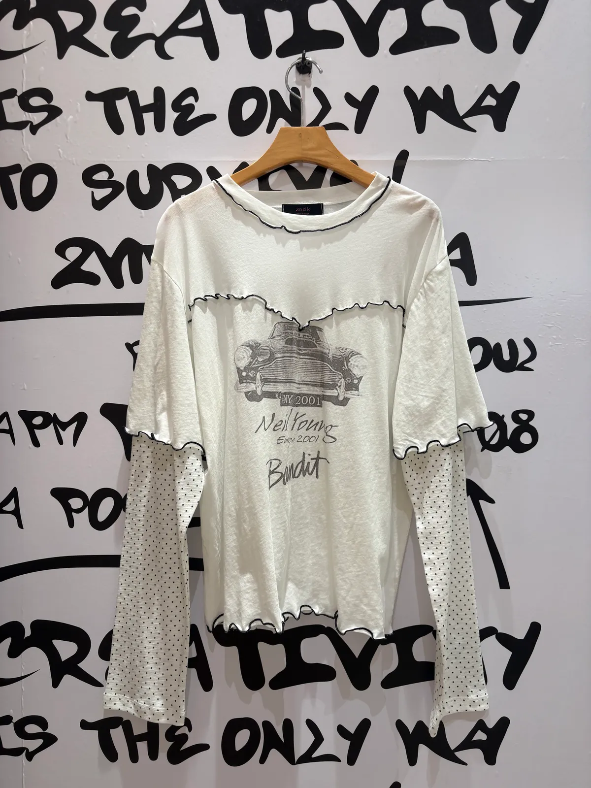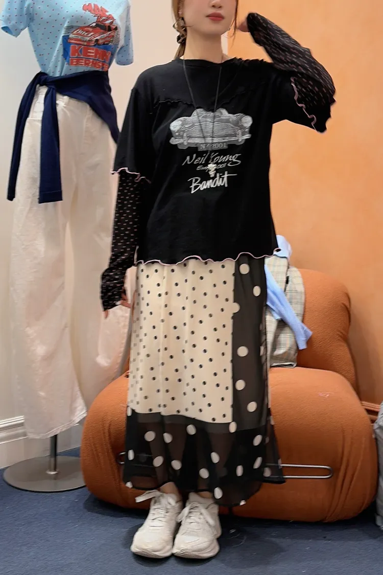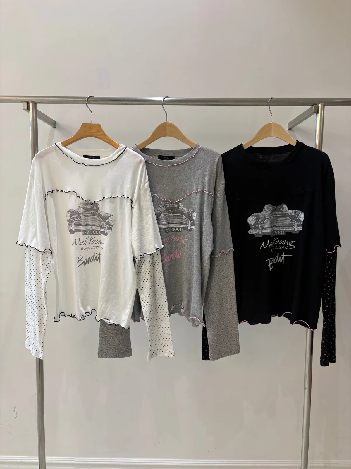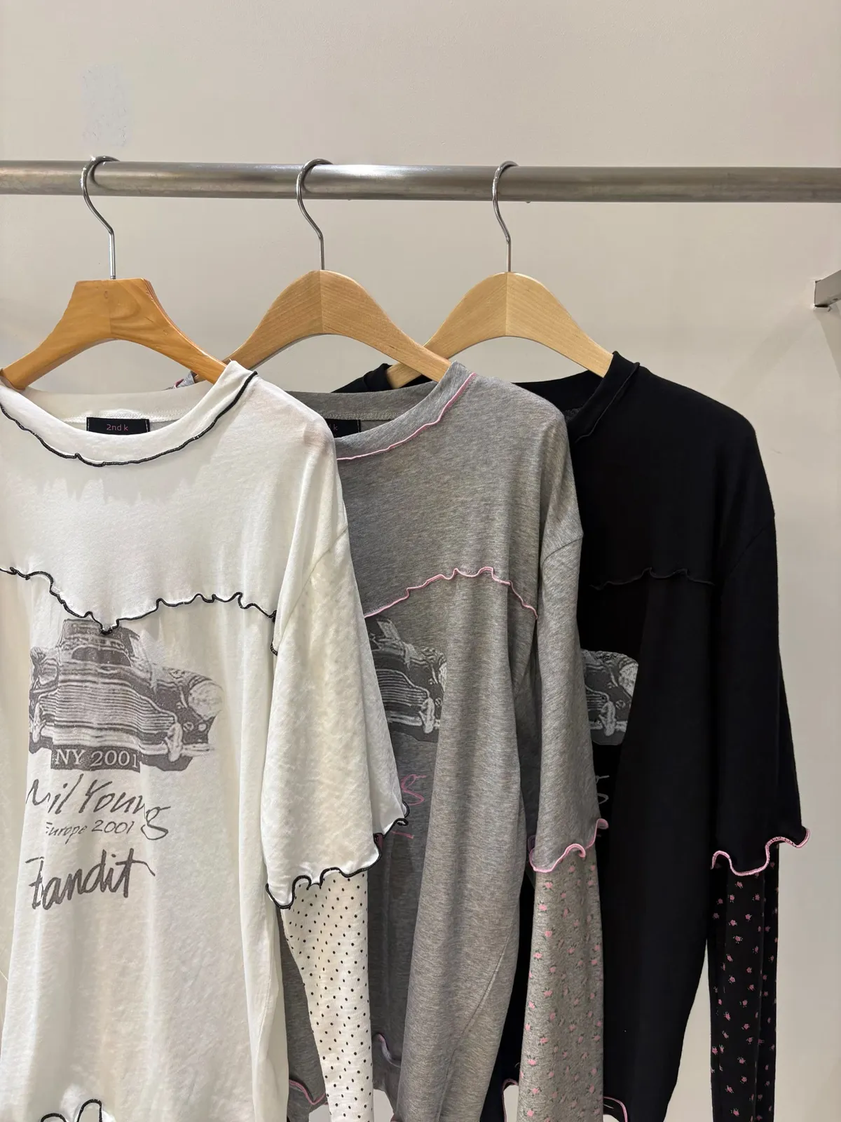 滿滿復古感又帶俏皮細節 非常輕薄的彈力棉料材質,舒適親膚又透氣 胸前印有微褪色的復古車輛與字母印花,隨性又有街頭味 撞色滾邊、手袖假兩件拼接,袖子上還藏著點點或碎花印花細節 低調甜美又有層次感,隨便搭下身就很有造型感,S-L妞都可以穿