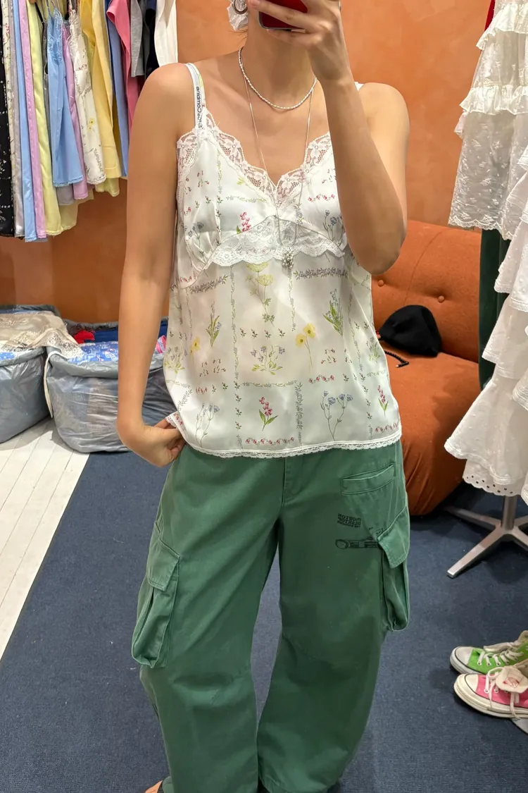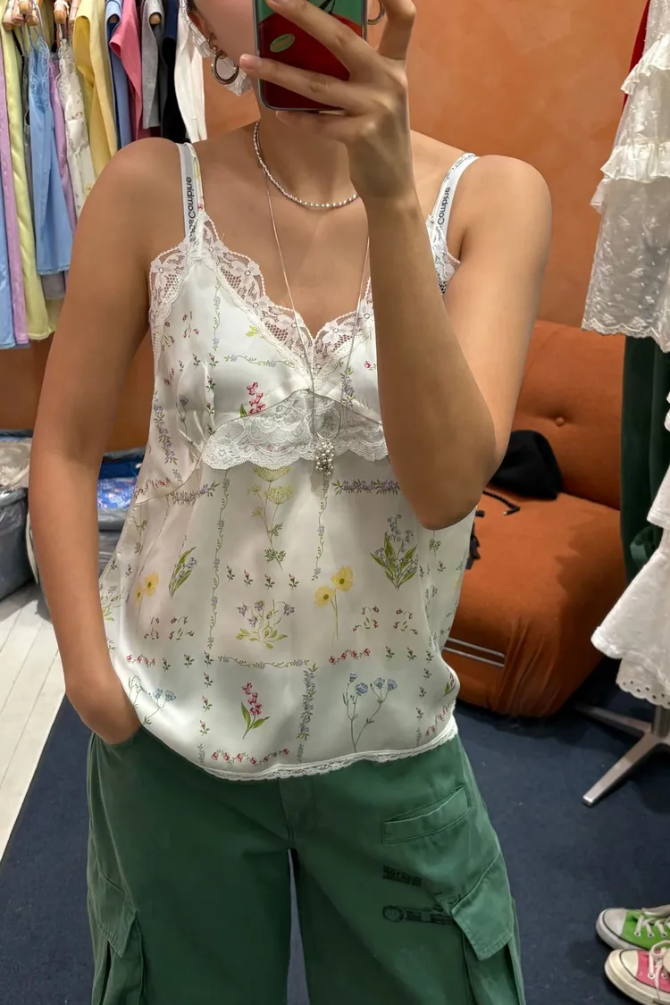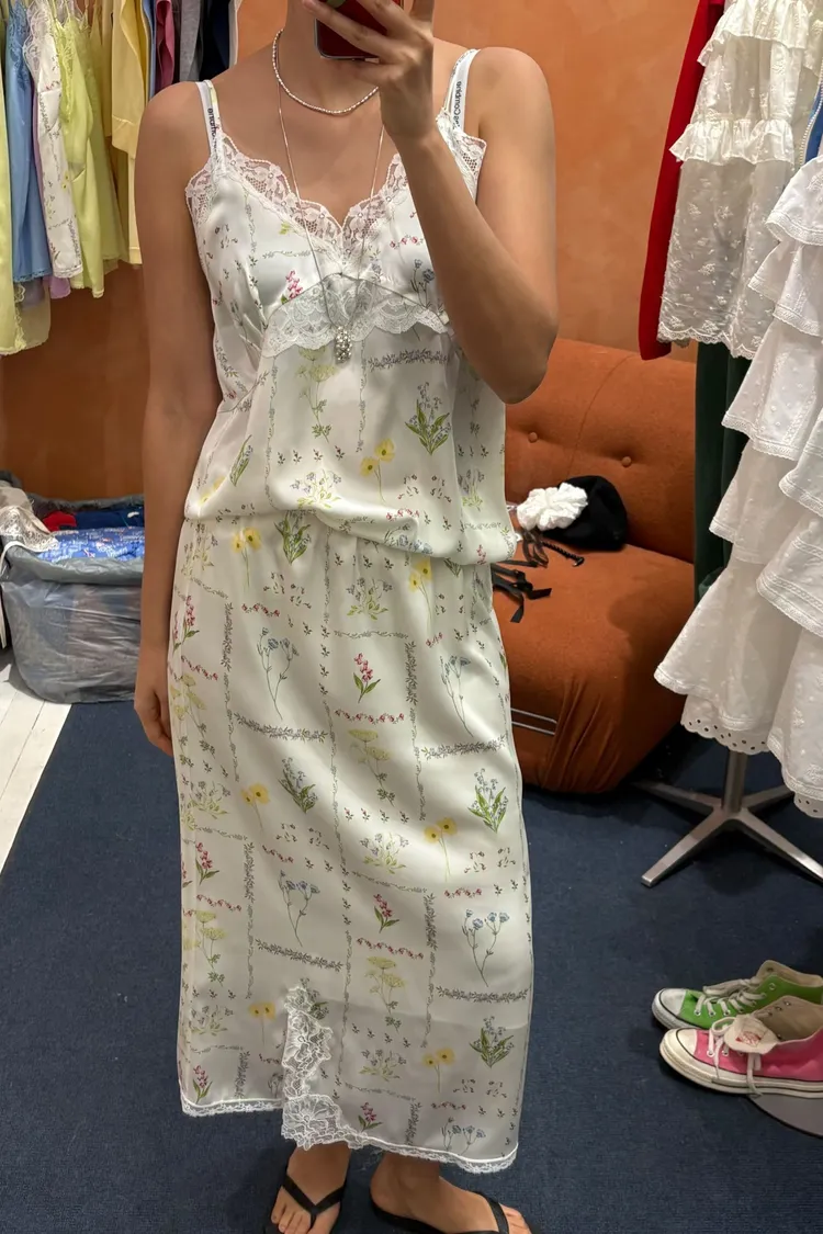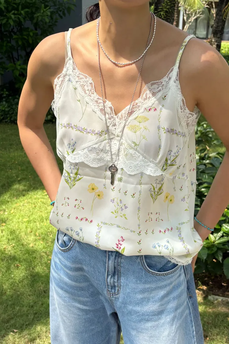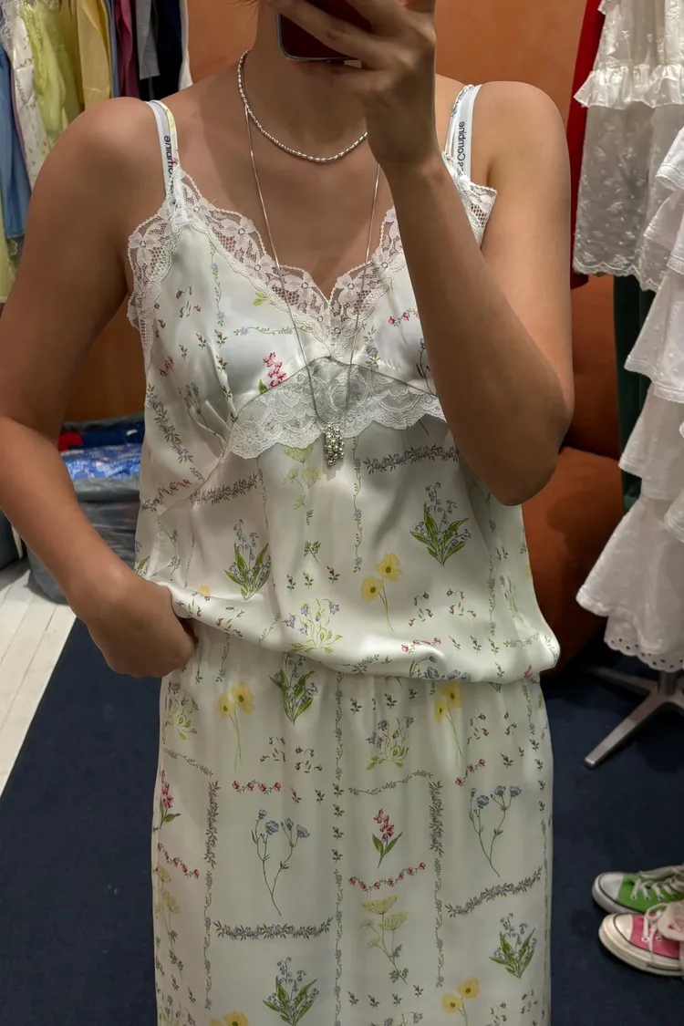 穿上就有滿滿春日浪漫感♡ 滑溜溜絲光印花面料輕盈飄逸,小寬鬆版型,S-L妞都可以穿 精緻碎花排列成格紋圖案,搭配拼接蕾絲裝飾,細節感甜美又高級 肩帶可調、可以和MRB07長裙搭配成套 相同版型,MRT12是純色款可一併參考