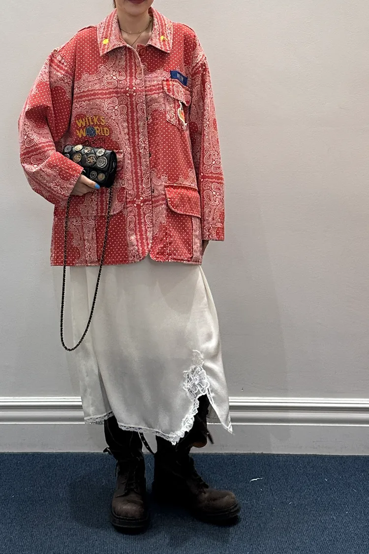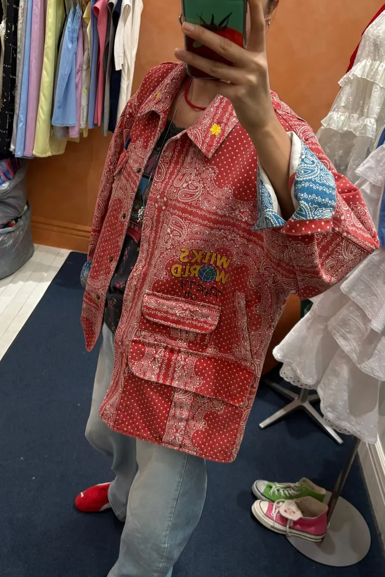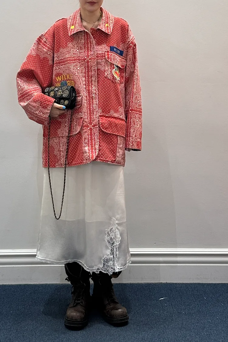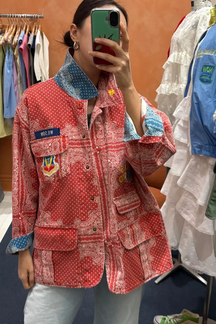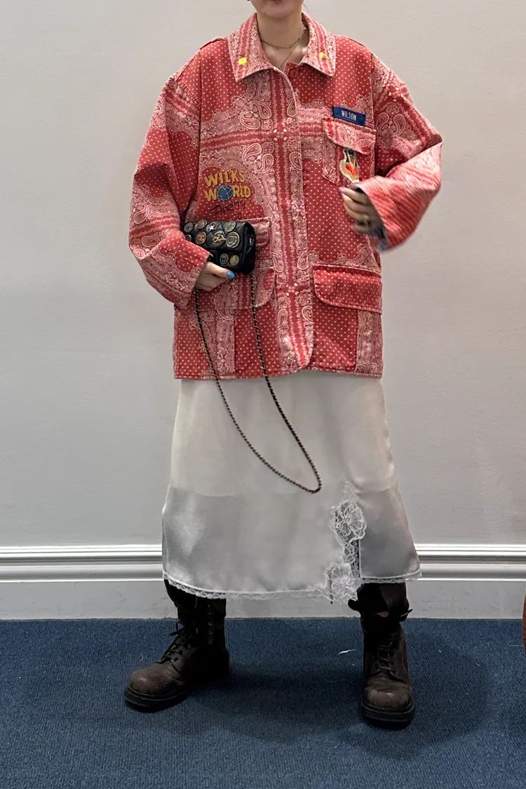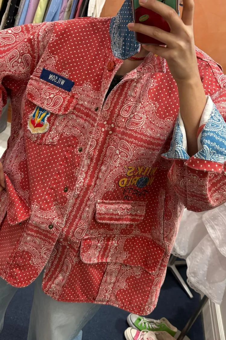 袖口、領口都有撞色的佩斯利印花拼布,細節感滿滿