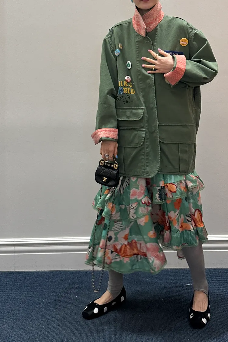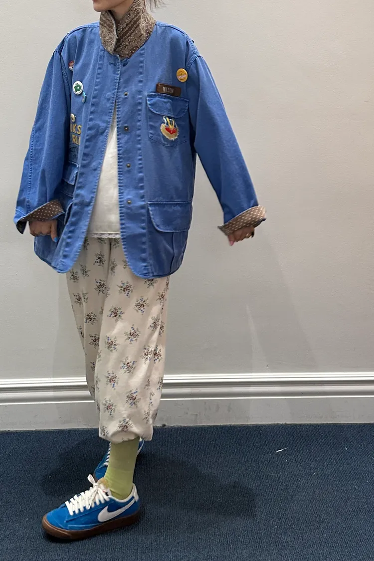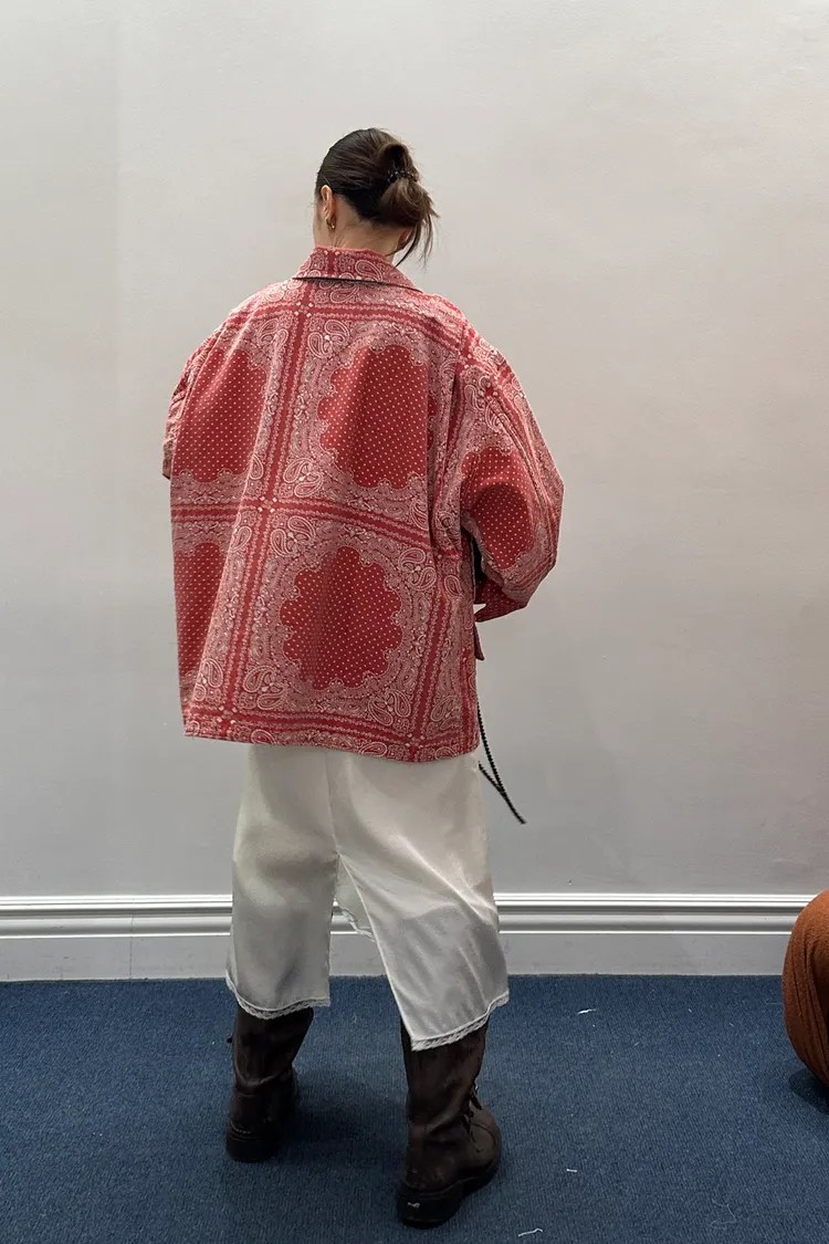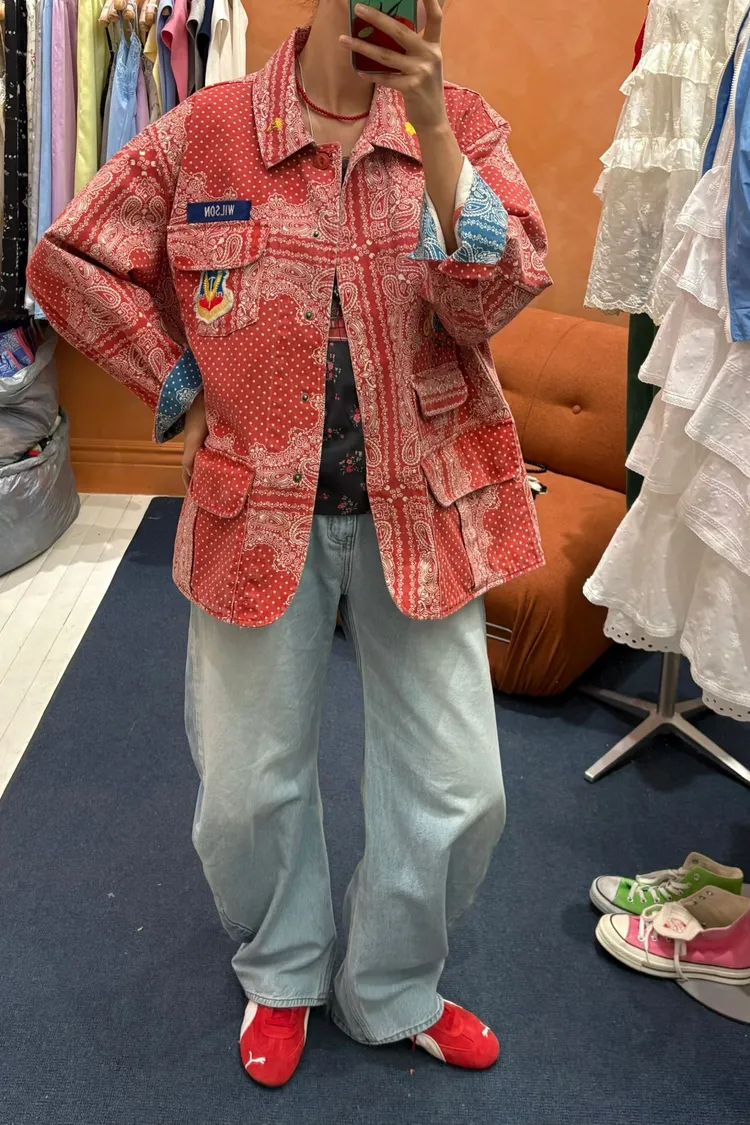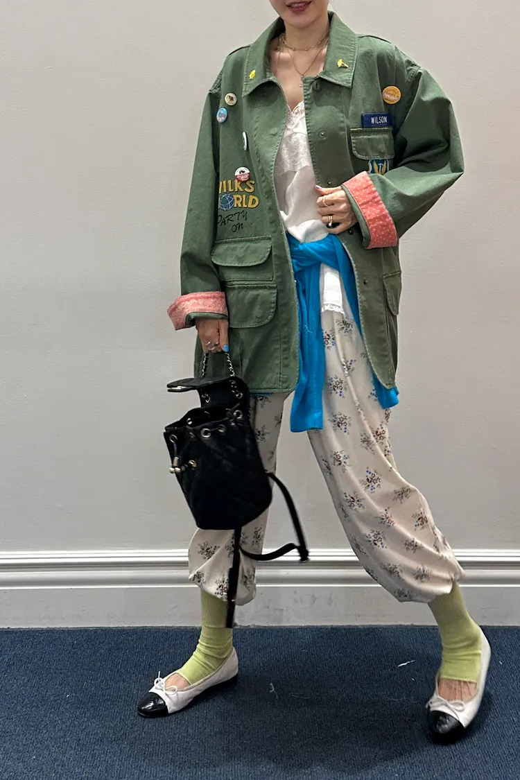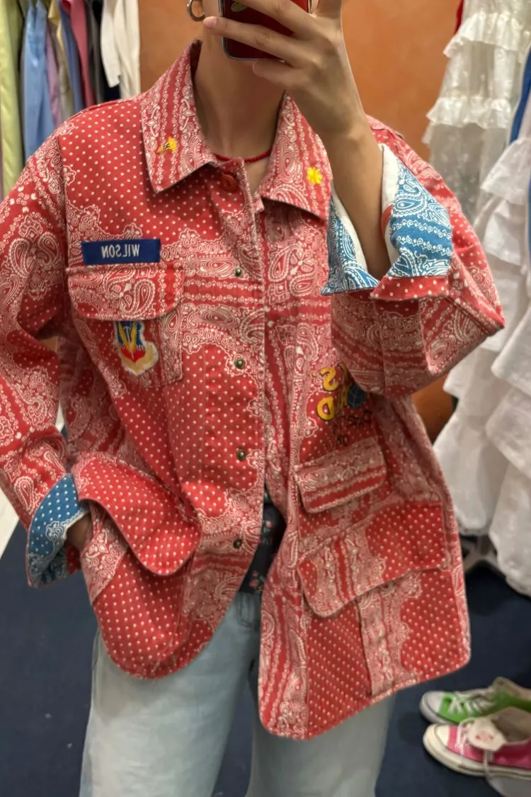 袖口、領口都有撞色的佩斯利印花拼布,細節感滿滿