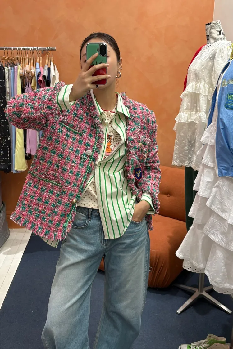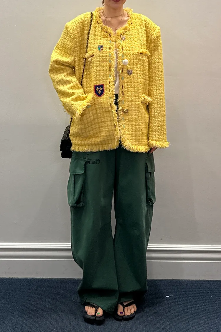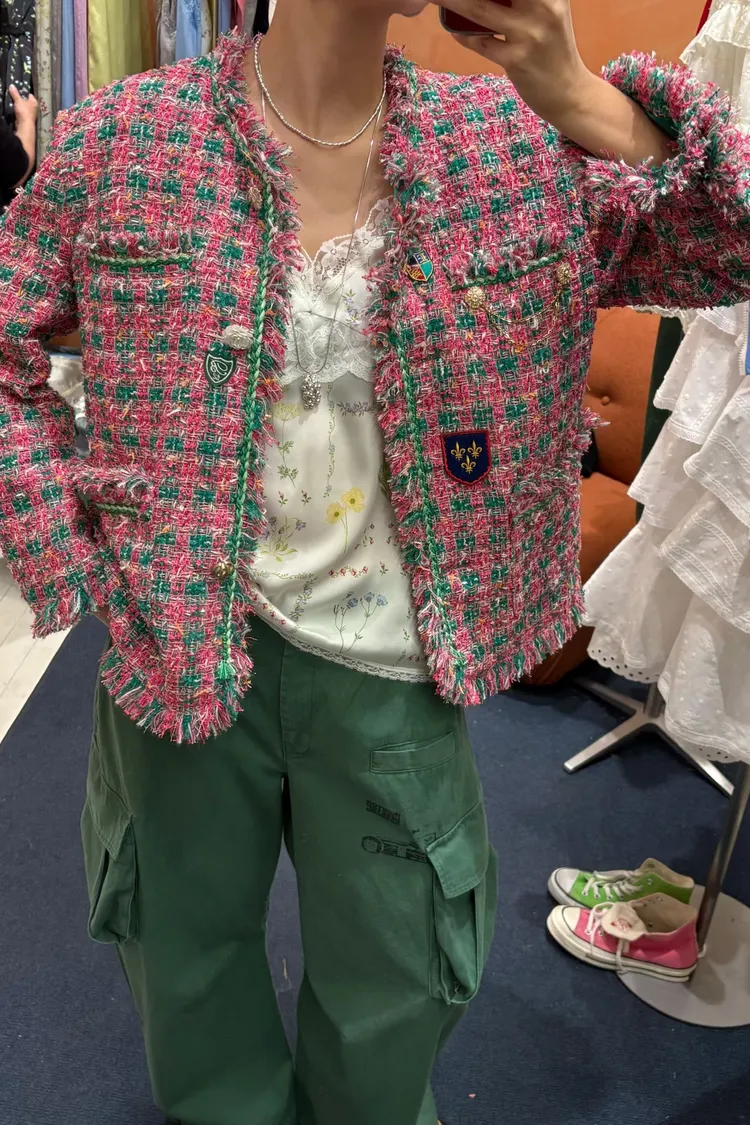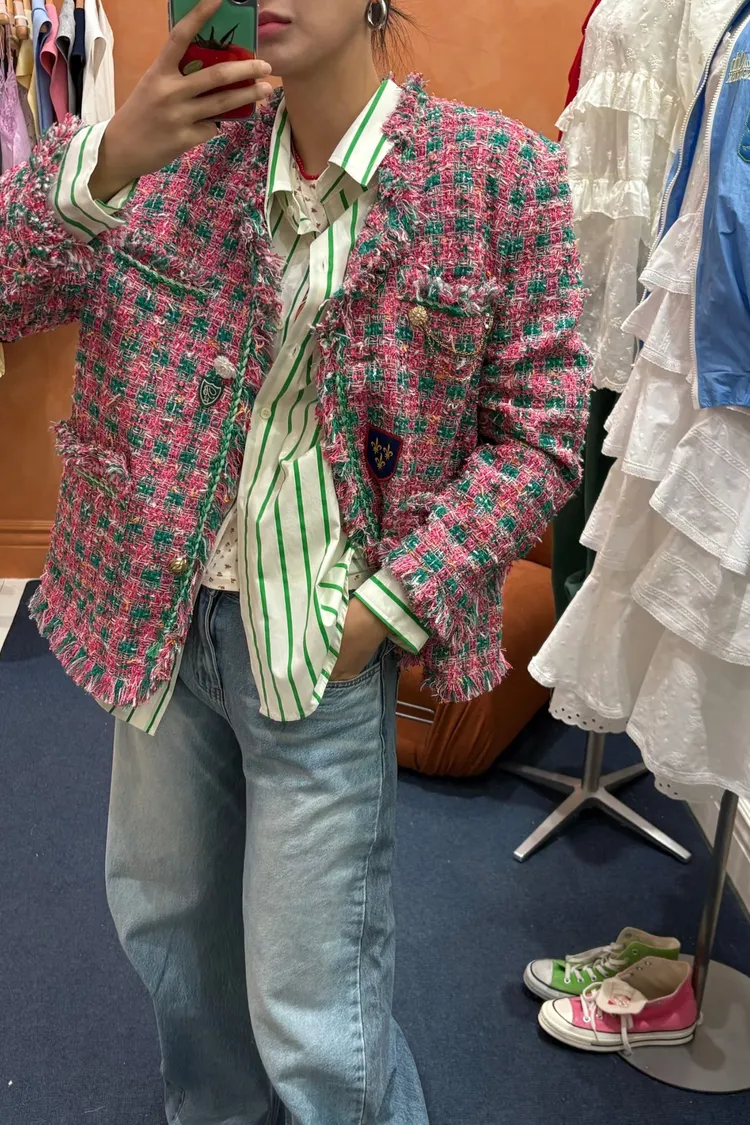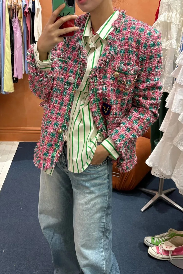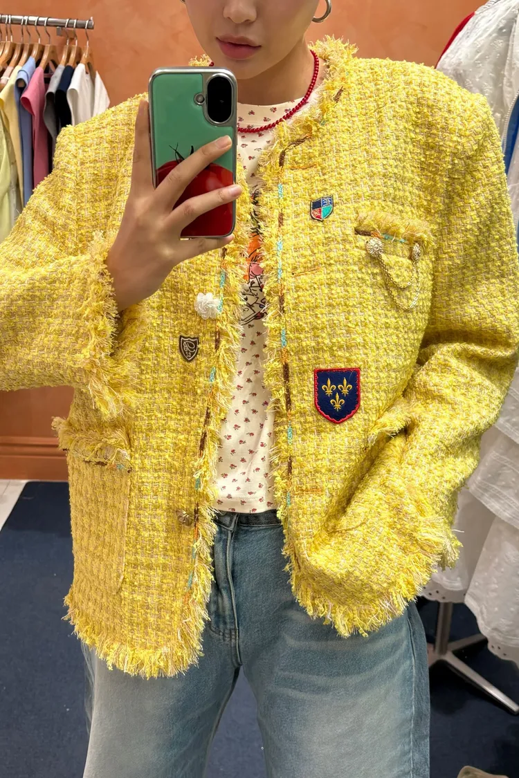 一上身就自帶精品濾鏡♡ 精品質感小香花呢編織面料質感細緻有層次、面料不厚重! 尤其編織配色都是歐膩親自挑選後製作,獨特又耐看 寬鬆版型,S-XL妞都可以穿,隨意披上就有那種慵懶高級感 不只花呢面料精緻,內襯也完全不遜色! 精品絲巾才會有的圖紋和絲滑手感~巨美 立體花扣搭配金釦裝飾,細節閃耀卻不浮誇 再加上刺繡布章點綴,甜中帶點率性、有口袋