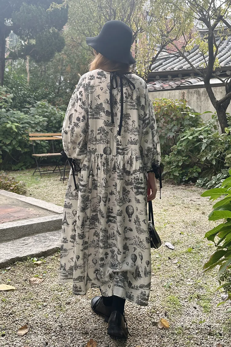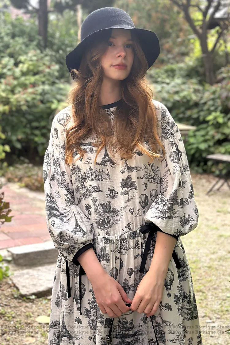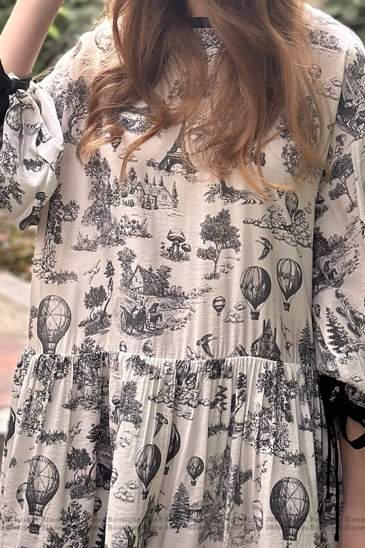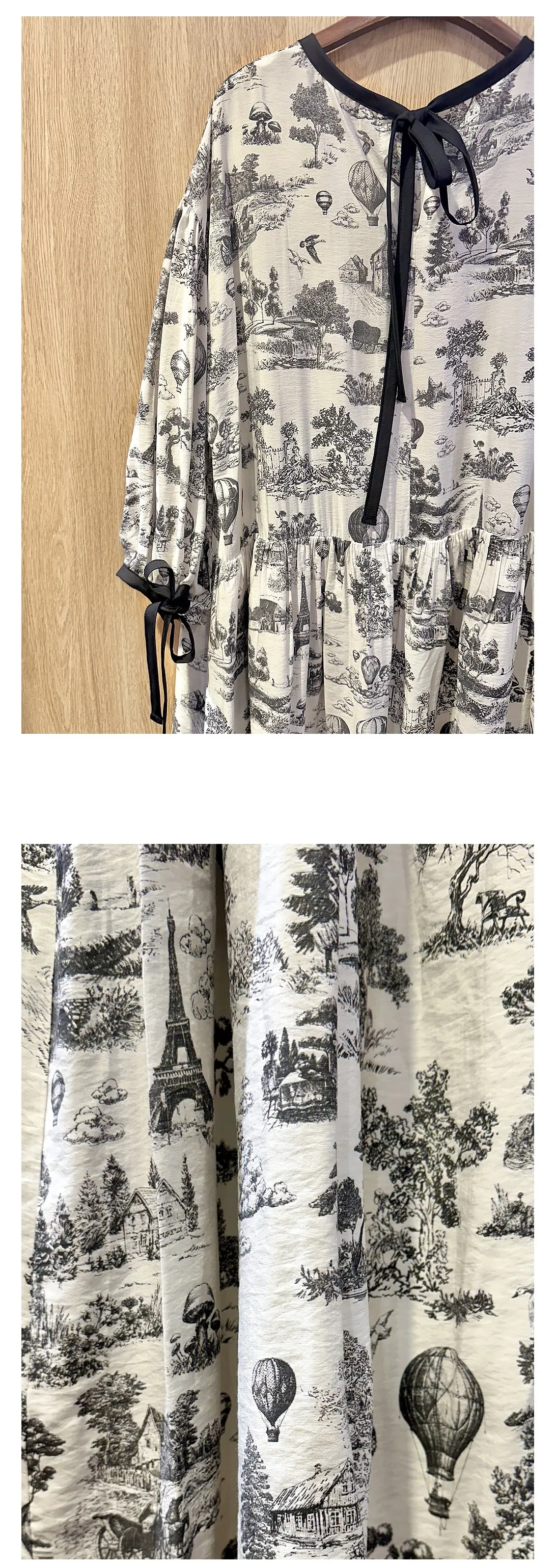 輕盈天絲混紡面料,寬鬆傘狀裙襬自然飄逸,S-XL妞都可以穿 領口與袖口的緞帶可綁蝴蝶結,增添俏皮細節 印花如鐵塔、熱氣球、森林與鄉村的夢幻版畫,穿上就像展開一場浪漫小旅行♡ 七分手袖浪漫甜美、有內襯、有口袋