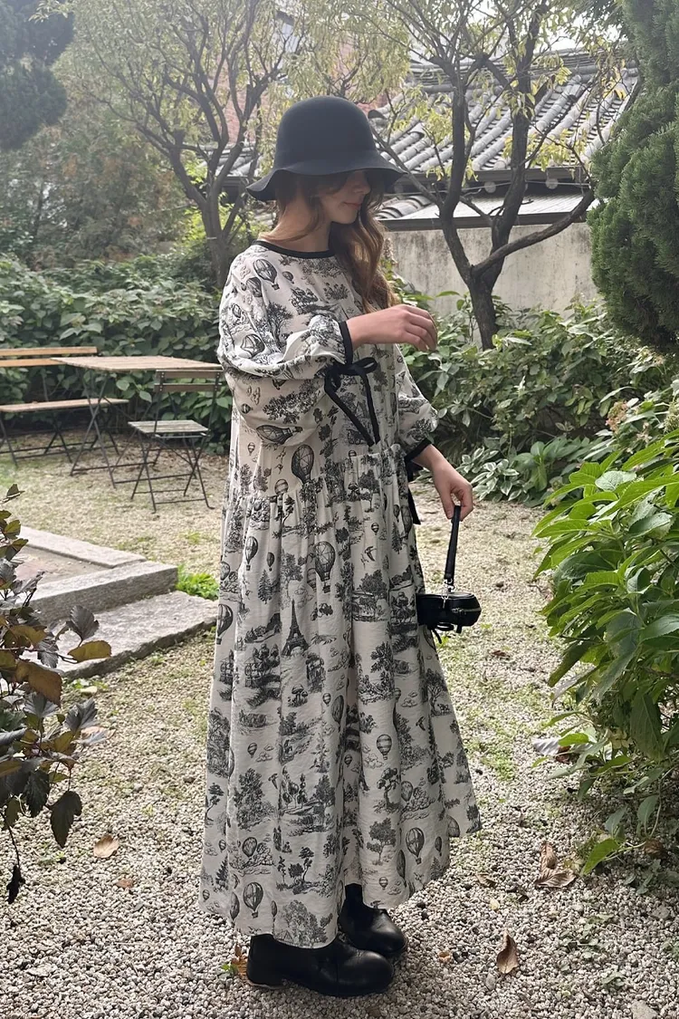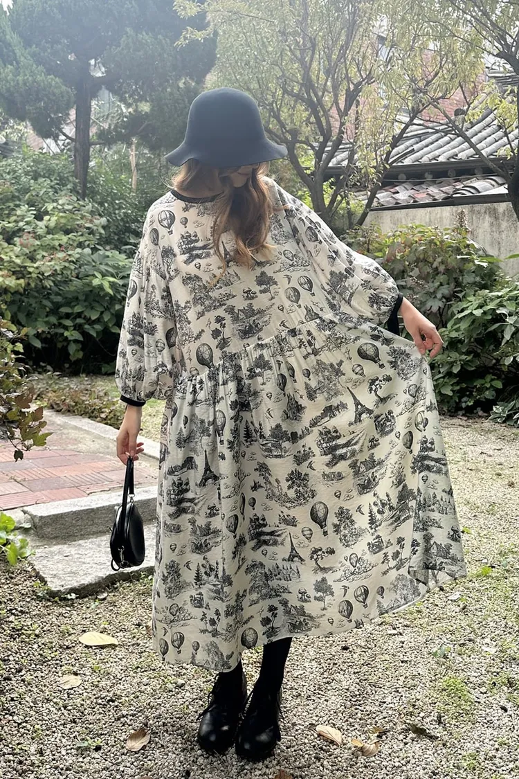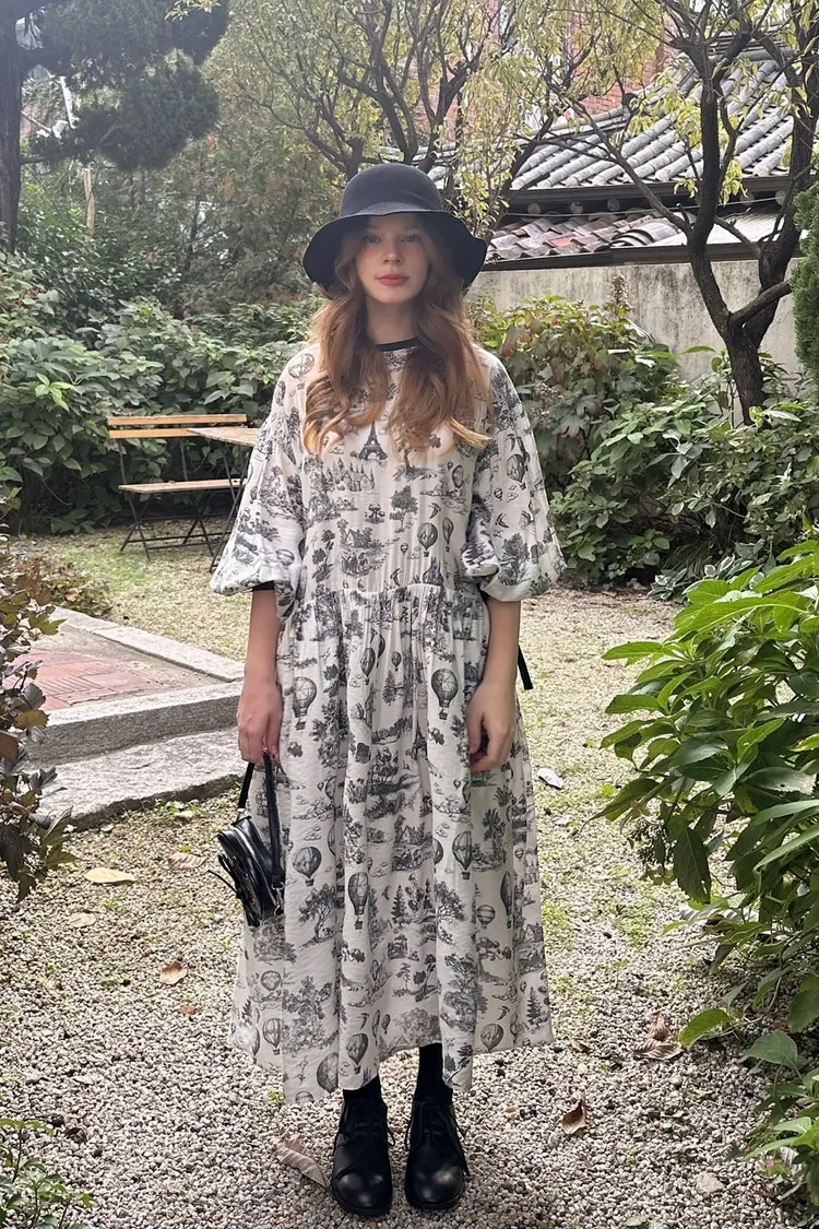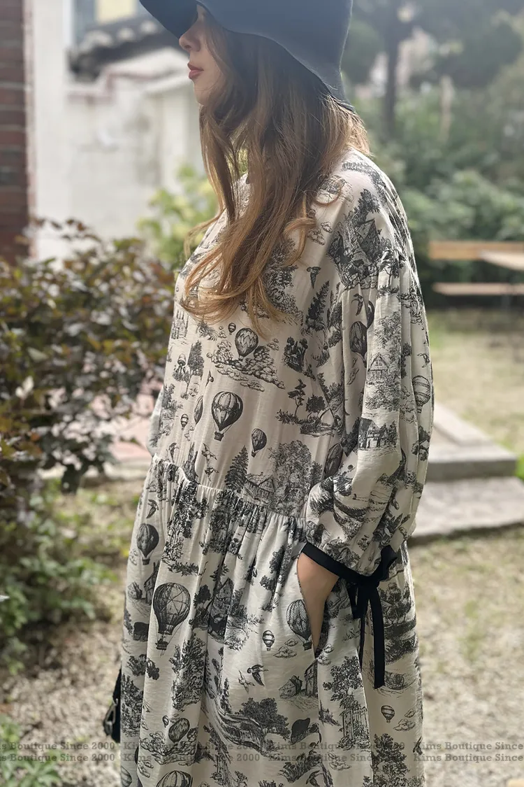 輕盈天絲混紡面料,寬鬆傘狀裙襬自然飄逸,S-XL妞都可以穿 領口與袖口的緞帶可綁蝴蝶結,增添俏皮細節 印花如鐵塔、熱氣球、森林與鄉村的夢幻版畫,穿上就像展開一場浪漫小旅行♡ 七分手袖浪漫甜美、有內襯、有口袋