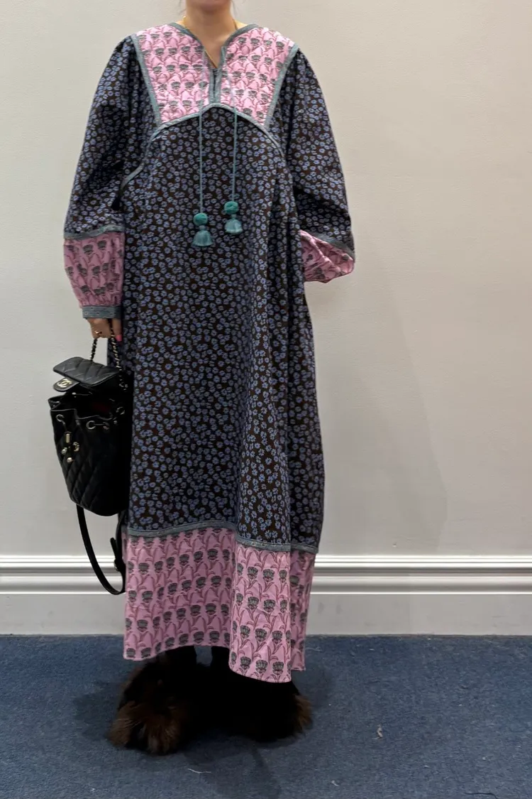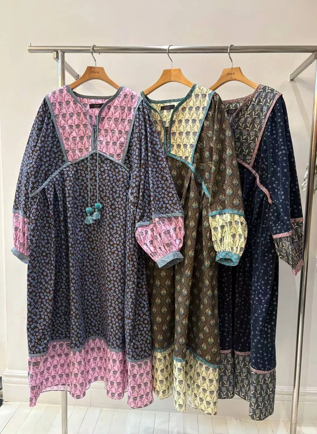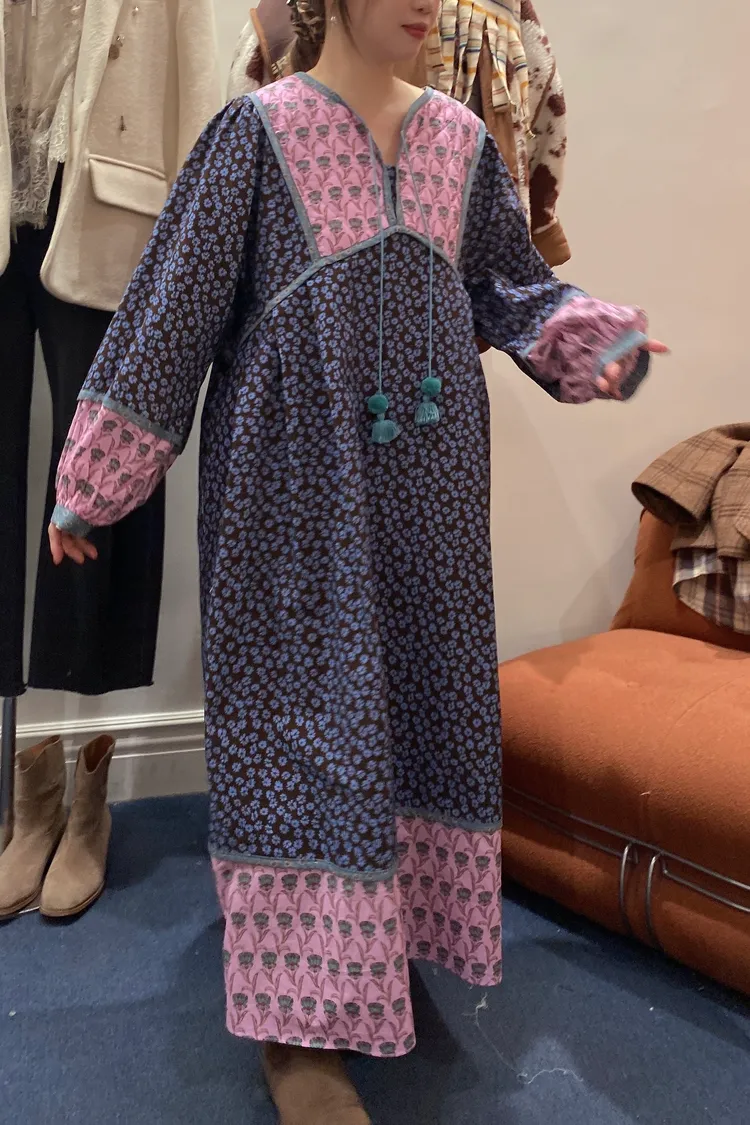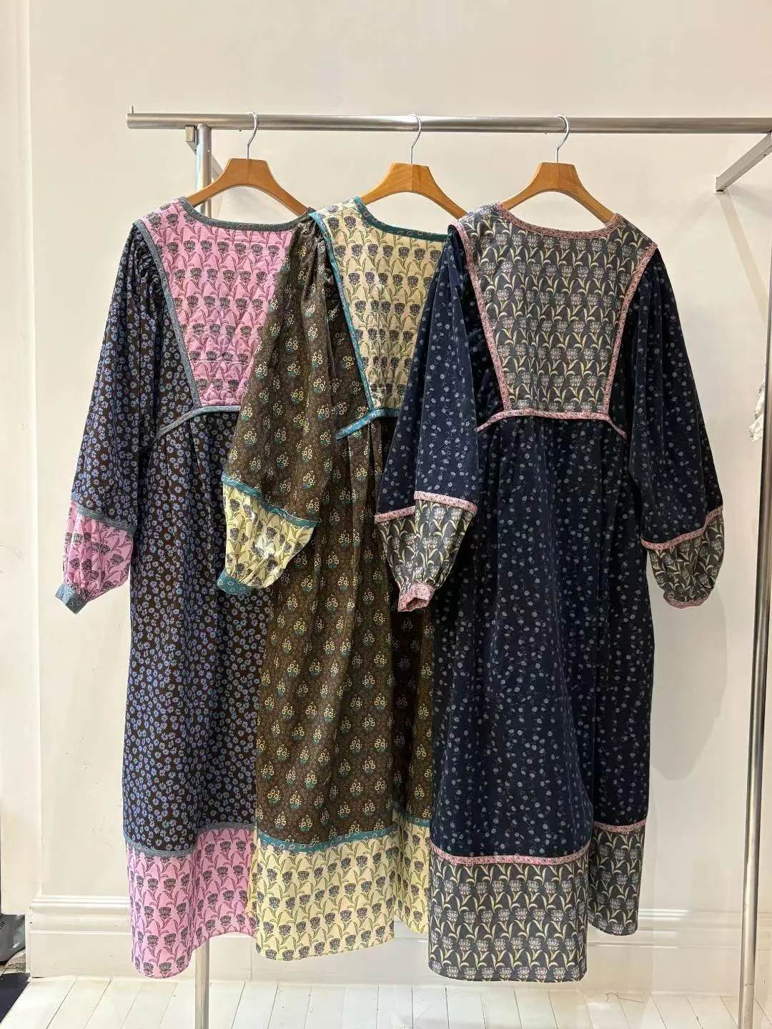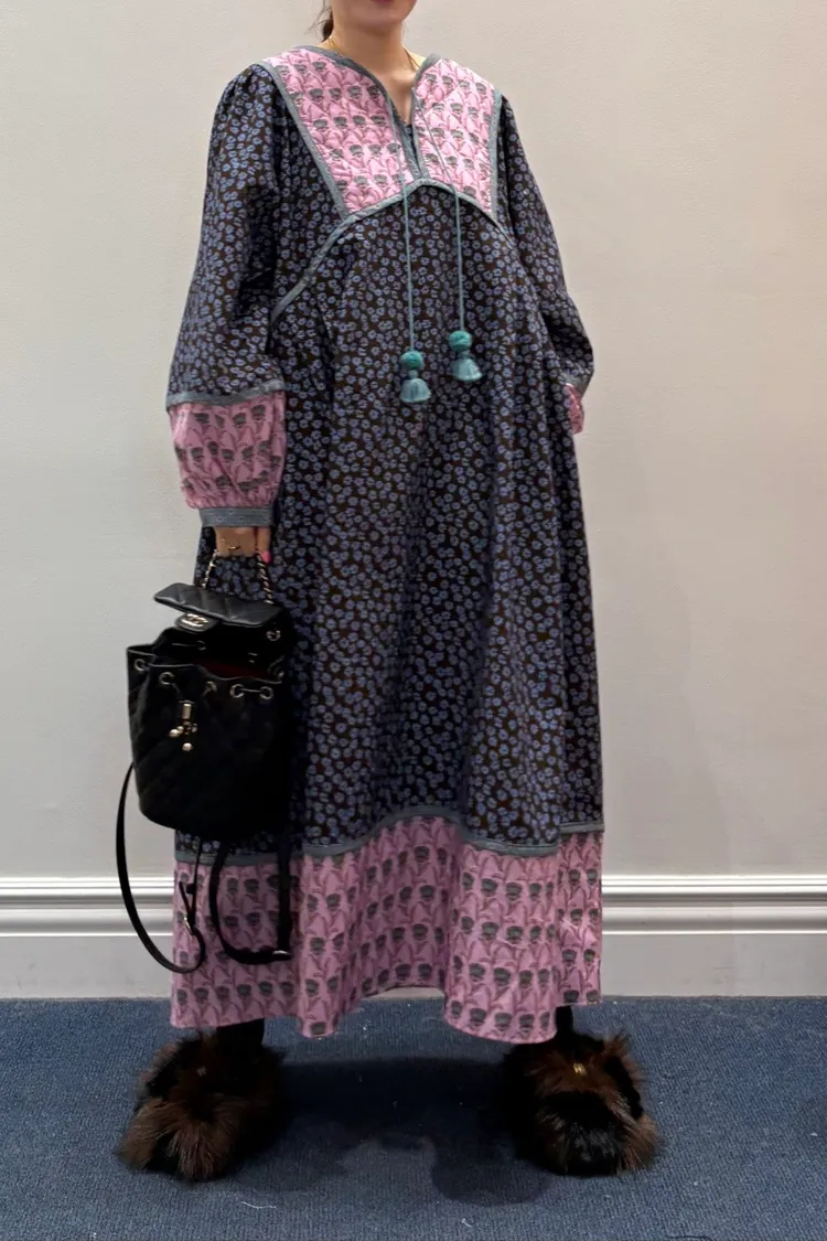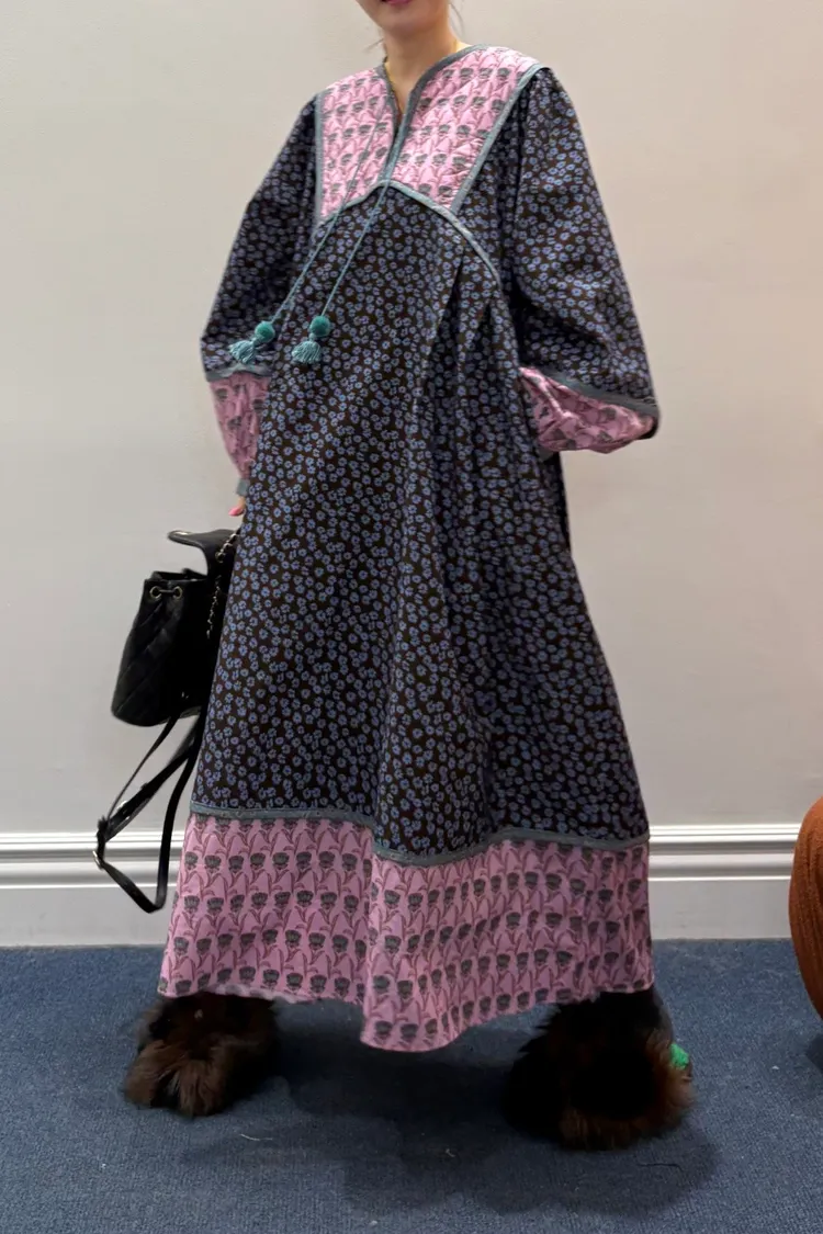 不同碎花布料拼接成獨特藝術氛圍 領口、手袖、裙擺都做了撞色滾邊點綴,細節超級加分 棉料材質、胸前拼接部分有鋪棉,暖度UP 背殺家拿手的撞色拼接設計款 寬鬆傘狀裙襬,S-XL妞都可以穿 領口繫帶除了流蘇還有蓬蓬的小毛球~ 有口袋、有內襯 走在街上像走進一幅小畫作,溫柔又充滿故事感